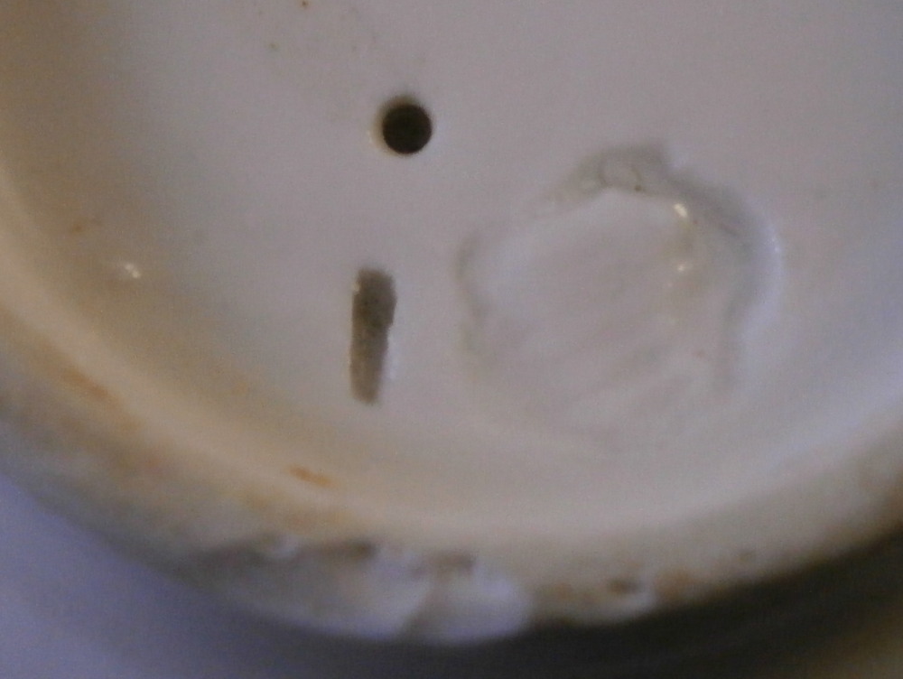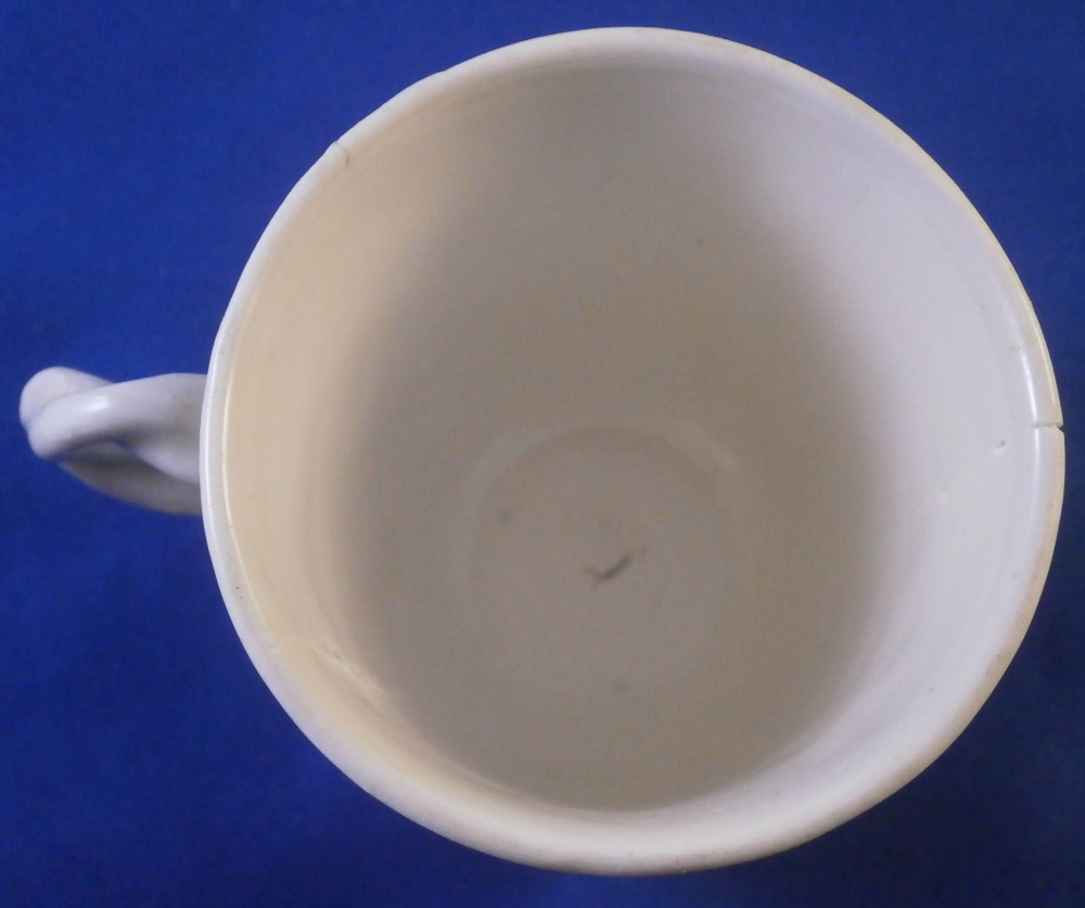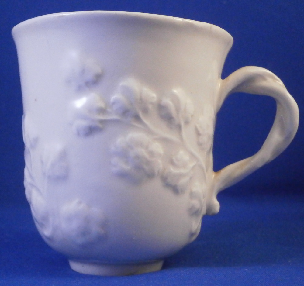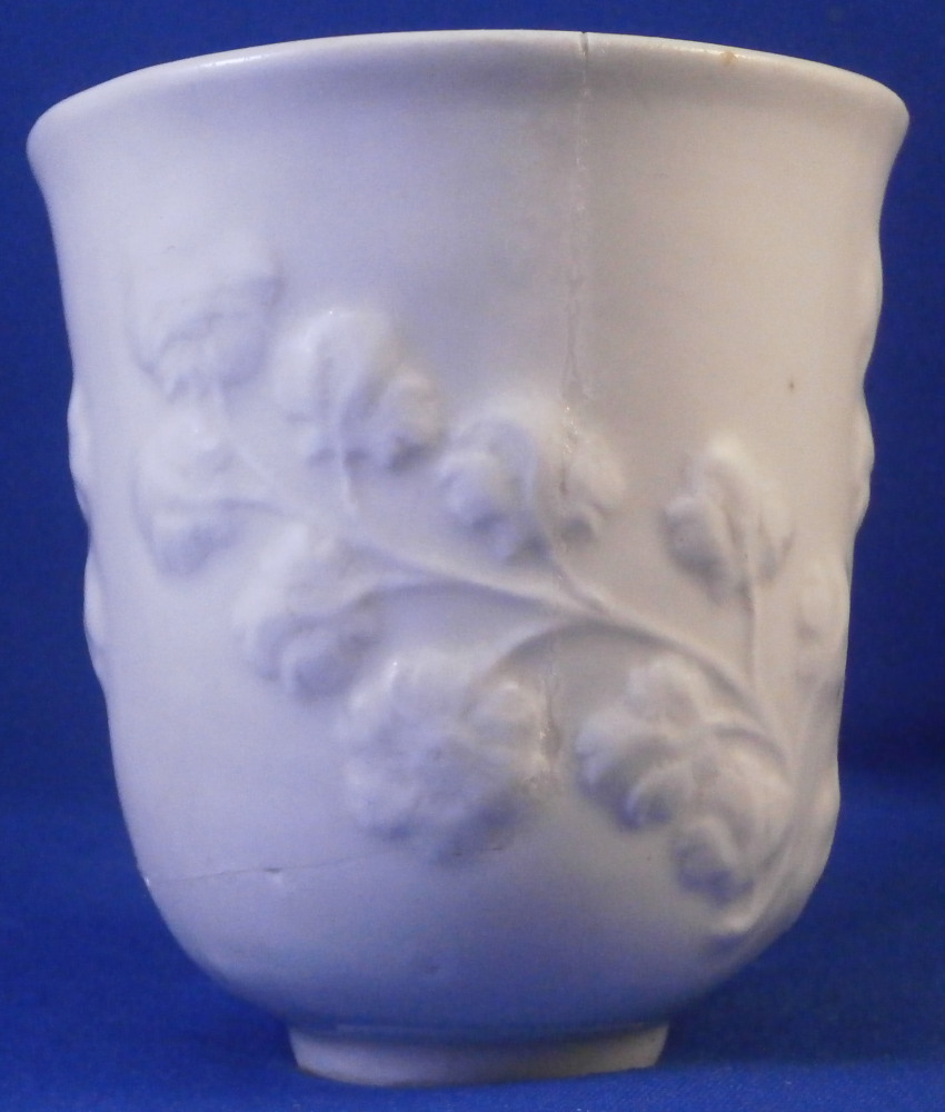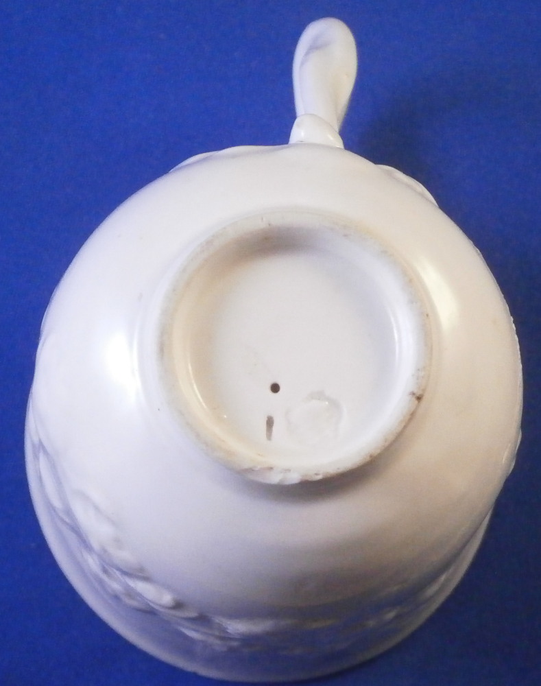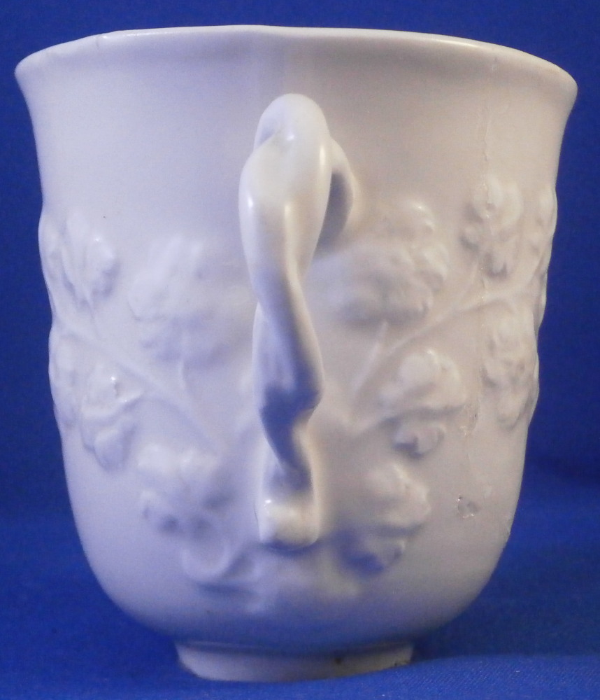 This is a cup made by Nymphenburg in the 18th century. It is decorated with a relief grape leaf design to the outside which is pretty nice and something I have not seen often by them. Nice twisted branch handle to the cup. The udnerside is marked with the impressed shield mark as well as an impressed mark right next to it and a tiny hole as shown. The cup displays nicely but has had a large U shaped chunk broken out of it and reglued which I tried to show in the pictures. The cup is 2.875 inches tall and 2.625 inches in diameter. Please email me for more information or other pictures.