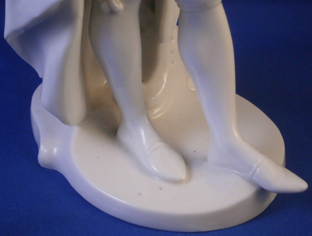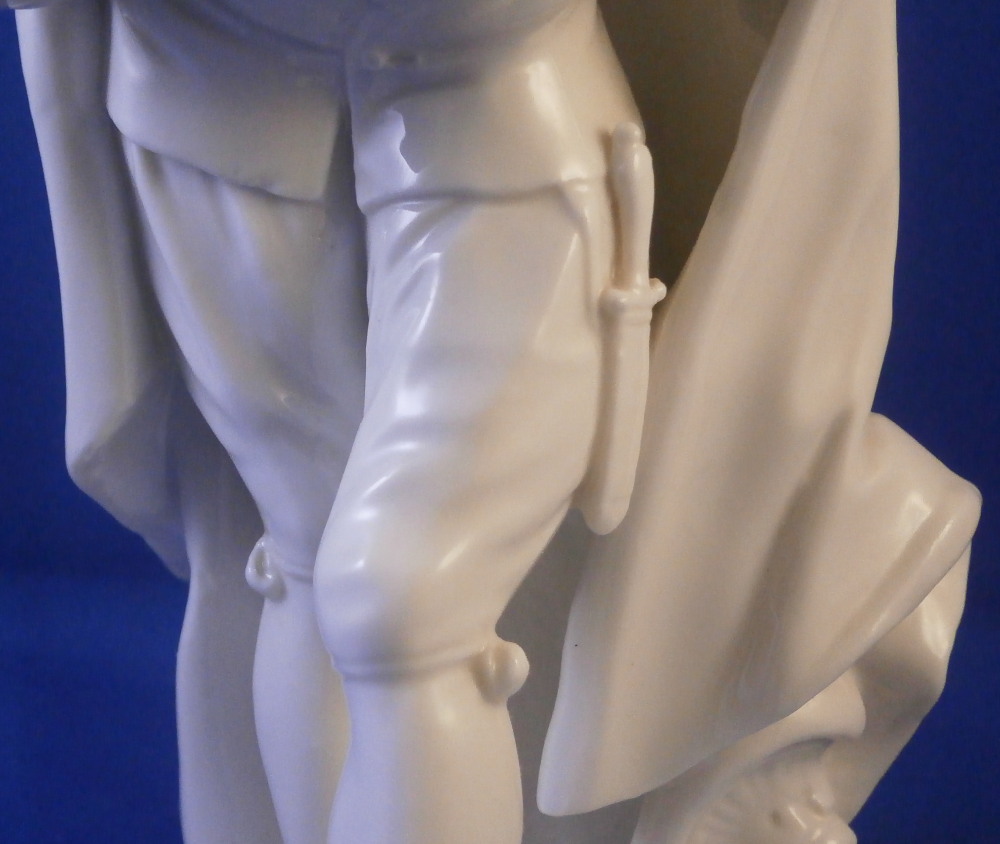 This is a superb figurine from the Commedia dell'arte aka the Italian Comedy made by Nymphenburg in the early 20th century. This figure is of Pantalone ( Pantaloon ) and is one of the most important principal characters found in commedia dell'arte. With his exceptional greed and high in society he is the "money" in the commedia world. His full name, including family name, is Pantalon de' Bisognosi , Italian for 'Pantalone of the Needy'. The figurine is superbly modeled and left in the white to show off all that nice detail. First designed by the best porcelain modeler of the 18th century - the famous Franz Anton Bustelli - it is just one elegant and fun piece to look at. The figure is 7 inches tall, 2.5 inches wide and 4.375 inches deep. The piece is marked with the impressed shield mark underneath and incised numbers 57 over II. I think this is one of the early redos after the molds got destroyed. The figurine is in great condition with a few tiny black spots and the tip of his hat feels rough so there must be the tiniest of nibbles. He displays perfectly! Please email me for more information or other pictures.