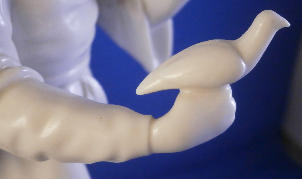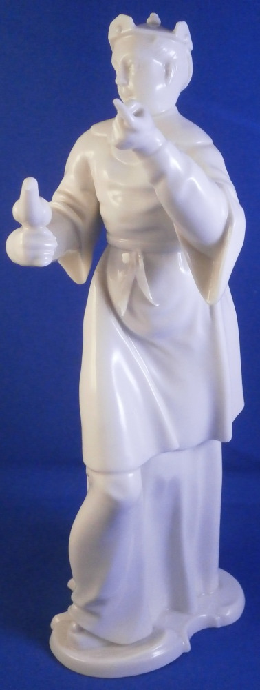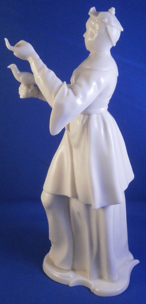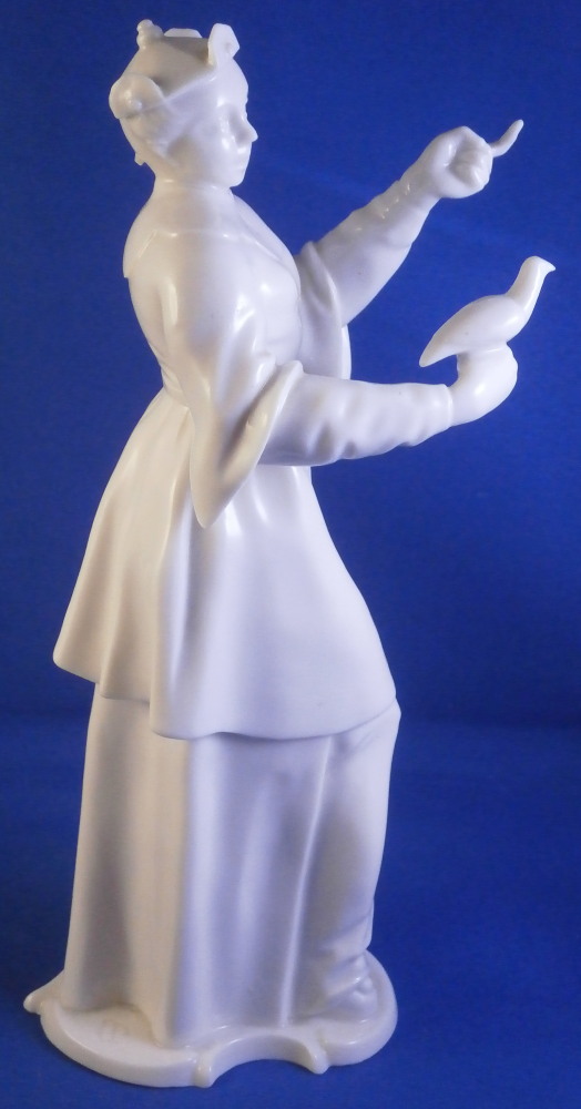 This is a figurine of a Chinese lady made by Nymphenburg in the 20th century. The figure comes from a series of 17 or 18 figurines I think - this being one of the harder to find pieces and number 13 of the series for me. Originally it was off course modelled by Bustelli in the 18th century. This is the blanc de chine version but this also comes in a painted version though one rarely ever sees those. I own a few figures from this seriesand they are probably my favorite figures besides the commedia dell'Arte, off course. The figurine is of a noble lady or priestess (not sure) dressed in a flowing robe with a fancy hat on her head and a bird sitting on her right hand. The left hand with a finger stretched out as if to lure another bird on that hand. Some nice modeled details to the figurine and the typical base. The figure is 7.25 inches tall, 2.375 inches wide and 3.75 inches deep. She is in great condition with a piece of the strap missing that is holding her hat in place (it is in the back and invisible when on display plus the ends of the belt around her waste are slightly chipped as shown. Not obvious at all when on display. The figurine is marked with the impressed shield mark on top of the base as well as underneath plus the impressed numbers 197 and 7 as shown. Please email me for more information or other pictures.