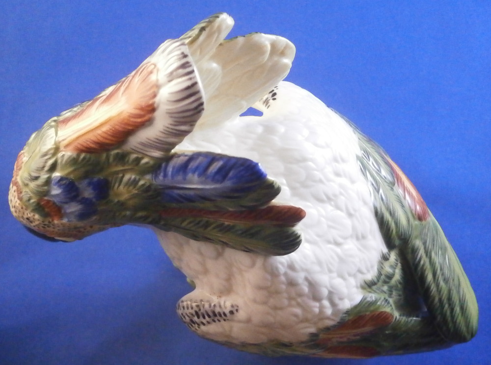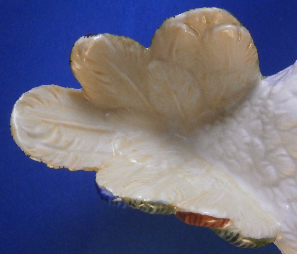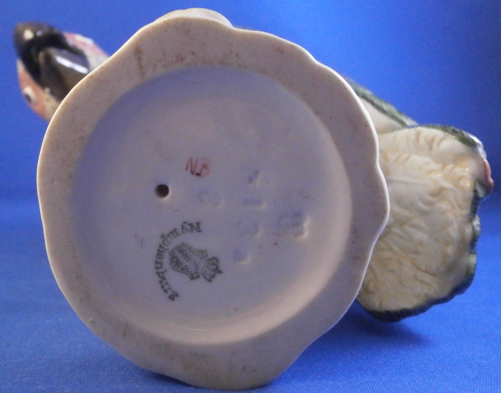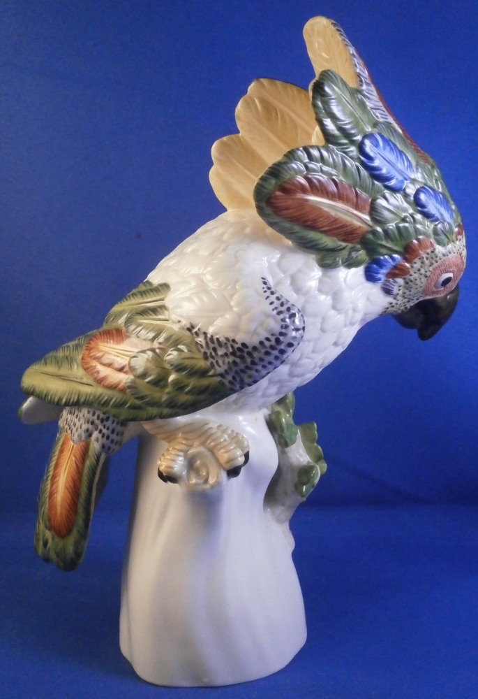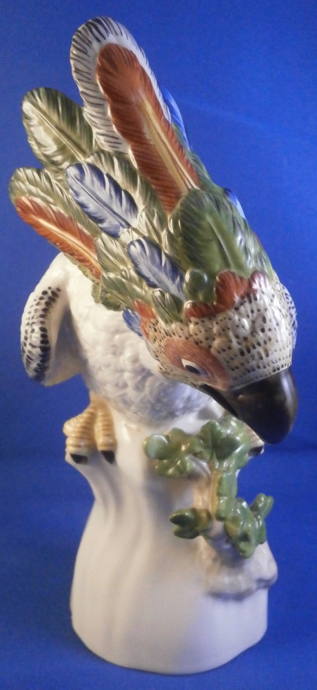 This is a figurine of a cockatoo / parrot bird made by Nymphenburg in the 20th century. It is really nicely modeled sitting on a tree stump with a branch with its leaves coming out the side towards the front and hand painted elegantly with nice colors. This is the version with the wings up against its body but I also have the other version on the site with the wings lifted up a bit if anyone is interested in a rare pair. The figure is super cute. Not a model you see very foten either which is a plus. The colorful plumage of the head feathers and the ends of the wings and tail are stunning! The piece is 7.75 inches tall, 3.25 inches wide and 5.5 inches deep. Marked with the impressed shield mark to the underside as well as numbers 413a and 6 plus the green shield mark with the crown above and Nymphenburg underneath it and the painter's initials NB in red as shown. The figurine is in perfect condition. Please email me for more information or other pictures.