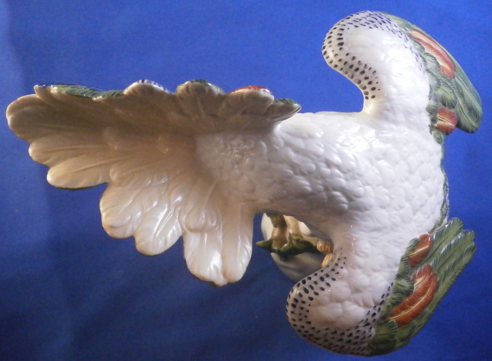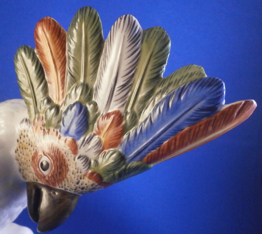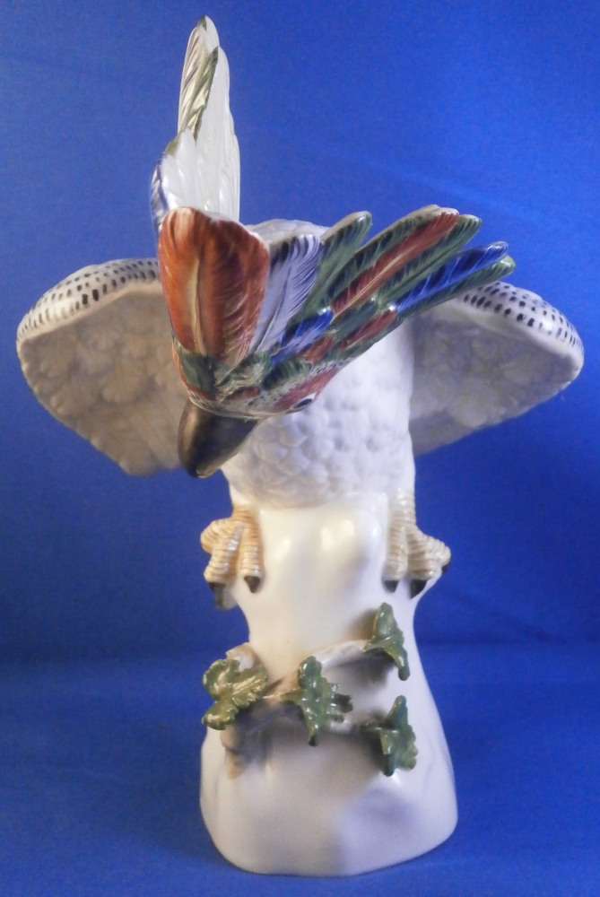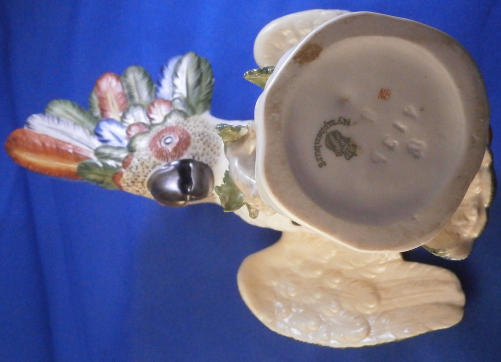 This is a figurine of a cockatoo / parrot bird made by Nymphenburg in the 20th century. It is really nicely modeled sitting on a tree stump with a branch with its leaves coming out the front and hand painted elegantly with nice colors. This is the version with the wings up a bit but I also have the other version on the site with the wings against the body if anyone is interested in a rare pair. The figure is super cute. Not a model you see very often either which is a plus. The colorful plumage of the head feathers and the ends of the wings and tail are stunning! The piece is 7.5 inches tall, 5.375 inches wide and 7 inches deep. Marked with the impressed shield mark to the underside as well as numbers 413b and 6 plus the green shield mark with the crown above and Nymphenburg underneath it and the painter's initials NB in red as shown. The figurine is in perfect condition. Please email me for more information or other pictures.