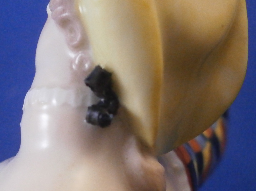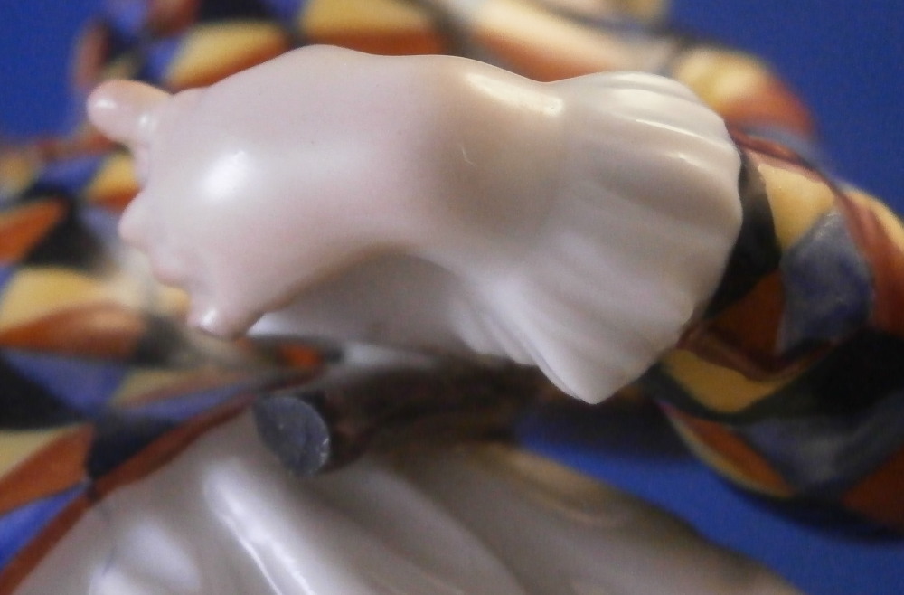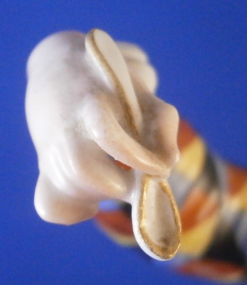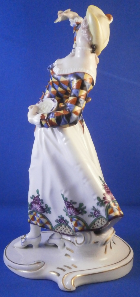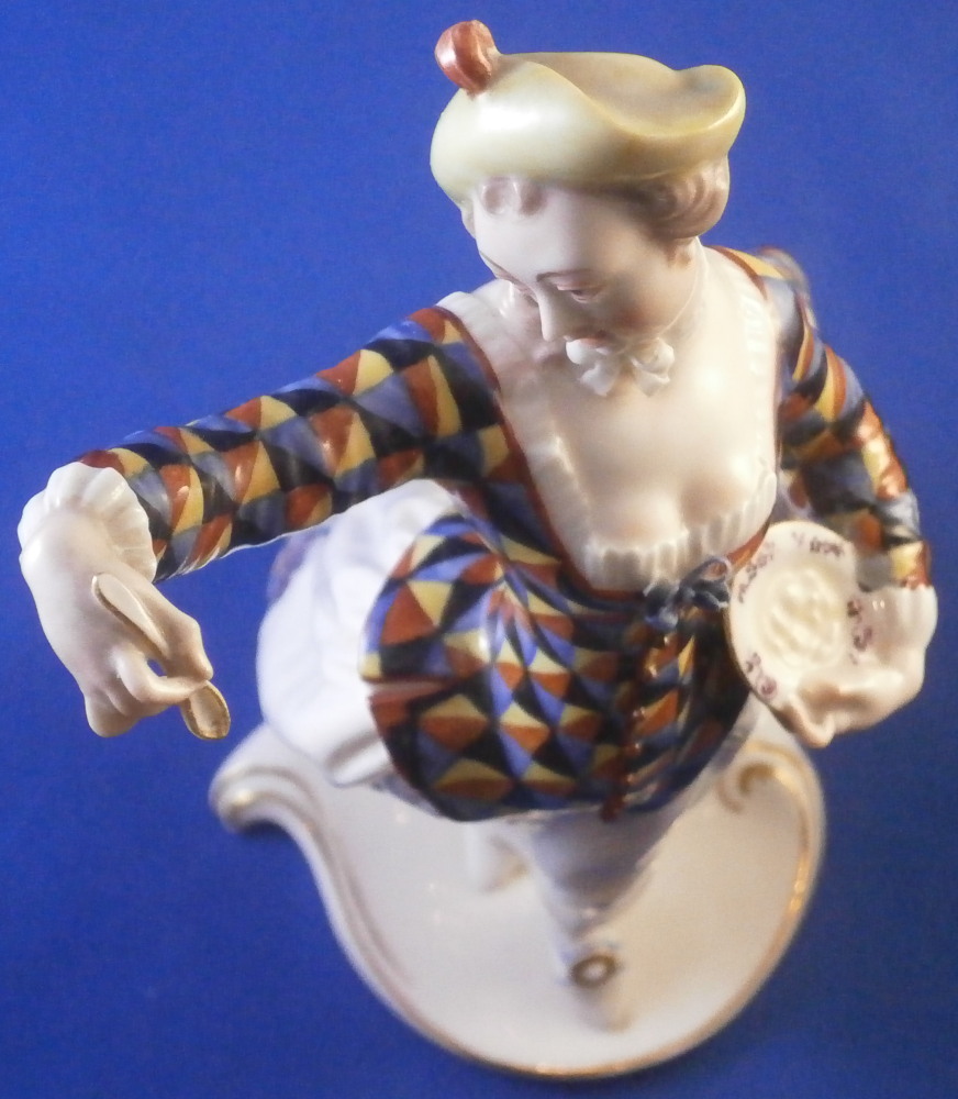 This is one of the best figurines from the Commedia dell'arte aka the Italian Comedy series made by Nymphenburg in the early 20th century. These were first modelled by Franz Anton Bustelli, regarded as one of the best porcelain sculptors, in about 1760 and are still as popular as ever today! And one can see why with the superb and lifelike poses and the top notch hand painted details especially around the bottom end of the skirt! This figurine here is Lalage holding a spoon in one hand and a bowl in the other in order to feed the little monkey baby that Mezzetino is holding (a figure I also have up on the site!). The figurine is stunning and amazingly in great condition with one of the tiny loops of the blue bow by her bussom missing and the bottom end of the slap stick under the arm holding the bowl having been chipped which was colored in and due to the location is impossible to see when on display. She displays perfectly! This is one of my favorite figures in the world of porcelain! The figure is 7.875 inches tall, 4 inches wide and 4.25 inches deep. The piece is marked with the impressed shield mark underneath and impressed number 1 over 0 as shown. New these cost in the five figures and are often not as nice as the older pieces. Please email me for more information or other pictures.