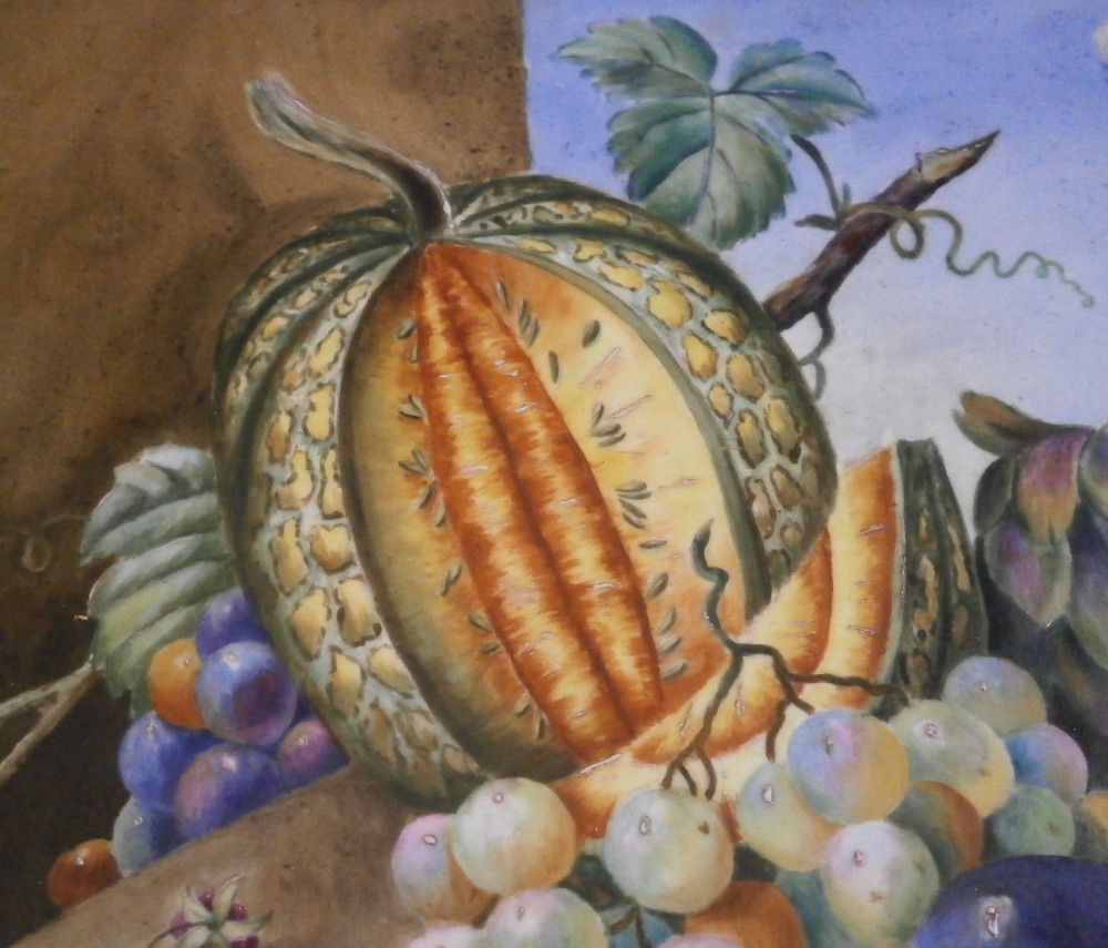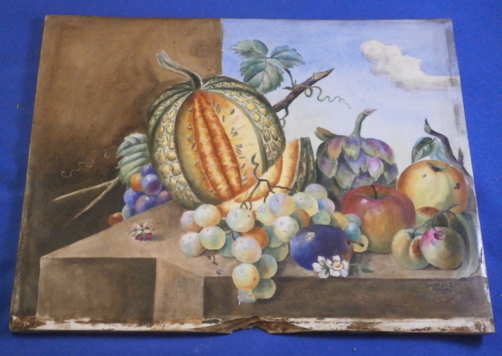This is a plaque made by Nymphenburg around 1900. These plaques are very rare and this one is signed by the painter - Emeran Lidl who painted some pieces for Nymphenburg and some from his decorating studio in Munich. And it is even dated 1901 which is always nice. One rarely knows the exact year a piece was painted or made in the world of porcelain. The plaque here is super nice. A still life of different fruit on a table with the blue sky behind it. It even has a single cloud in the sky! The fruit include a melon, grapes, apples, a plum, then there is a lonely raspberry as well as an artichoke. Very well painted and a super rare subject matter for a Nymphenburg piece. Signed in the bottom right hand corner as shown. The plque comes in a nice wood frame which looks to be original to it. The visible part of the plaque is 7.5 inches wide and 6.125 inches tall. The frame is 10.75 inches wide, 9.25 inches tall and 0.875 inches thick. The frame is not perfect by any means anymore but does the trick. I think the slight damage only adds to the charm of the piece. The plaque's visible field is perfect but the bottom edge has a large chip to it. The same band width along the bottom is not painted so it might have been originally damaged already. The frame obviously hides that part. A truly superb piece! The plaque is makred with their impressed shield mark with a star above it from the late 19th century. There are also some impressed other marks and some sort of signature though I cannot make that out. Please e-mail me for more information or photos.