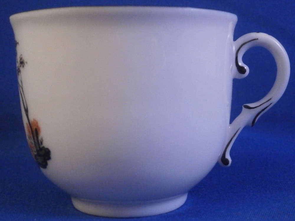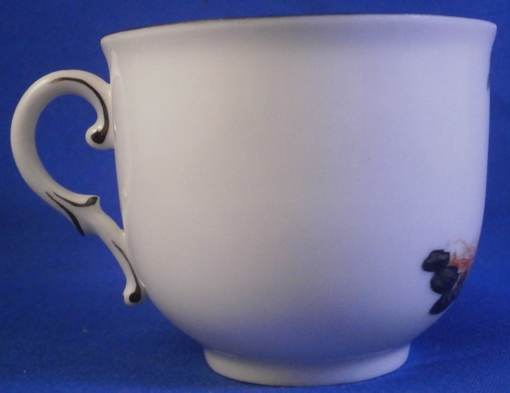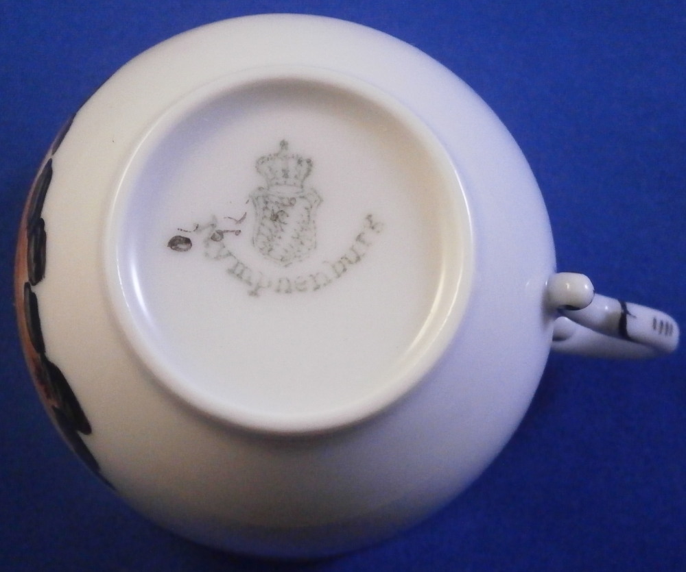 This is a veru cute small cup and saucer made by Nymphenburg in the 20th century. The saucer has a superb hand painted orange and black scene in the center as well as a black trim to the edge while the cup has a matching scene to the front and black trim to the top edge and handle. That orange and black combo looks really nice! The set is marked with the green shield mark with Nymphenburg underneath as well as some black numbers and letters under the cup, orange letters and numbers under the saucer and some impressed numbers under the saucer as well. Both pieces are in perfect condition. The cup is 1.875 inches tall and 2.25 inches in diameter. The saucer is 0.75 inches tall and has a diameter of 4.5 inches. I have a couple more sets of this design if anyone is interested in a pair or more jsut let me know. Please email me for more information or other pictures.