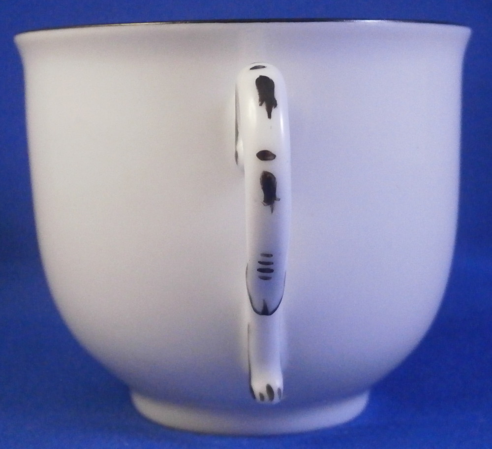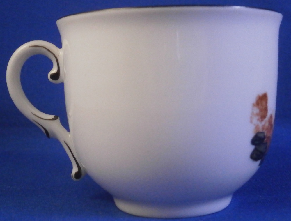 This is a very cute small cup and saucer made by Nymphenburg in the 20th century. The saucer has a superb hand painted orange and black scene in the center as well as a black trim to the edge while the cup has a matching scene to the front and black trim to the top edge and handle. That orange and black combo looks really nice! The set is marked with the green shield mark with Nymphenburg underneath as well as some black numbers and letters under the cup, orange letters and numbers under the saucer and some impressed numbers under the saucer as well. The set is in perfect condition with a brown firing spot under the saucer inside the foot ring as shown. The cup is 1.875 inches tall and 2.25 inches in diameter. The saucer is 0.75 inches tall and has a diameter of 4.5 inches. I have a couple more sets of this design if anyone is interested in a pair or more just let me know. Please email me for more information or other pictures.