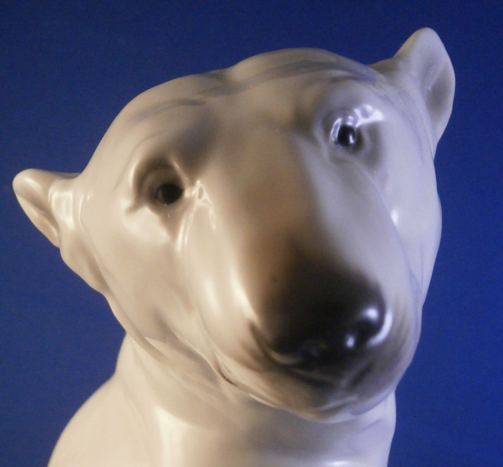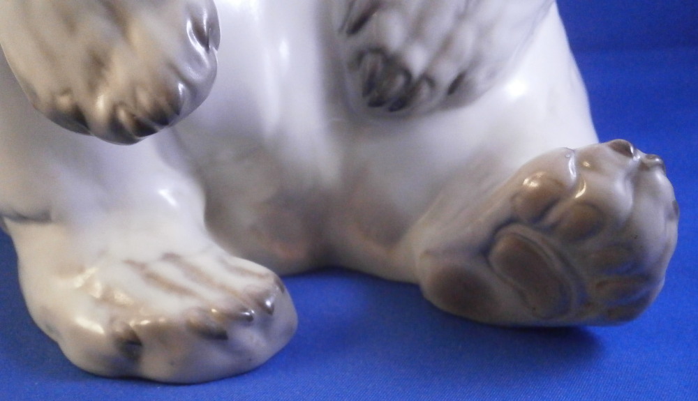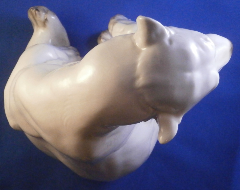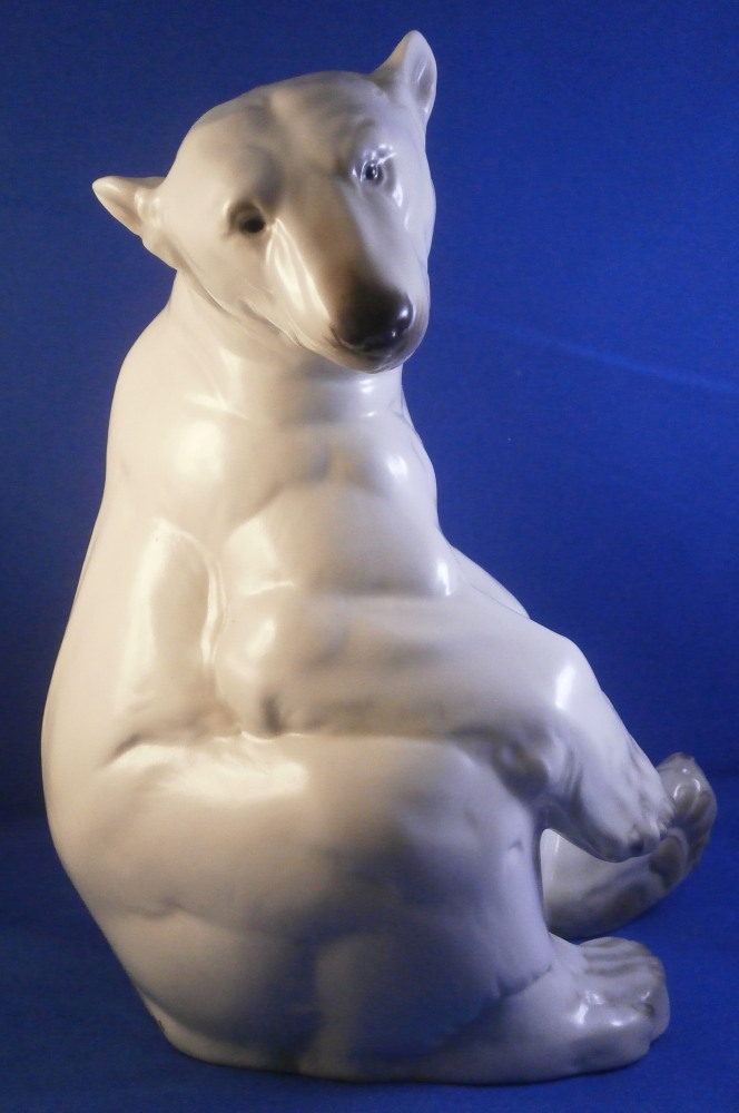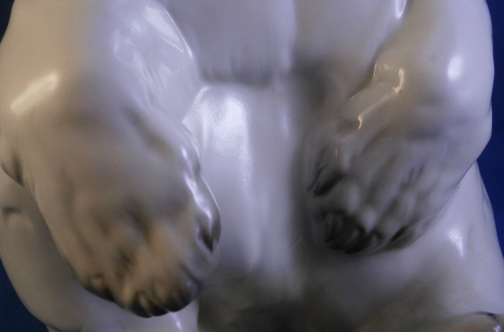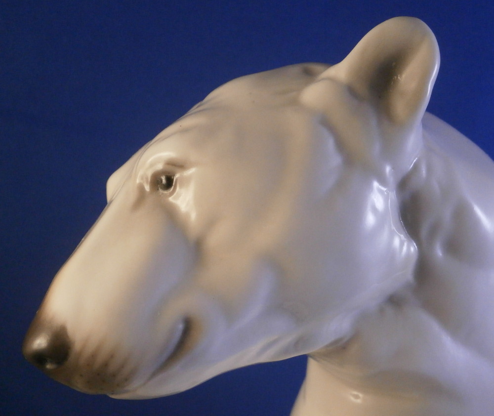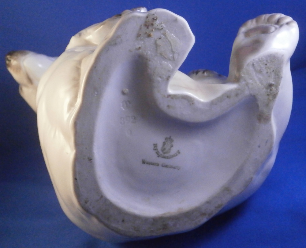 This is an amazing figurine of a polar bear made by Nymphenburg during the mid 20th century right after WWII. Designed by Willy Zuegel - he is an amazing figure to look at. Amazingly modeled and painted just enough to look real. One of the nicer versions I have come across but these are not common at all! The figure is 8.5 inches tall, 6 inches wide and 6.25 inches deep. The figurine is marked with the impressed shield mark underneath with the number 392 and 9 as well as the artist name W. Zügel impressed into the back bottom edge which is very hard to see but is right next to the painter's initials in black. Green shield mark with the crown above and Nymphenburg underneath and Western Germany under that. Artist initials H.S. in black on the back edge. The piece is in perfect condition! Quite fun to look at really! Please email me for more information or other pictures.