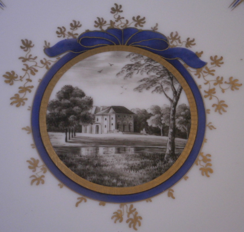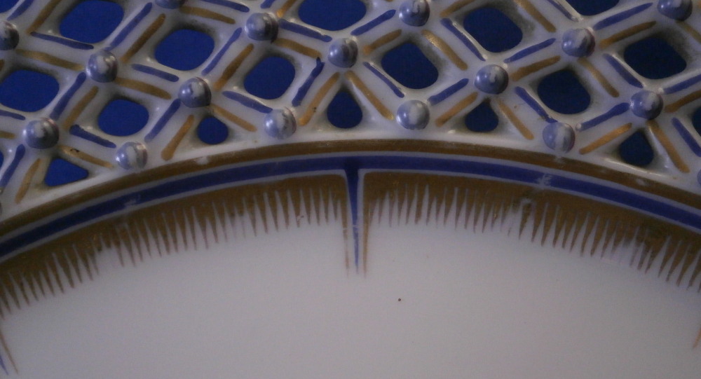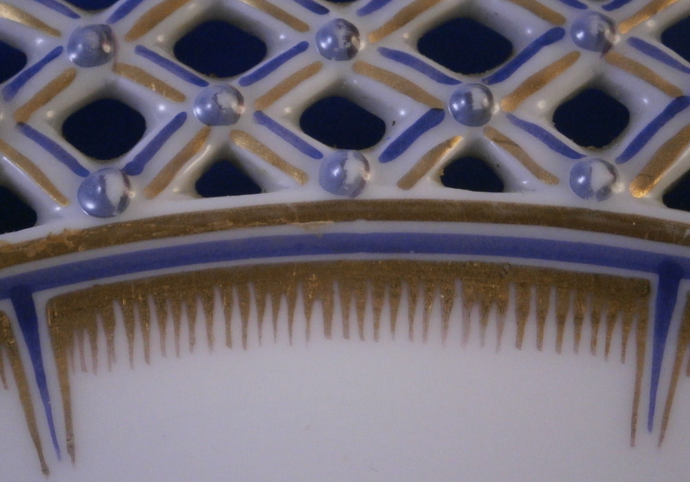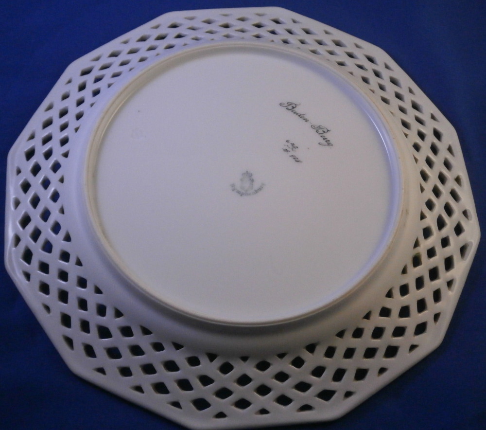 This is a reticulated plate made by Nymphenburg in the early 20th century. It is one from the King's or Pearl service made for the electoral court around 1792-1795 designed originally by Dominikus Auliczek. The original set is still in the possession of the family and thus any pieces of this design are later copies. What makes this plate quite special compared to many others is the reticulated edge which is not easy to find at all. The plate is 12 sided and of the pearl design (refers to the little blue pearls on the rim). Hand painted with a scene in black in the center as well as a superb gold and blue trim. The plate is 1 inch tall and 9 inches in diameter. Marked with the green shield mark with the word Nymphenburg underneath, an impressed shield mark as well as the usual black numbers as shown. The word Baden-Burg is written on the back as well which refers to what the scene depicts on the front. It is the park pavillion on the grounds of Schloss Nymphenburg I believe. The plate is in good condition with some wear to the decoration mainly the gold trim around the edge of the well and the little pearlsalong the rim. It displays very nicely. Please email me for more information or other pictures.