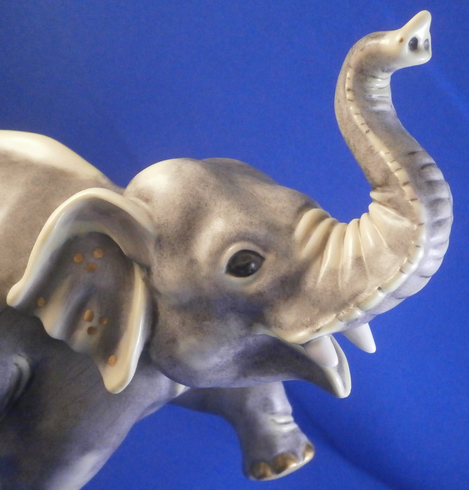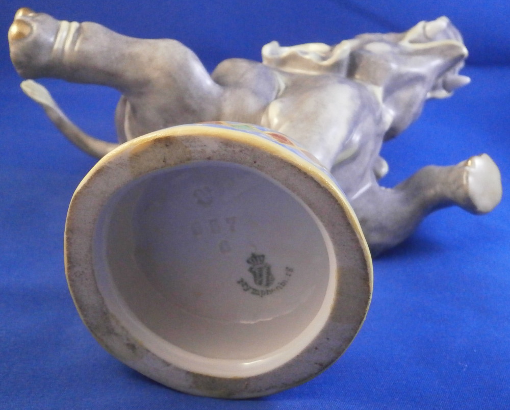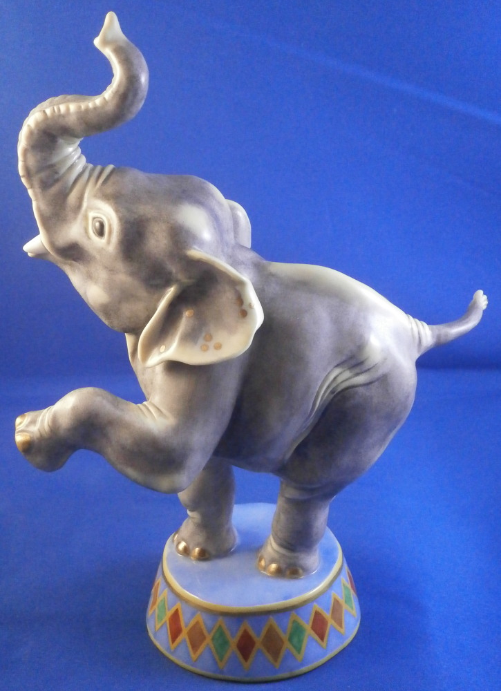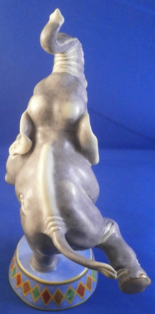 This is a really fun figurine of an elephant on top of a stand performing a circus routine made by Nymphenburg during the mid 20th century. Something that rightfully does not happen anymore and our kids already have no idea what this is. Still a memory that many of us slightly older folks have from when we were young. The figure was designed by the famous Terletzki-Scherf who also designed many other circus animals for this series. The elephant and base are really nicely modeled and the base is reminiscent of the circus feeling. The piece is 7.75 inches tall, 6.125 inches long and 3.125 inches deep so a nice size. The figure is marked with the impressed shield mark underneath the base as well as the impressed model number 657 and a number 6. There is also the green shield mark with the word Nymphenburg under it. Another impressed shield mark to the back of the base under one of the green shapes and hard to see. The piece is in perfect condition which is nice since the tail is often damaged on these. Please email me for more information or other pictures.