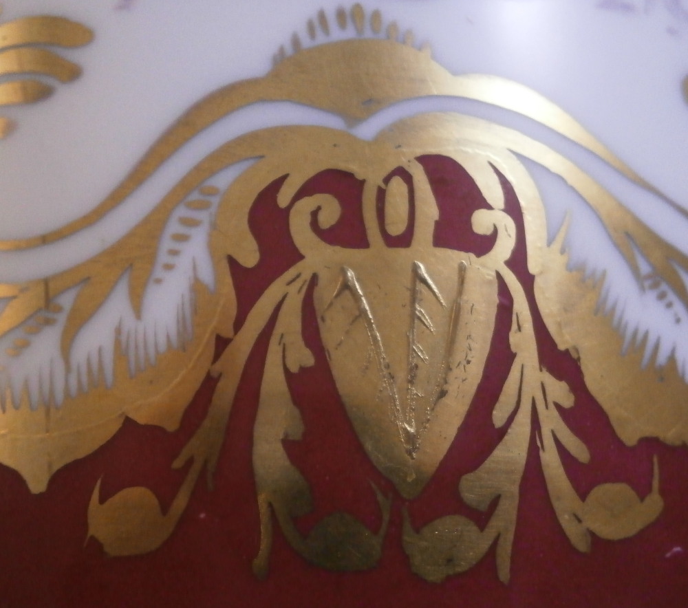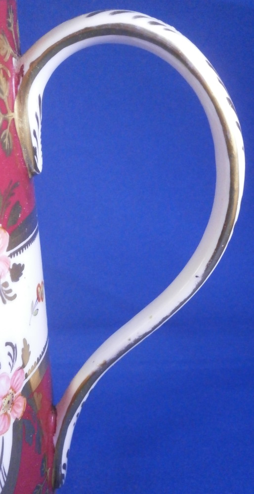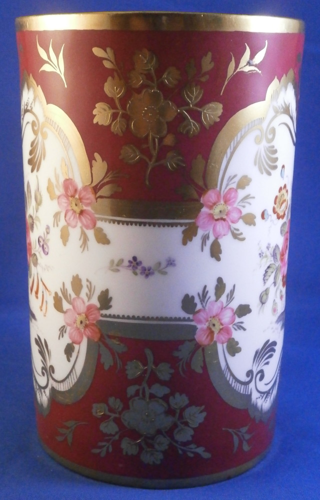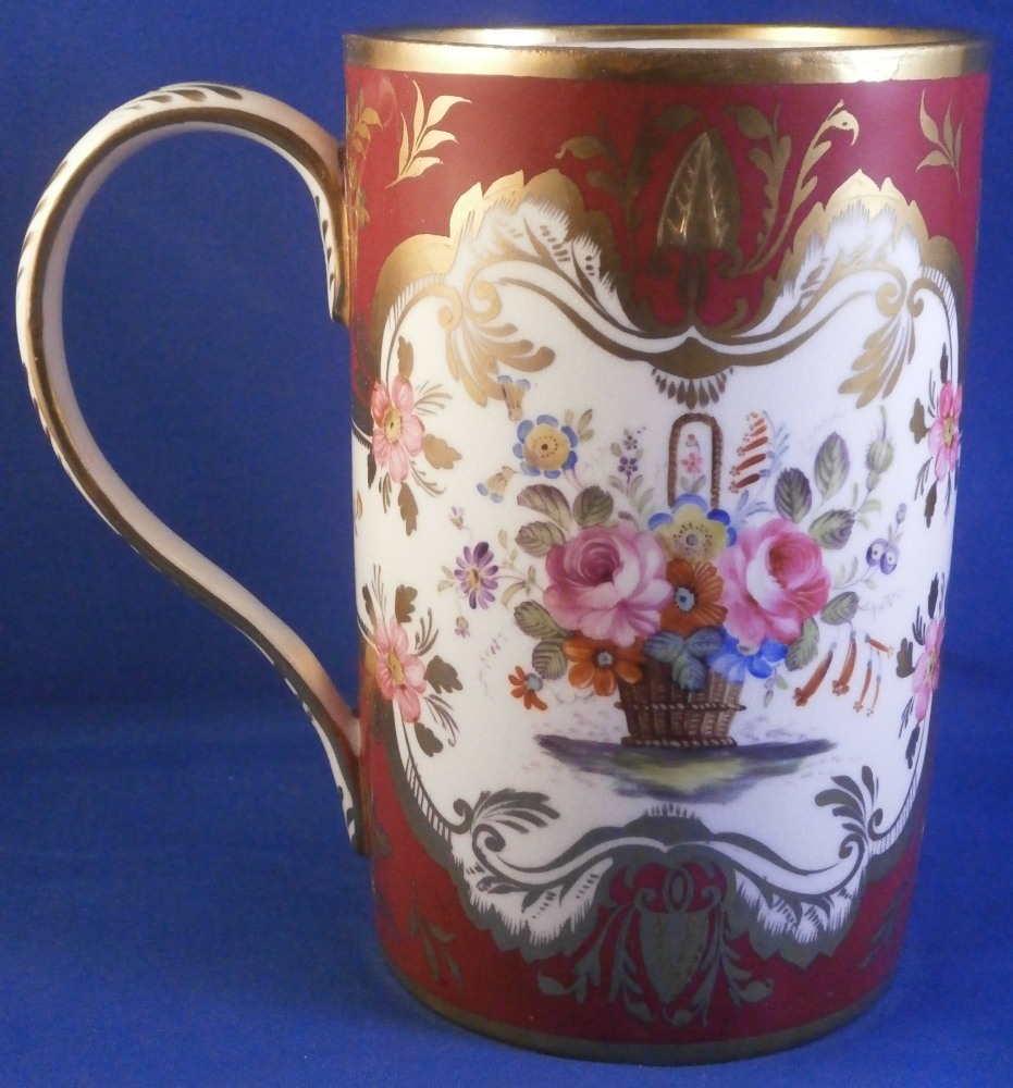 This is a nice large tankard / mug / cup made by Rockingham in the first half of the 19th century. It is decorated with a superb reddish ground color with lots of nice gilding over that some of which has raised elements to it. The bes part however are those two panels with a hand painted floral scene on white ground including a bassket filled with flwoers surrounded by a fancy gold trim with four flower blossoms to the corners. A really well painted piece! Some more gold trim to the handle as well. As nice as they come and the piece is in superb condition with some of the usual fine crazing to the white areas. The gilding is still in amazing condition! A great looking piece of the perfect size to have your beer in :) The piece is not marked underneath except for some greenish smudges as shown. Not sure what that is all about. The tankard is 5.625 inches tall and 3.625 inches in diameter. Please email me for more information or other pictures.