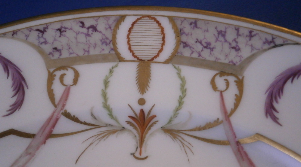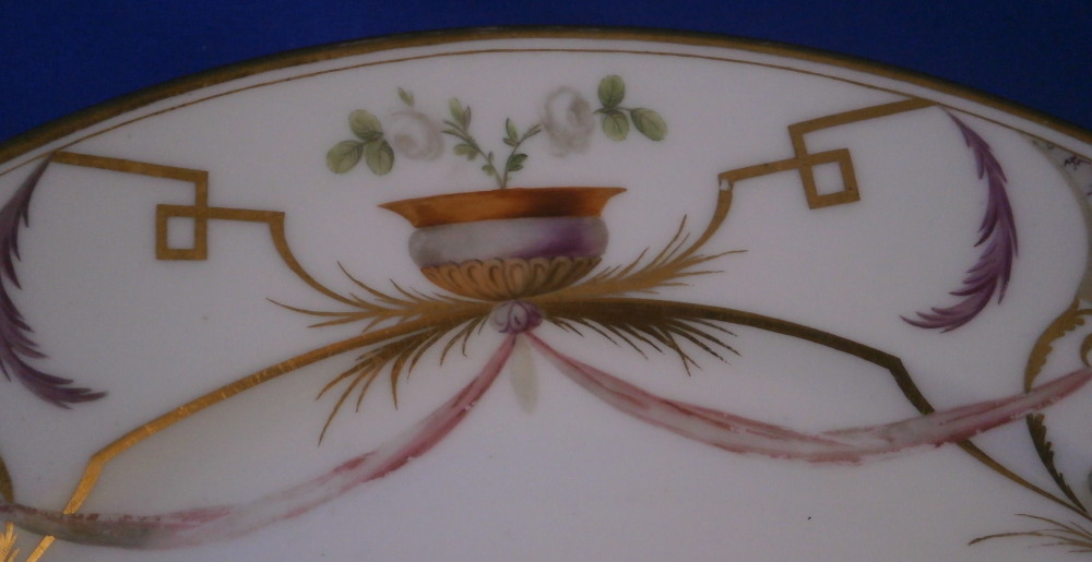 This is really nice plate made by Rue de Crussol of the Paris region in the late 18th century. The Englishman Christopher Potter started the factory in 1789 and it ran until the 19th century sometime around 1819. So not very long. Here we have an unusually well dated example which I have not seen before. It dates the piece to the 27th of May 1793. So a fairly early piece for this maker! The duchess of Berry was a patron of this maker which helped it get off the ground. Very well thought of by collectors and there was even a book written on this maker a few years back if I recall correctly. The plate is superbly hand painted with a very fancy quite modern looking design around the rim including pot with white roses growing out of them. The well has lots of tiny gold leaves scattered throughout. A really fancy looking plate! The piece is in superb condition with the pink drapes hanging from the center of the flower pots to the gold garland hooks did not fire properly but since it is even all around it looks part of the design and does not take away from it. These things happen on these early wares! All part of the charm of 18th century porcelain! The plate is marked underneath with the under glaze B over POTTER over 5 mark and the black markings n then some I cannot make out, a capital A and 27 may 1793. Maybe it was a design example specimen never meant to be sold. Like I said I have not seen one with this exact a date mark except on a plate I jsut listed as well. These two came together so that makes sense. The plate is 1.375 inches tall and 9.625 inches in diameter. A nice size and a really nice looking example! Please email me for more information or other pictures.