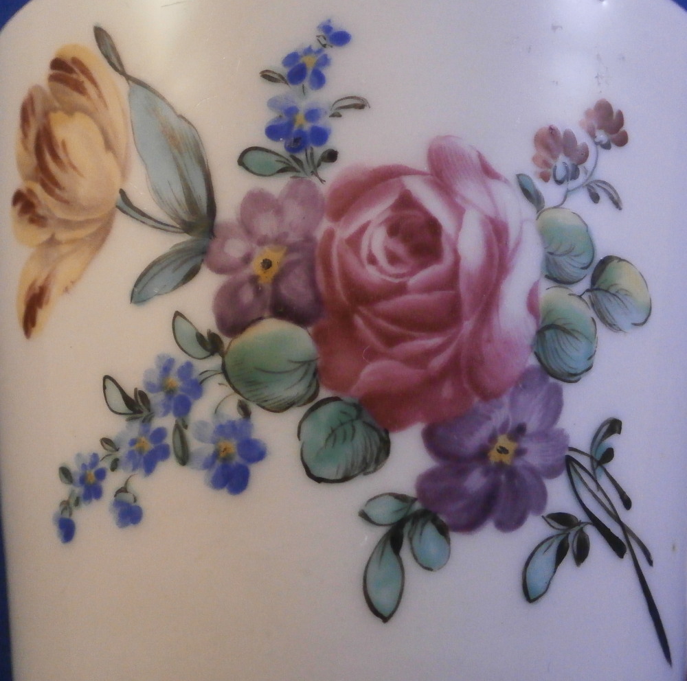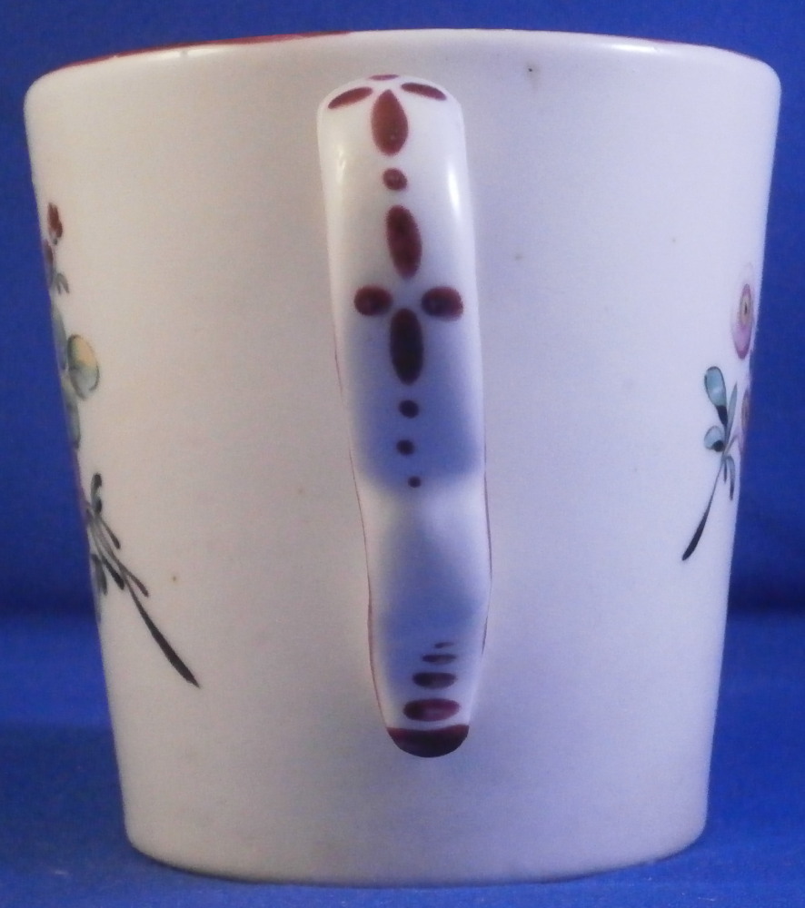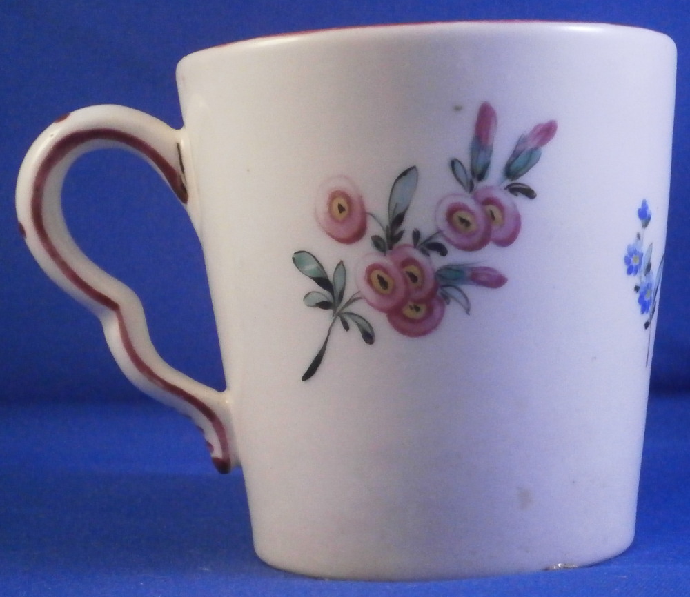This is a rare cup made by Sceaux in the 18th century. A rare maker to find anything by so a missing saucer I could live with :) A faience factory was founded in Sceaux by von de Bey and Jacques Chapelle which probably started to produce soft paste porcelain around 1763 when Joseph Jullien and Charles-Symphorien Jacques bought the factory and managed to get the Duke of Penthievre as a patron. Production of porcelain ceased by the end of the 18th century and is very hard to find nowadys. It often closely resembles that of Mennecy which is the case here. The cup is made of soft paste porcelain and is hand painted with a large floral arrangement to one side and two single flowers to the other. Typical handle shape with some puce trim to it as well as the top edge. The cup is in superb condition with the usual manufacturing flaws associated with these early wares the worst being some extra grit stuck to the bottom edge in one spot as shown. The piece is marked with the incised SX mark as shown. The cup measures 2.625 inches tall and 2.625 inches in diameter. Please email me for more information or other pictures.