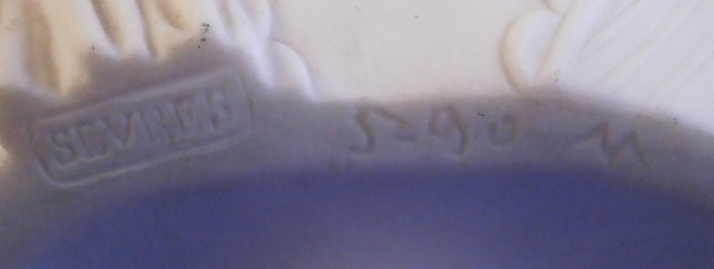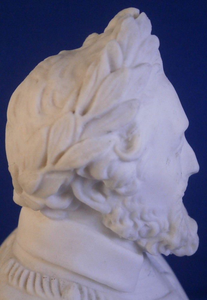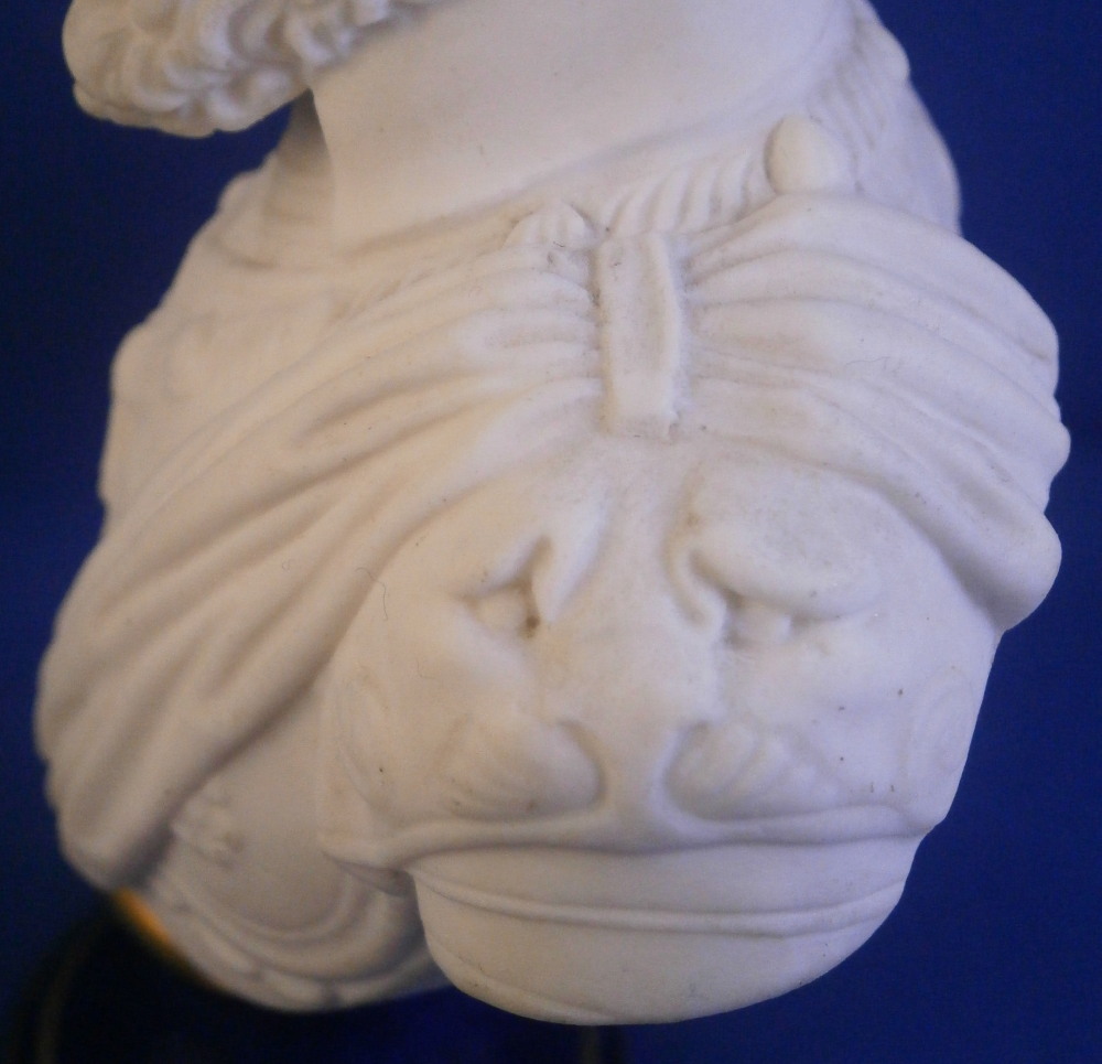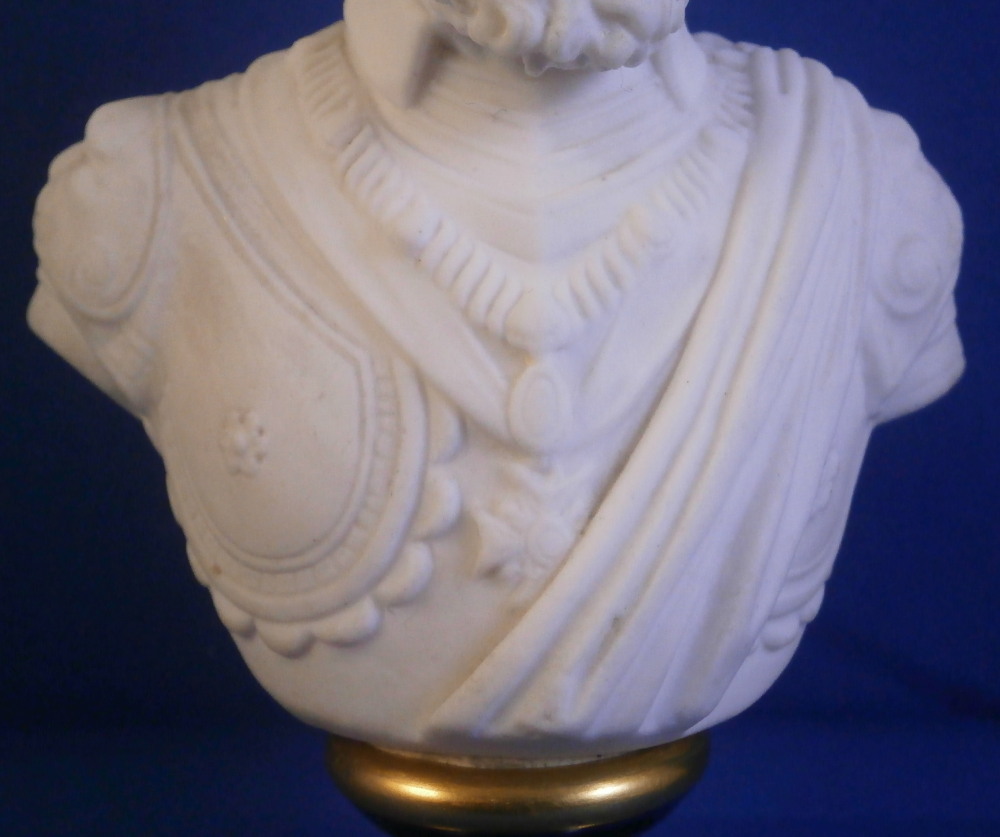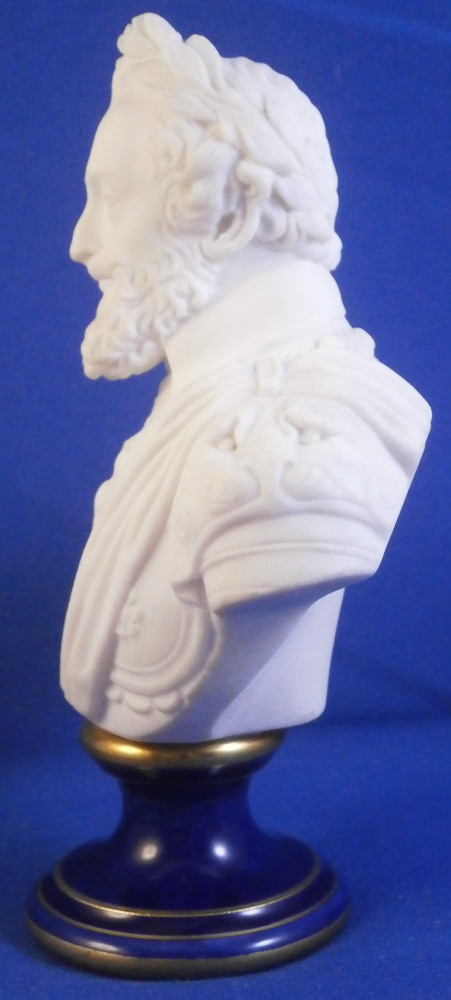 This is a biscuit figural bust of the famous King Herny IV (aka Henry the Usurper ) made by Sevres in the late 19th century - 1888/90/91. Henry was the King of ENgland from 1399 until 1413. The bust is made of unglazed bisque or biscuit porcelain and is extremely well modelled with lots of superb details. He is wearing a draped cuirass with what looks to be lion faces on his shoulders. He has a beard and has a laurel wreath on his head. A stunning piece and the unevenly blue ground colored base with the gold trim only brings it out even more. The piece is in perfect condition. A very clear and crisp mold! The bust is marked on the back by his shoulders with the impressed Sevres mark as well as the year mark for 1890 and under the base there is the green Sevres year mark S .88 in an oval type shape as well as the red gilder's mark for 1891 and the usual incised marks of this period. The piece is 5.125 inches tall, about 3.25 inches wide and 2.375 inches deep. Please email me for more information or other pictures.