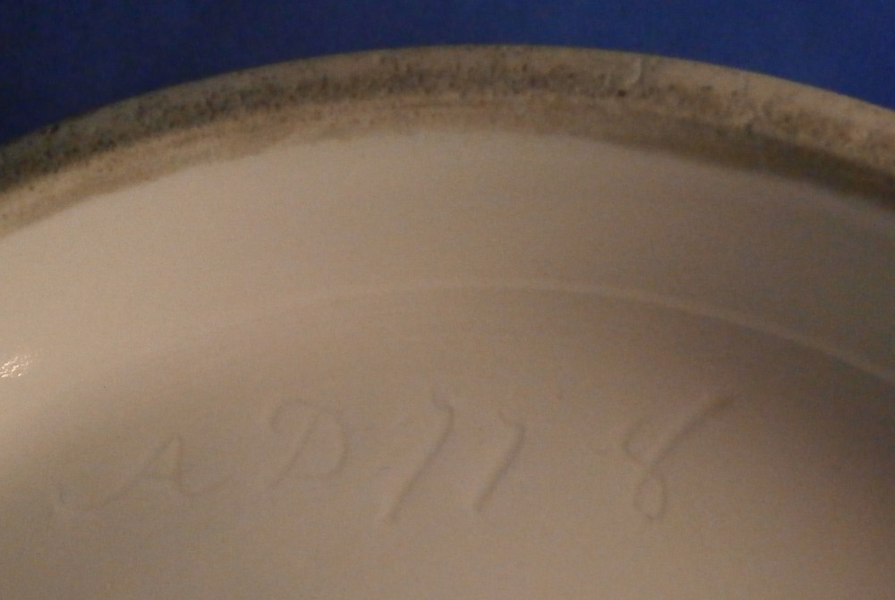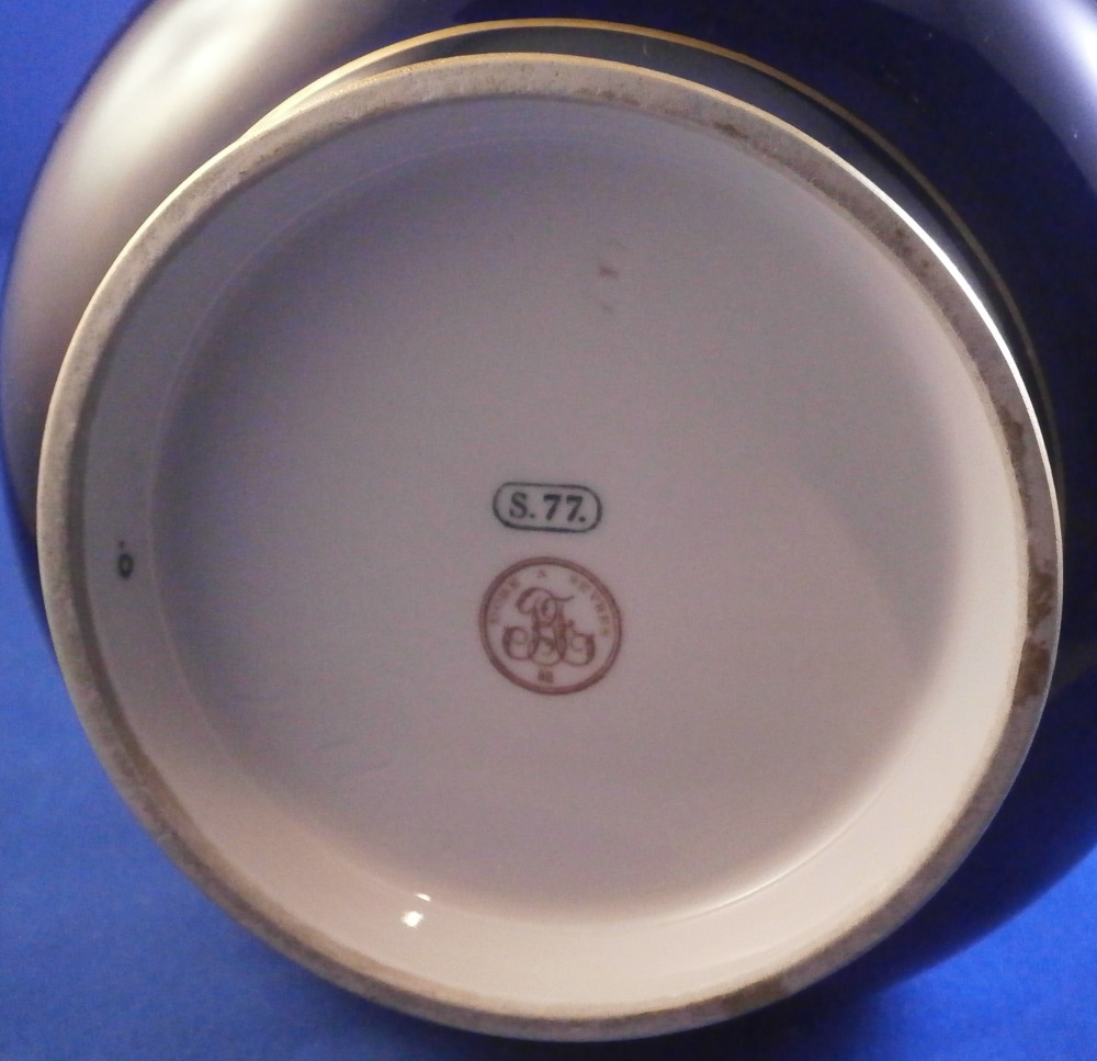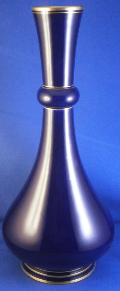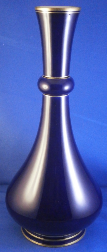 This is a nicely shaped large vase made by Sevres in 1877/ 1882. It has a bulbous shape with a thin neck that flares a bit at the top. Little bulb decoration in the neck. The vase is covered in a deep cobalt blue ground color with just some simple gold trim to strategic location to make it look very elgant. Not often one finds these larger examples and this shape it very nice! The vase is in great condition with one area of a few spots to the cobalt blue color. Something happend to this color sometimes over time that make it look like this. I ahve seen it on cobalt blue from all different makers. Does not distract when on display as it needs to be held at the right angle to show. It displays perfectly! It is marked underneath with the oval S.77. mark in green for 1877 as well as the red circular Dore a Sevres mark for 1882 as shown. There are also the usual incised marks one finds on authentic Sevres pieces as well as an artist mark as shown. The vase is 12.75 inches tall and about 5.5 inches in diameter at the widest part. The top opening is 2.25 inches in diameter. Please email me for more information or other pictures.