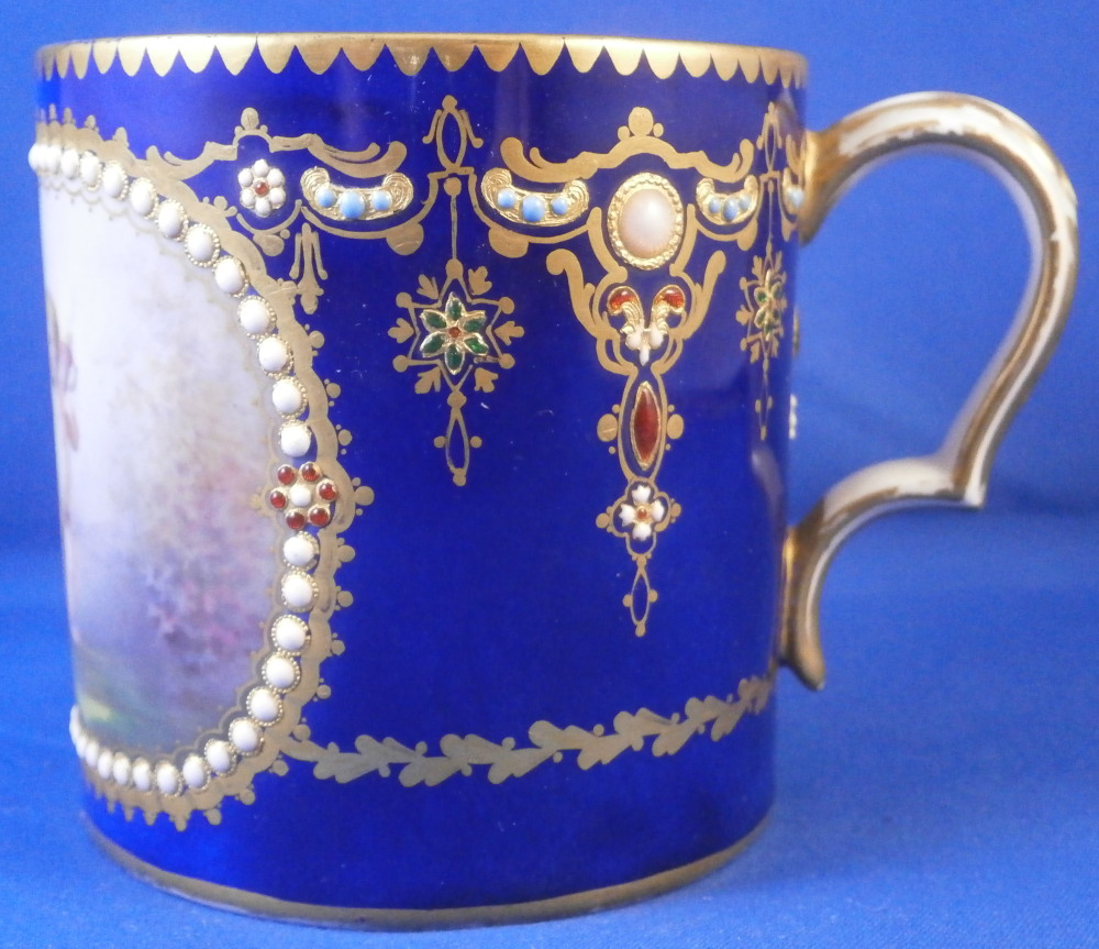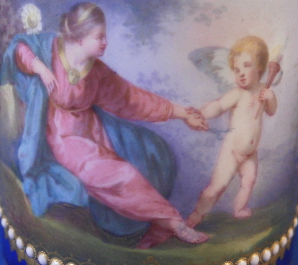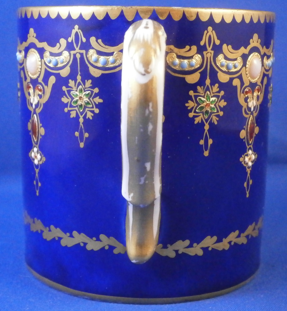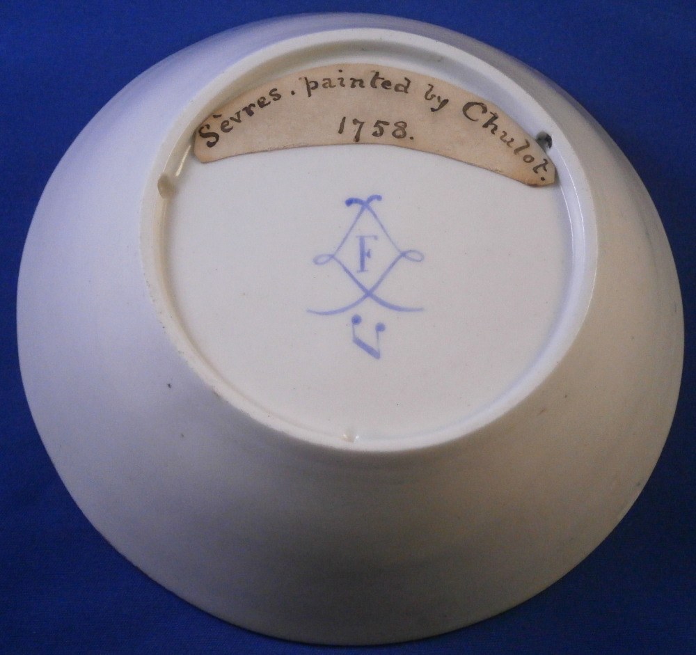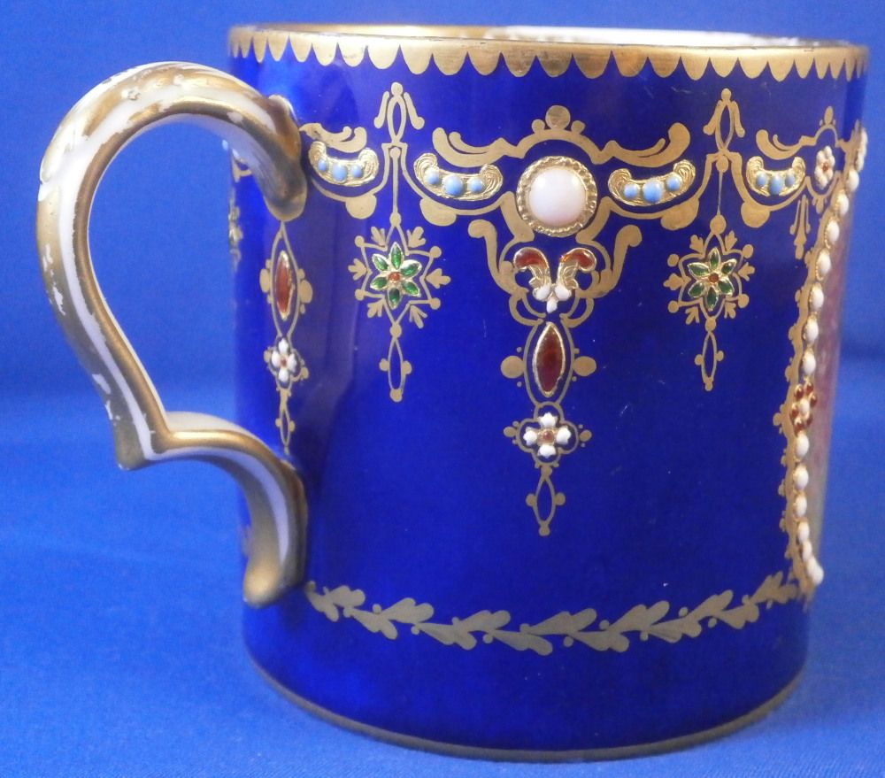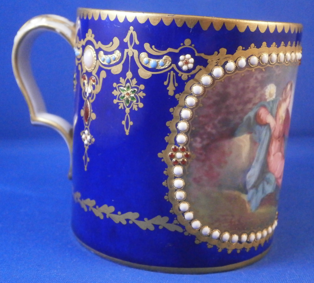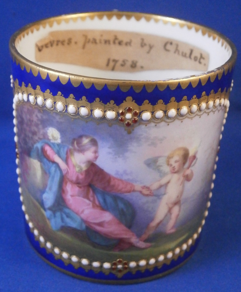 This is an amazing cup and saucer made by Sevres in 1758. Better known as a Gobelet litron . It is marked with the date letter F and the painter's mark of a set of musical notes for Chulot. The cup has a really nice scene to the front of a lady sitting in a landscape surrounding grabbing a cherub, that is holding a torch, by its arm. The scene on the saucer is a nice landscape. What makes this set though is that amazing cobalt blue ground color with the absolutely stunning "jewel" desocration on top. Gold trim to the edges. CHulot was active at Sevres from 1755 until 1800 - a crazy long time! This either means it is one of those pieces that had the original minor decoration cleared with acid and was then re-decorated or the it was later embellished with the jewels on gold foil backing. This was often done in the Limoges area and is known as jewelled porcelain. This must have happened after d1779 when jewelling was introduced at Sevres and was highly sought after! The jewel decoration is stunning and in amazing shape with just one with enamel piece missing on the saucer well edge that was colored in with white paint and is hard to spot. In as good a shape as they come! The gold trim along the top edges has a few worn spots to them. All in all the set displays superbly! The 'jewels' are raised enamel pieces that are attached to little thin pieces of gold and then fired onto the porcelain which makes for an amazing look! The porcelain itself is softpaste porcelain and it has the little holes for hanging in the kiln in the foot ring. Both pieces are marked with the interlaced double L mark in blue with the date letter F and artist mark as shown. A nice early set. The cup is 2.875 inches tall and 2.75 inches in diameter and the saucer is 1.5 inches tall and 5.5 inches in diameter. A superb large set! Please email me for more information or other pictures.