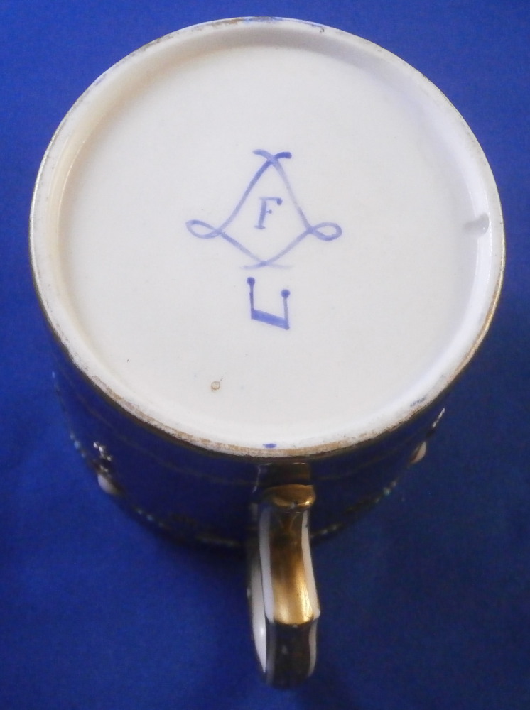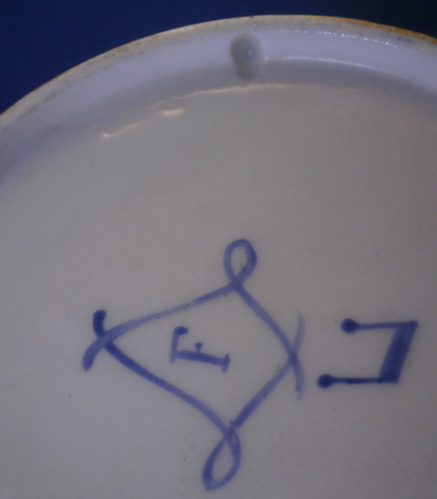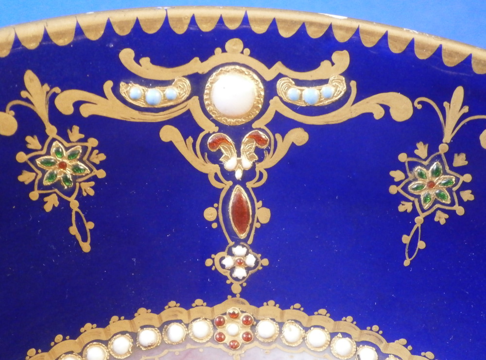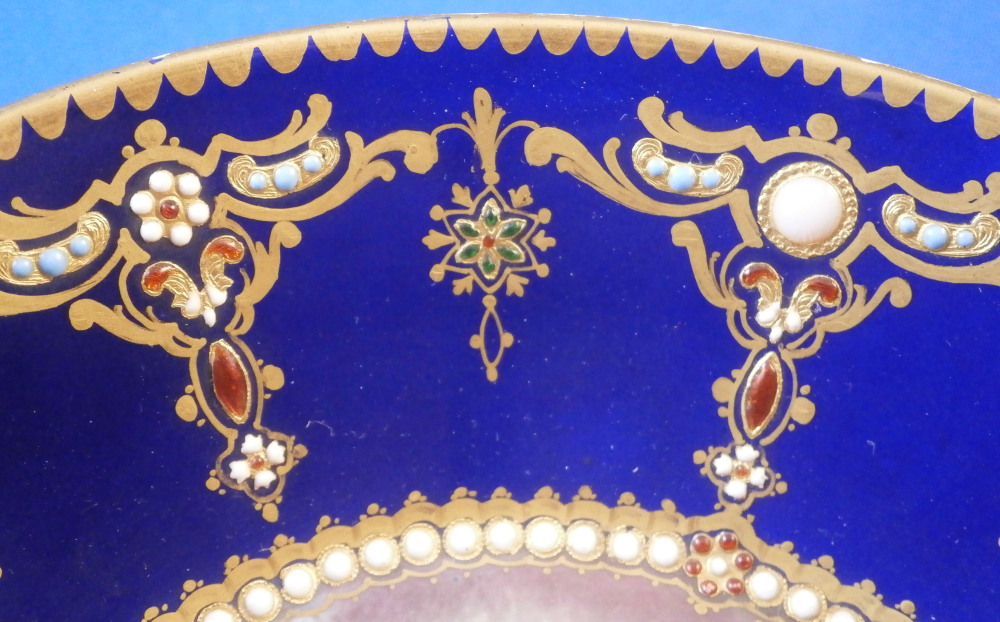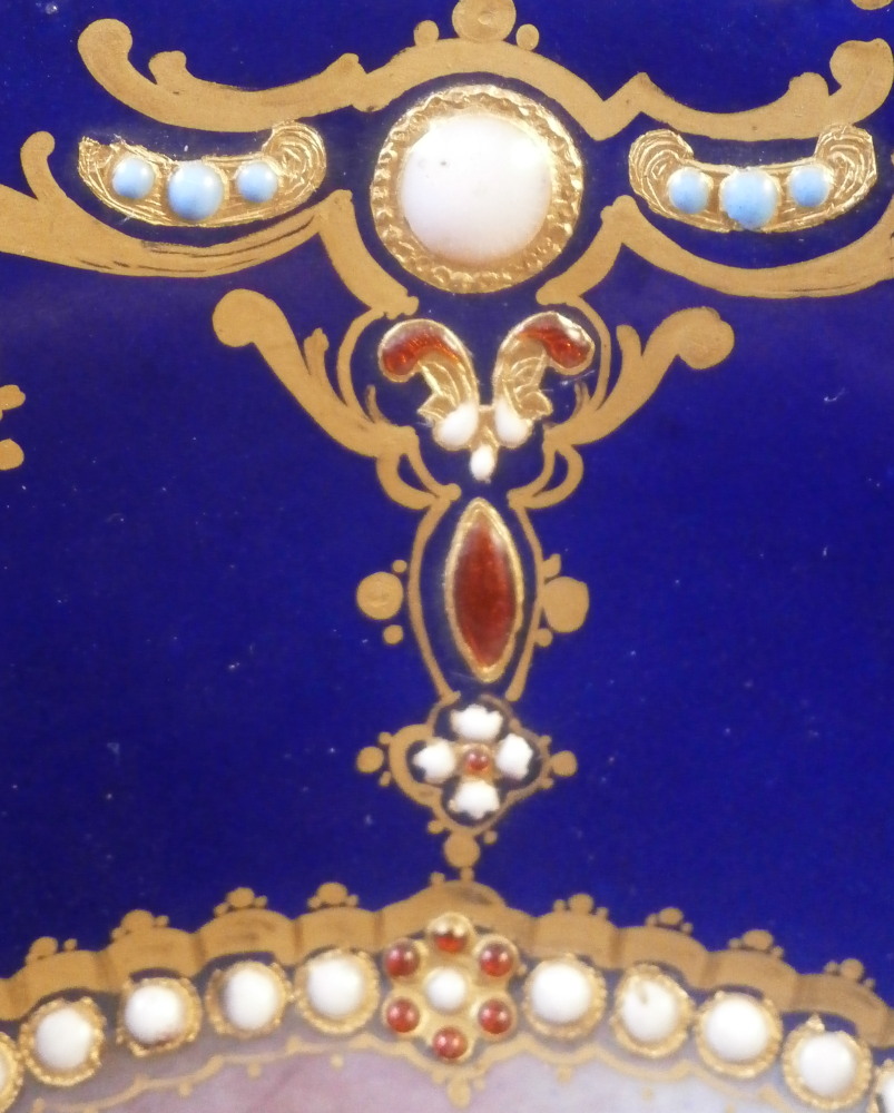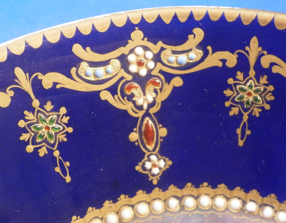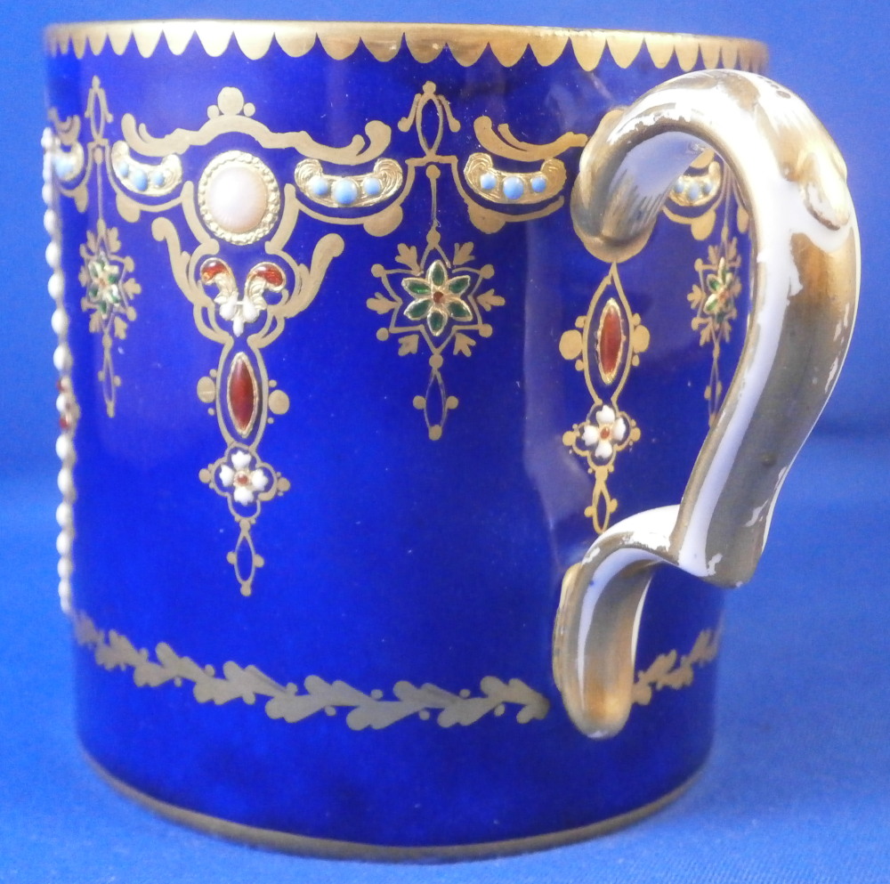 This is an amazing cup and saucer made by Sevres in 1758. Better known as a Gobelet litron . It is marked with the date letter F and the painter's mark of a set of musical notes for Chulot. The cup has a really nice scene to the front of a lady sitting in a landscape surrounding grabbing a cherub, that is holding a torch, by its arm. The scene on the saucer is a nice landscape. What makes this set though is that amazing cobalt blue ground color with the absolutely stunning "jewel" desocration on top. Gold trim to the edges. CHulot was active at Sevres from 1755 until 1800 - a crazy long time! This either means it is one of those pieces that had the original minor decoration cleared with acid and was then re-decorated or the it was later embellished with the jewels on gold foil backing. This was often done in the Limoges area and is known as jewelled porcelain. This must have happened after d1779 when jewelling was introduced at Sevres and was highly sought after! The jewel decoration is stunning and in amazing shape with just one with enamel piece missing on the saucer well edge that was colored in with white paint and is hard to spot. In as good a shape as they come! The gold trim along the top edges has a few worn spots to them. All in all the set displays superbly! The 'jewels' are raised enamel pieces that are attached to little thin pieces of gold and then fired onto the porcelain which makes for an amazing look! The porcelain itself is softpaste porcelain and it has the little holes for hanging in the kiln in the foot ring. Both pieces are marked with the interlaced double L mark in blue with the date letter F and artist mark as shown. A nice early set. The cup is 2.875 inches tall and 2.75 inches in diameter and the saucer is 1.5 inches tall and 5.5 inches in diameter. A superb large set! Please email me for more information or other pictures.