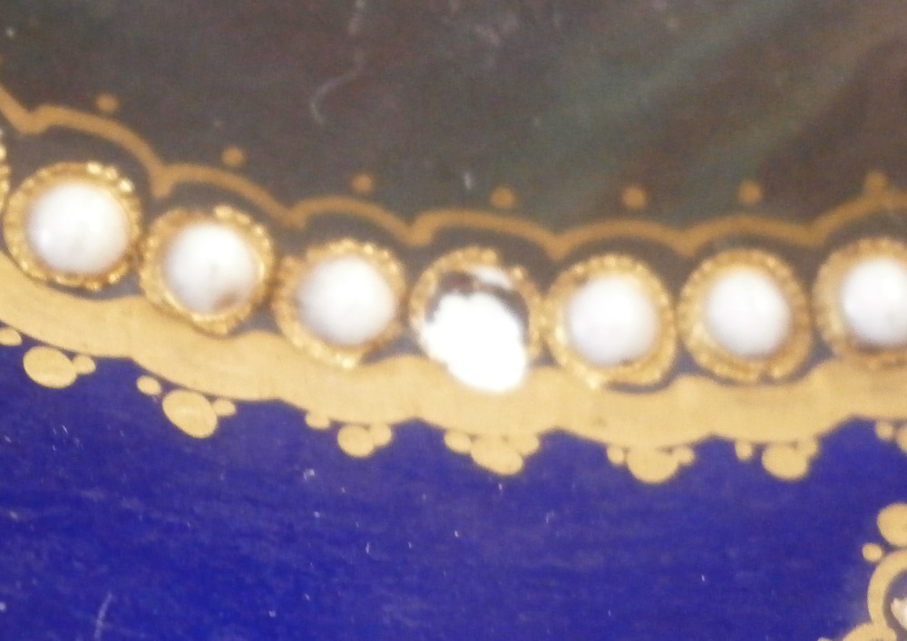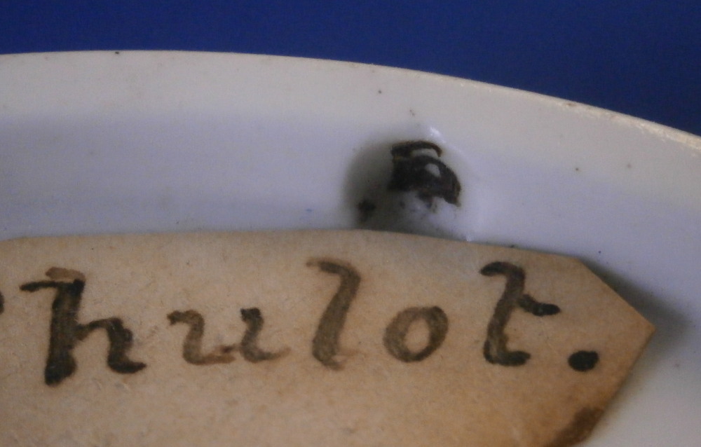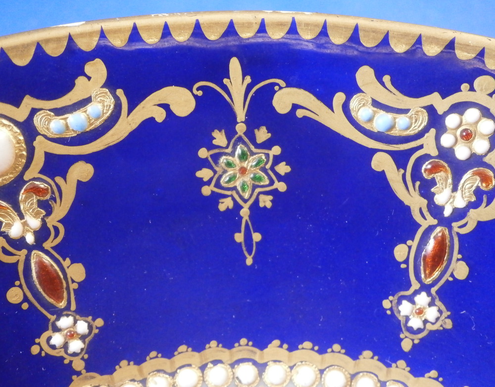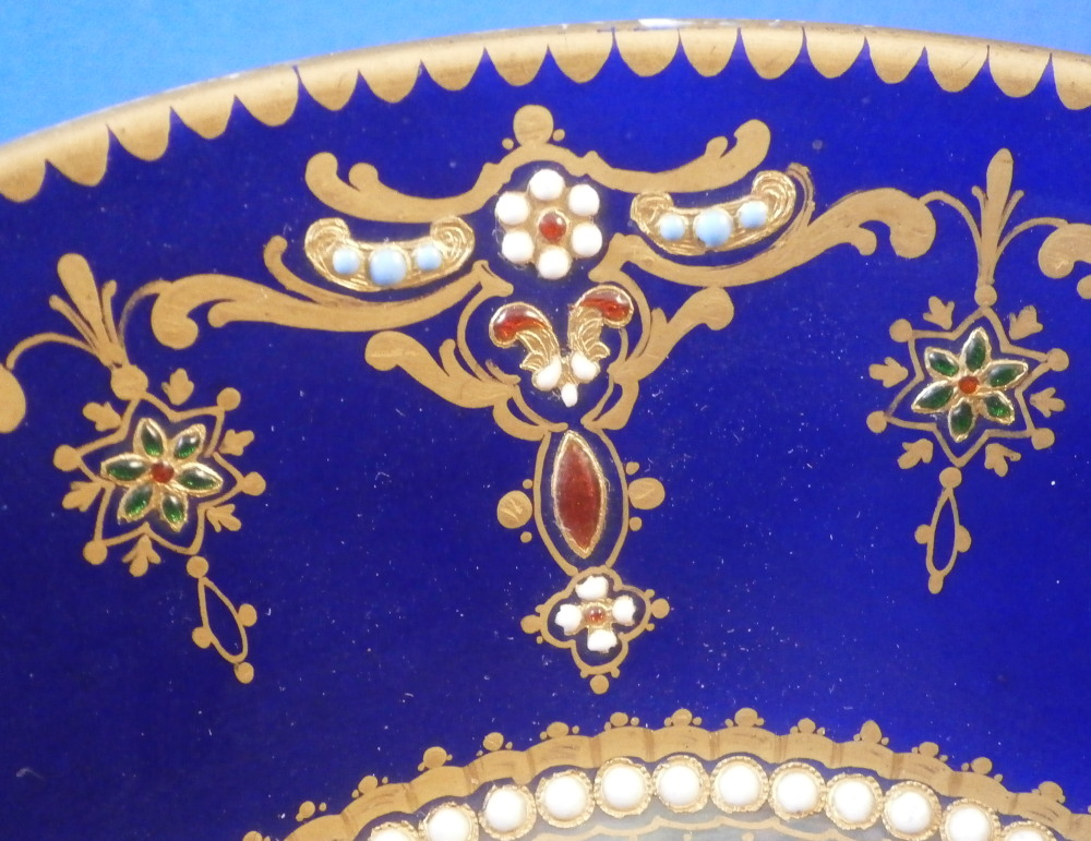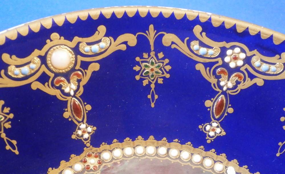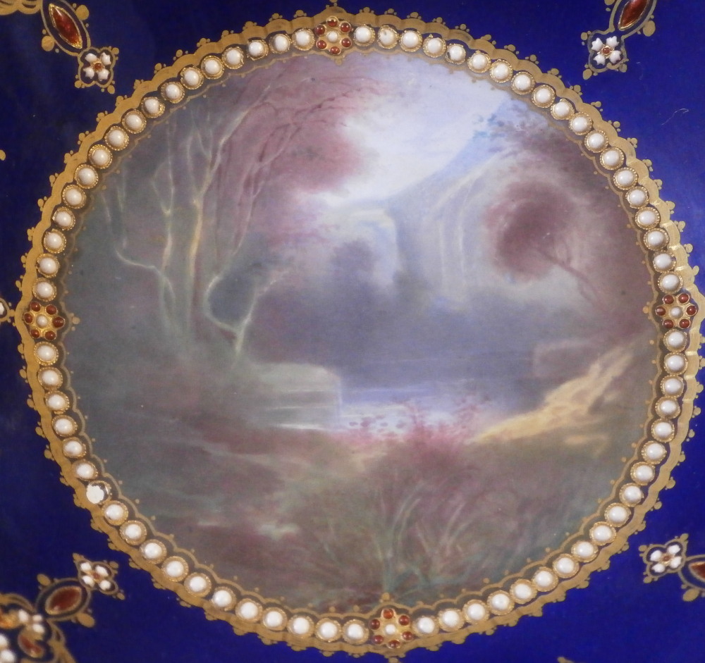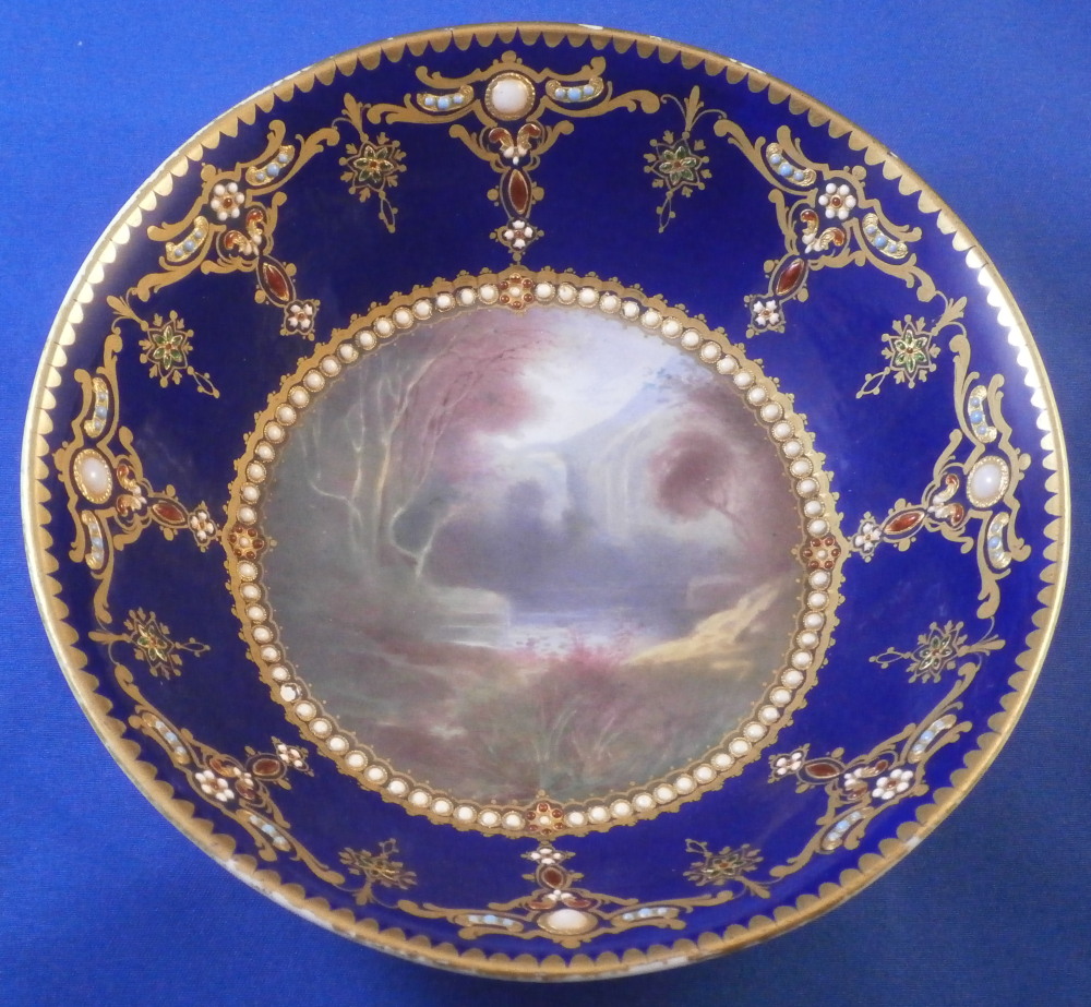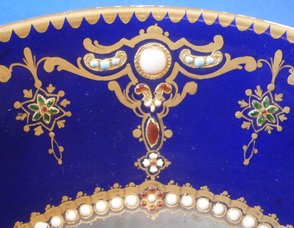 This is an amazing cup and saucer made by Sevres in 1758. Better known as a Gobelet litron . It is marked with the date letter F and the painter's mark of a set of musical notes for Chulot. The cup has a really nice scene to the front of a lady sitting in a landscape surrounding grabbing a cherub, that is holding a torch, by its arm. The scene on the saucer is a nice landscape. What makes this set though is that amazing cobalt blue ground color with the absolutely stunning "jewel" desocration on top. Gold trim to the edges. CHulot was active at Sevres from 1755 until 1800 - a crazy long time! This either means it is one of those pieces that had the original minor decoration cleared with acid and was then re-decorated or the it was later embellished with the jewels on gold foil backing. This was often done in the Limoges area and is known as jewelled porcelain. This must have happened after d1779 when jewelling was introduced at Sevres and was highly sought after! The jewel decoration is stunning and in amazing shape with just one with enamel piece missing on the saucer well edge that was colored in with white paint and is hard to spot. In as good a shape as they come! The gold trim along the top edges has a few worn spots to them. All in all the set displays superbly! The 'jewels' are raised enamel pieces that are attached to little thin pieces of gold and then fired onto the porcelain which makes for an amazing look! The porcelain itself is softpaste porcelain and it has the little holes for hanging in the kiln in the foot ring. Both pieces are marked with the interlaced double L mark in blue with the date letter F and artist mark as shown. A nice early set. The cup is 2.875 inches tall and 2.75 inches in diameter and the saucer is 1.5 inches tall and 5.5 inches in diameter. A superb large set! Please email me for more information or other pictures.