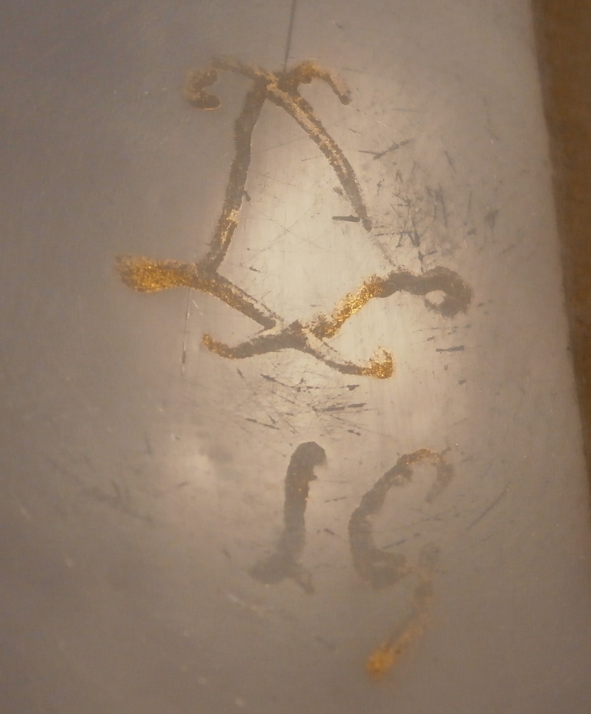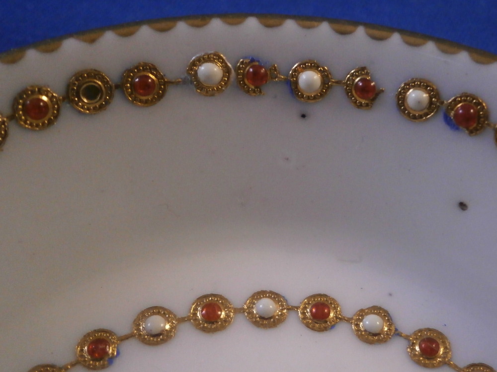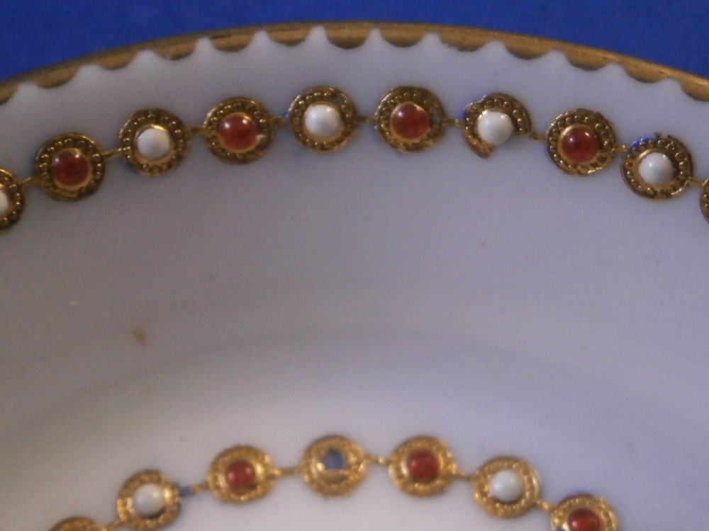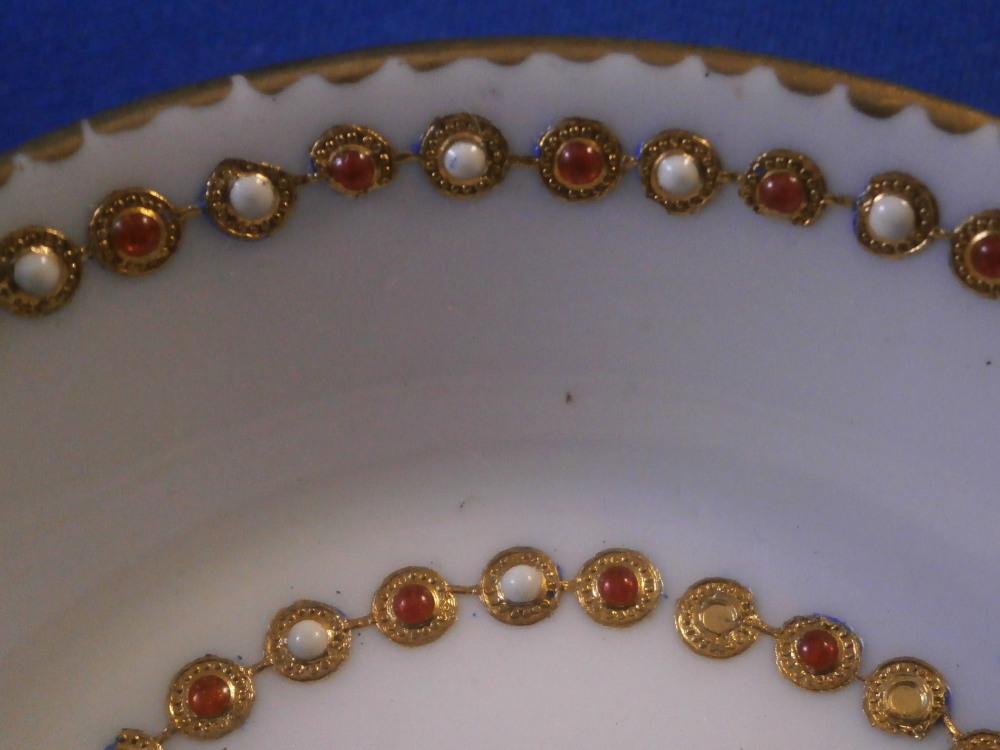 This is a really nice small saucer made by Sevres in the 18th century after 1780 when they started using the " jewelled " decoration. It is made of soft paste porcelain and decorated with applied 'jewels' - the little alternating raised white and red enamel dots on gold foil. Gold trim to the edge. There are two rings of these " jewels " one around the well and one on the rim. The enamel dots are are attached to little thin pieces of gold and then fired onto the porcelain which makes for an amazing look! Most of these are done later but this example was actually done at Sevres. Sadly it is just a small saucer no cup :( The dish is marked with the interlaced double L mark in gold with the letter LG under it which are probably for LeGrand who was a gilder at Sevres from 1776 until 1817. It also has some of the usual incised marks to the underside and the little hole in the foot ring from firing typical for Sevres pieces as shown. The saucer is in great condition with a couple of the jewels missing as seen in the pictures. Not bad and it displays nicely. minimal wear. The dish is 0.75 inches tall and just over 3 inches in diameter. Please email me for more information or other pictures.