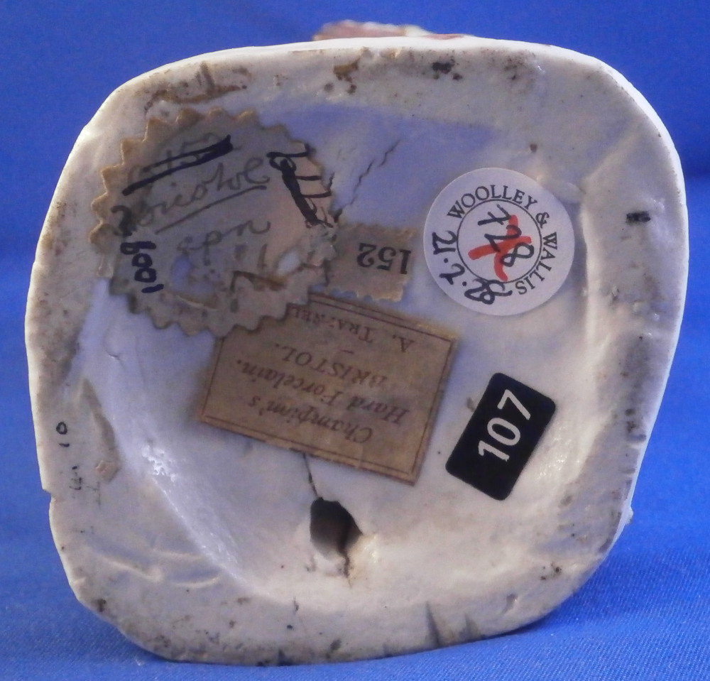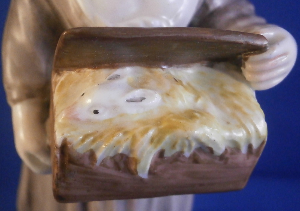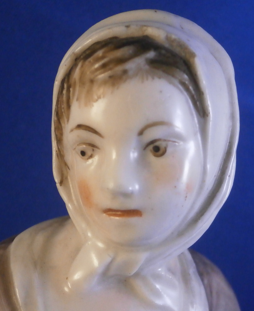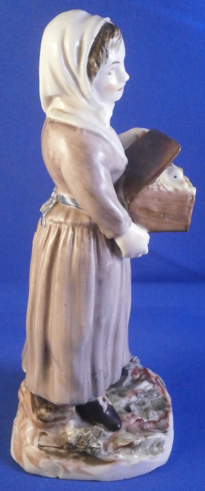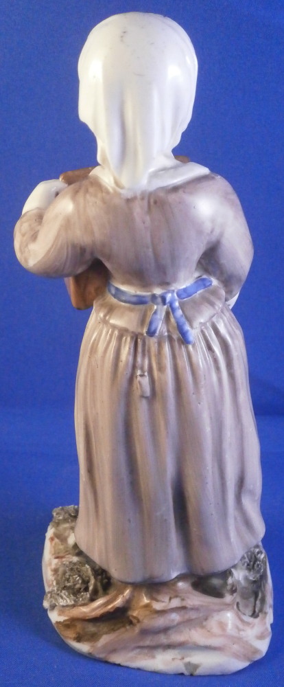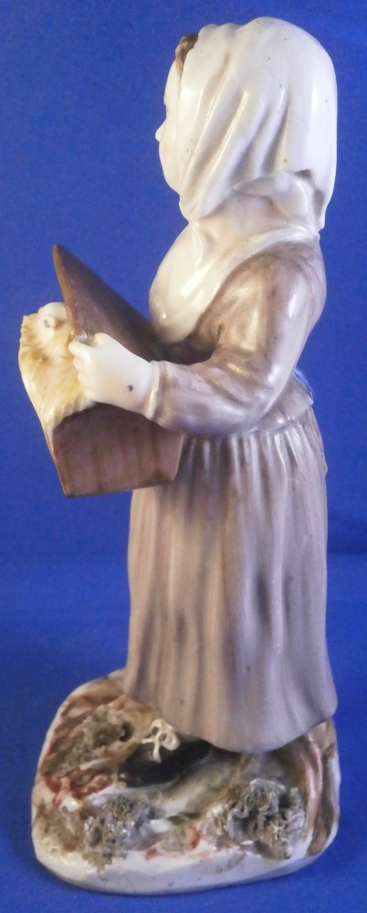 This is a very rare figurine made by Strassburg around 1775 during the period of Joseph Hannong . It is of a lady wearing a light brown outfit, a white head scarf and holding a box with an animal covered in straw in front of her. I think it is a rabbit but it's hard to tell. The figurine is nicely modeled and hand painted. She stands on a base painted with typical colors for this maker as well as fake grass bunches. The figure is no marked underneath but has a lot of old labels. Believed to be a Bristol piece which does not fit at all. The figurine is in great condition with two chips along the edge of the base as shown - one in the back and one to the left side when looking at her. The lid of the box has had the corner restored perfectly. The piece displays perfectly! It is 6.5 inches tall, 2.625 inches wide and 2.625 inches deep. Please email me for more information or other pictures.