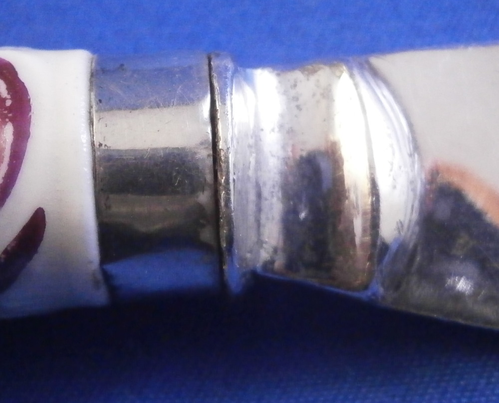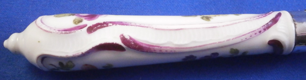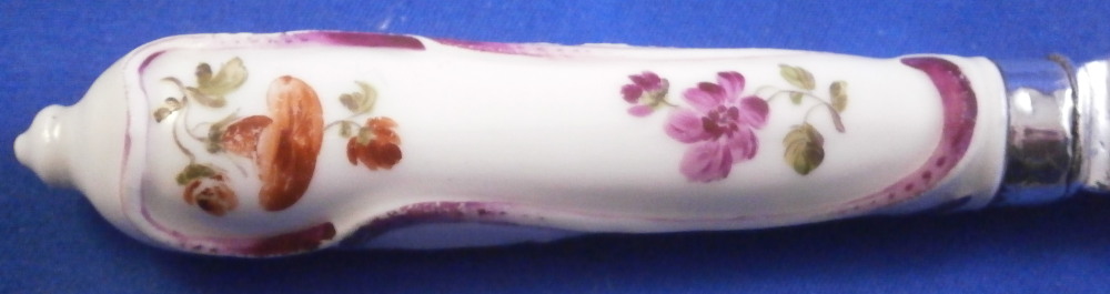 This is a rare knife handle made by Royal Viennaa in the 18th century. The handle is made of porcelain and has a relief design to it highlighted in puce plus two hand painted flowers to the top and two more on the bottom. A really nice looking handle! It comes with a blade and ferrule that are probably Silver though the markings are a bit off - looks like the blade is makred four times with the same mark. So I am not 100% on it being silver. Have a look for yourself! A great looking combo though with that superb porcelain handle and the silver blade! The porcelain and silver are in superb condition with a minor touch of wear to the porcelain. It displays perfectly! Not sure if the blade is contemporary to the porcelain or a later replacement but given the condition I assume it is a later replacement! The entire knife and handle are 9 inches long with the porcelain handle being 3.125 inches long, 0.75 inches wide and tall. Please email me for more information or other pictures.