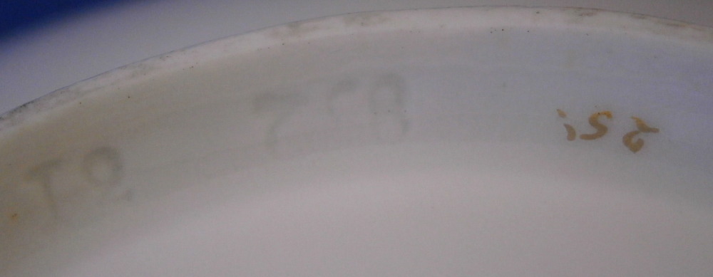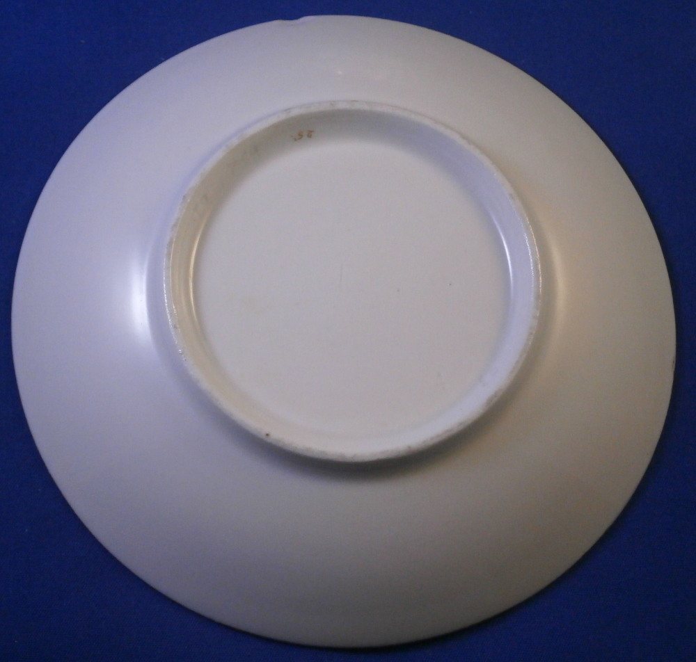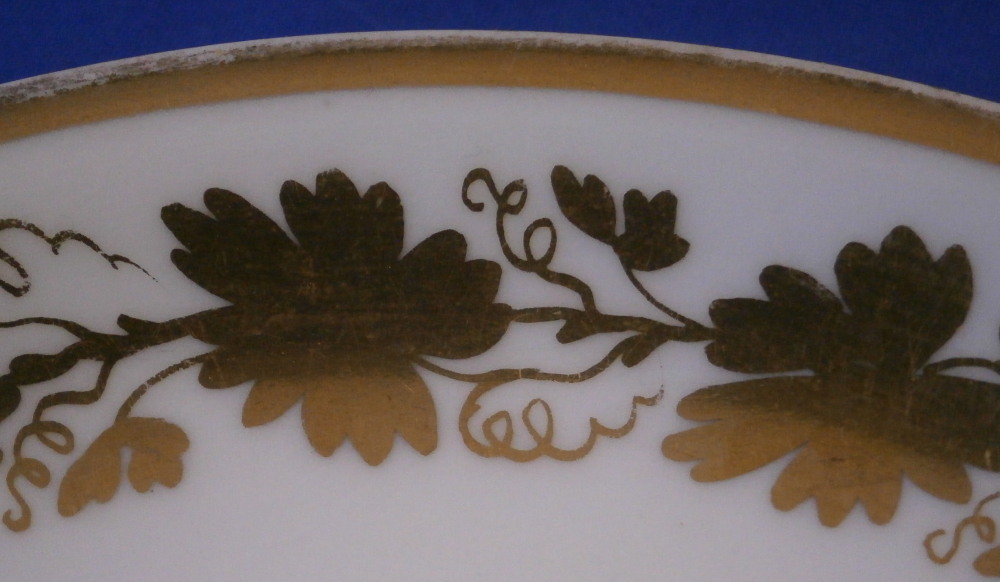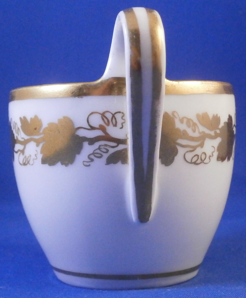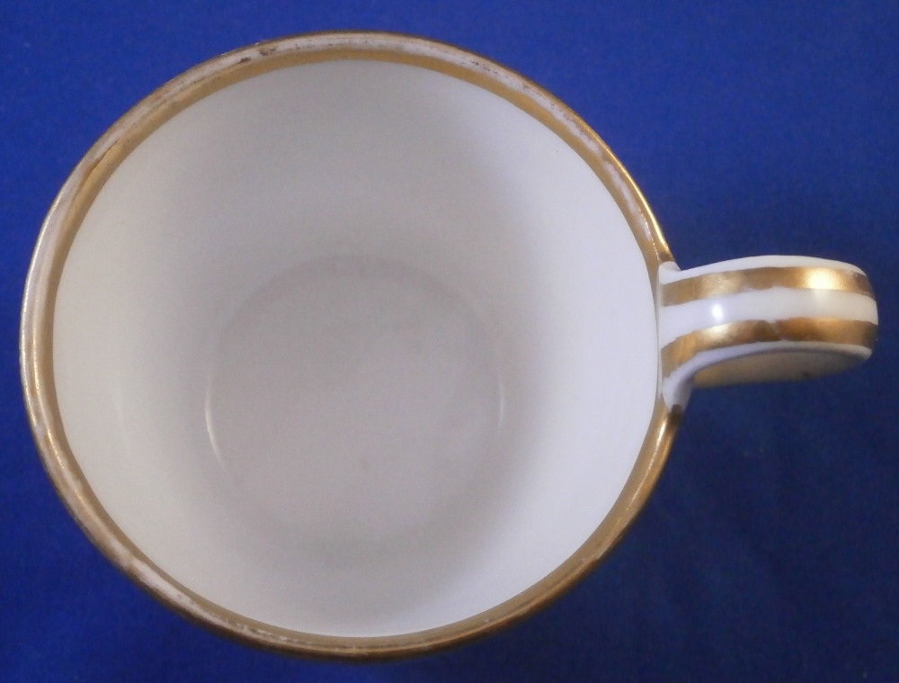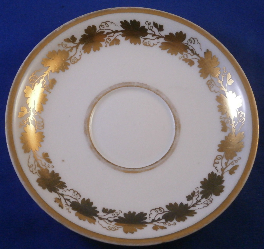 This is a cup and saucer made by Royal Vienna in the 19th century - the cup has the year mark for 1836 and the aucer for 1832. The set is hand painted with a gold grape leaf garland design as well as some gold trim to the edge and handle. A nicely shaped cup typical of the Biedermeier period. The set is in good condition with some wear to the gilding mostly to the top inner edge of the cup, the outer saucer edge and around the well. A chip to the underside edge of the saucer that is hard to spot from the top as shown from both views in my pictures. The cup is 2.25 inches tall plus another 0.75 if you include the handle and has a diameter of 2.625 inches. The saucer is 0.875 inches tall and 5.375 inches in diameter. Both are marked with the impressed shield mark as well as impressed year numbers, some other impressed numbers and a gilder's mark 25. as shown for Franz Janscha. Please email me for more information or photos.