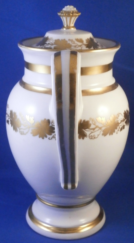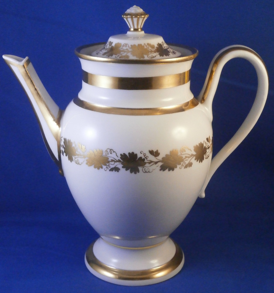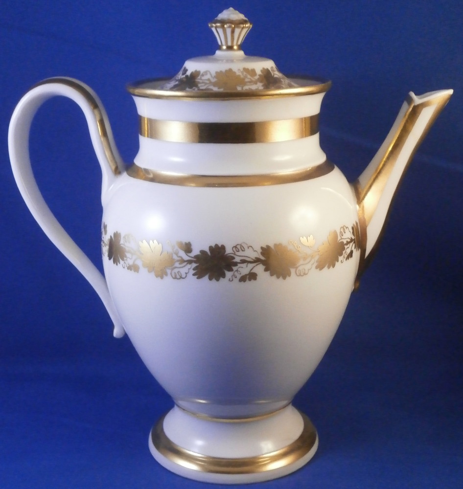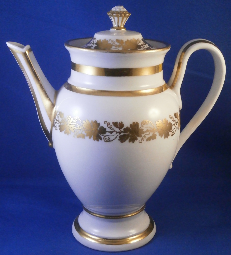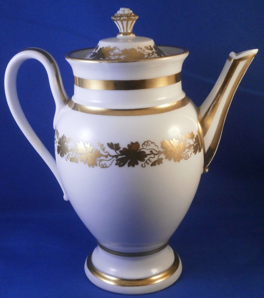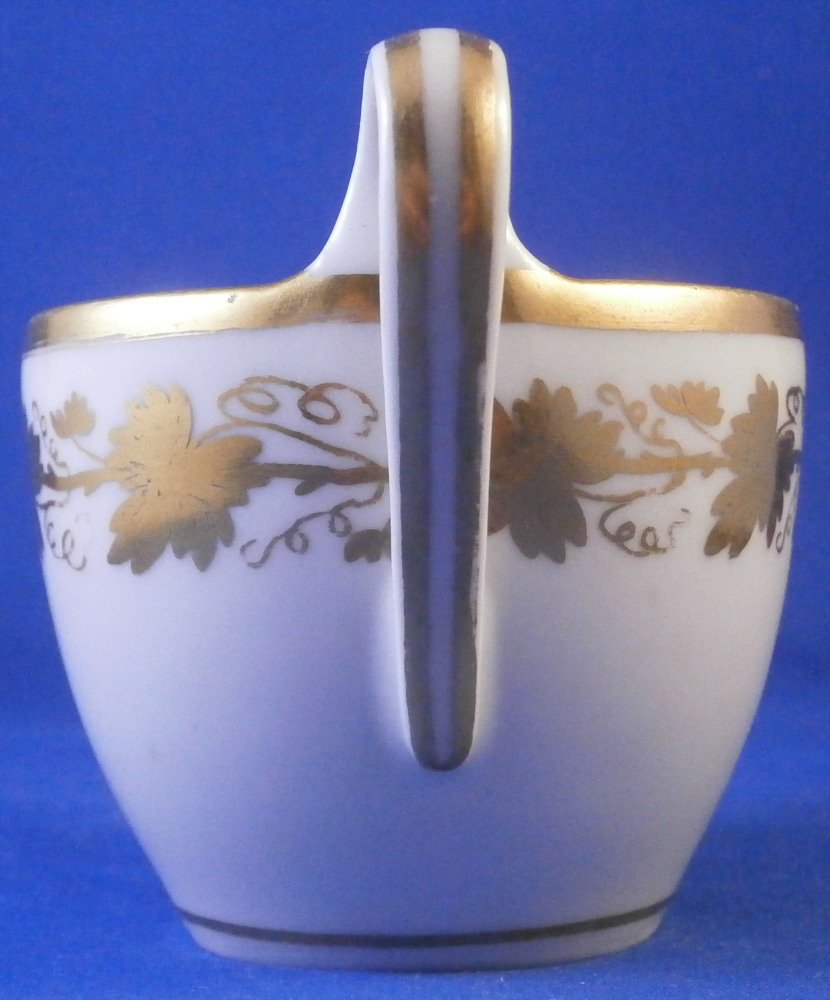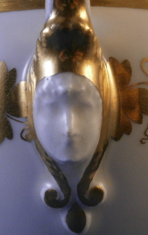 This is a great tete-a-tete or teaset for two made by Royal Vienna in the 19th century - in the 1830s. The entire set is hand painted with a gold grape leaf garland design as well as some gold trim to the edges, finials and handles. The sugar bowl has two superb face relief designs to it forming the base of its handles. A nice looking set more than likely for hot chocolate. There are two cups and saucers, a lidded sugar dish and two almost identical lidded pots. One likely for hot chocolate the other for milk or hot water. The set is in great condition with some wear to the gilding mostly to the gold ring around the well of the saucers. Otherwise the wear is minimal on the very edges. The cups are about 2.125 inches tall plus another ~0.75 if you include the handle and have a diameter of 2.625 inches. The saucers are 0.875 inches tall and one being just above 5.125 inches in diameter while the other is 5.375 inches in diameter. The sugar dish is 6.625 inches tall including the finial on the lid, 5 inches wide including the handles and 4.125 inches deep. The slightly smaller pot is 8 inches tall including the finial, 7.75 inches from handle to spout tip and 4.25 inches wide. And lastly the slightly larger pot is 8 inches tall including the finial, 7 inches from handle to spout tip and 4.25 inches wide. All pieces are marked with the impressed shield mark, as well as some other impressed and gilder's marks. The gilder's number seems to be 25 on most pieces for Franz Janscha . The year codes are in the early to mid 1830s. 832 for 1832, 836 for 1836 and 834 for 1834. Some are impossible to make out. Just a really nice set that's is almost 200 years old now. Please email me for more information or photos.