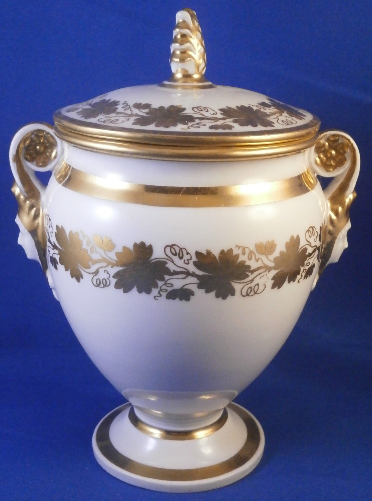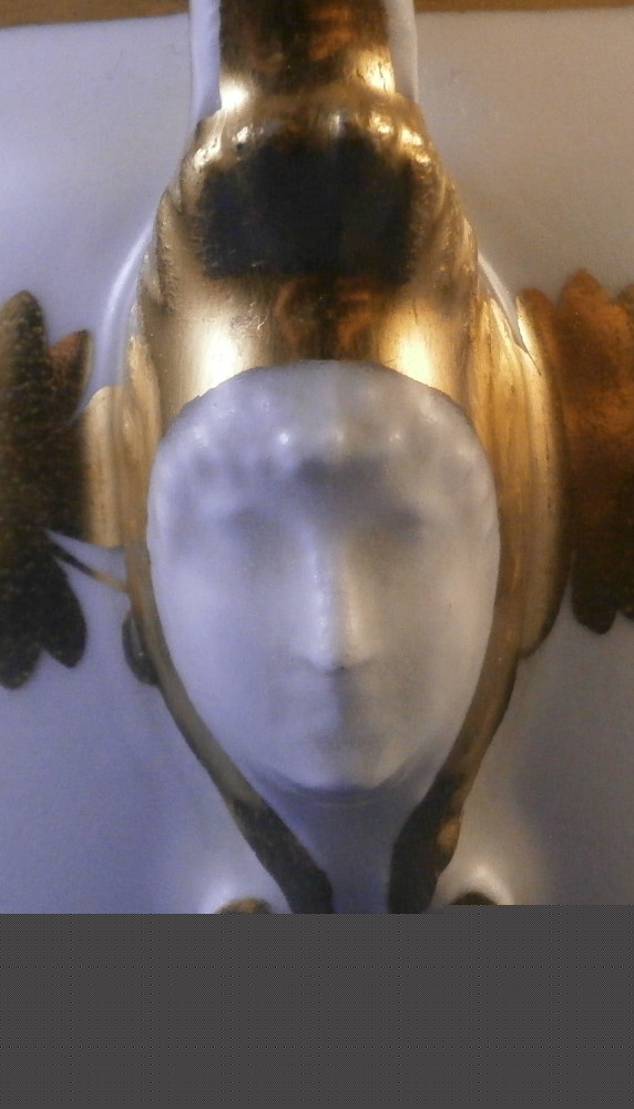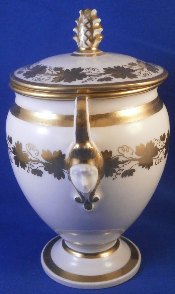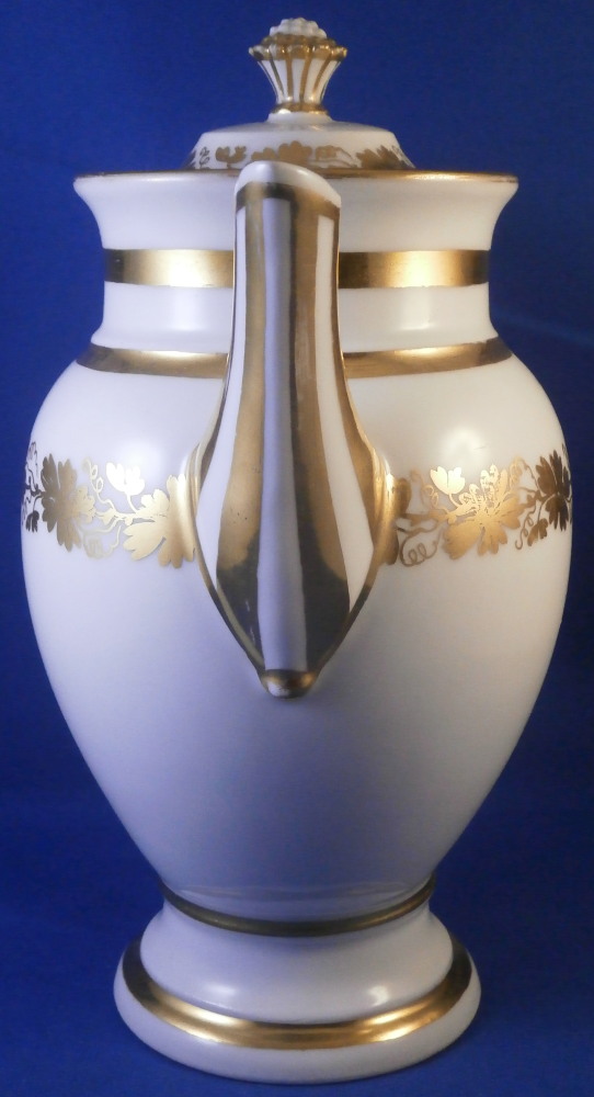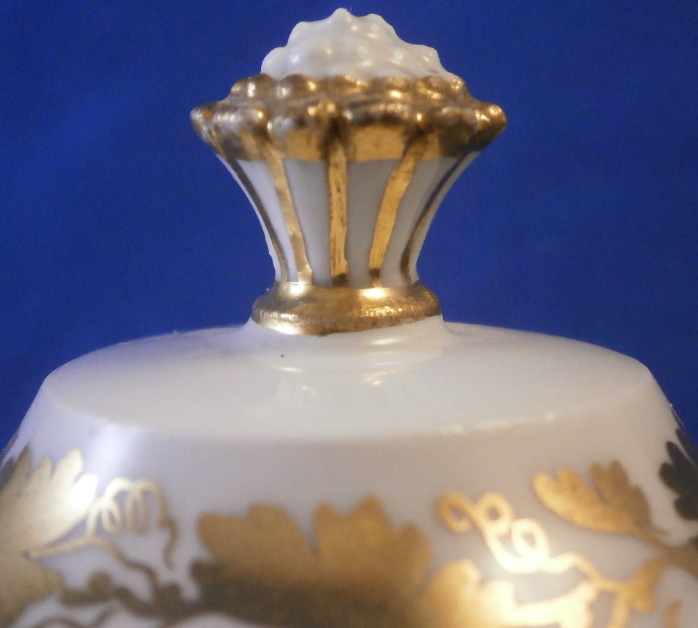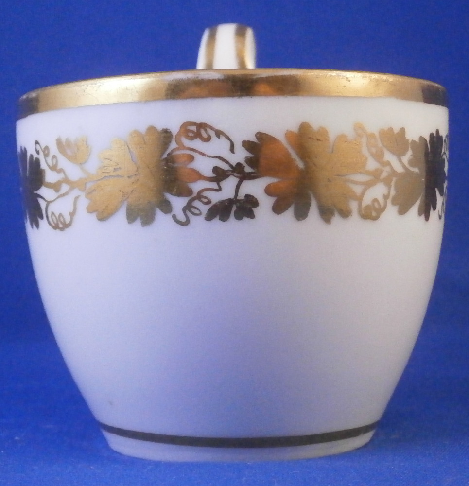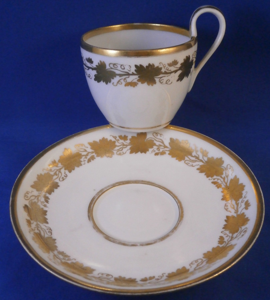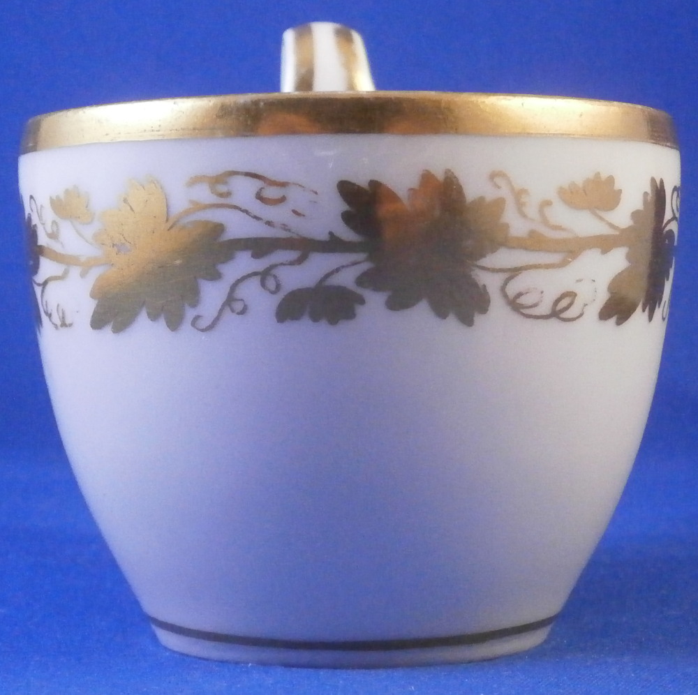 This is a great tete-a-tete or teaset for two made by Royal Vienna in the 19th century - in the 1830s. The entire set is hand painted with a gold grape leaf garland design as well as some gold trim to the edges, finials and handles. The sugar bowl has two superb face relief designs to it forming the base of its handles. A nice looking set more than likely for hot chocolate. There are two cups and saucers, a lidded sugar dish and two almost identical lidded pots. One likely for hot chocolate the other for milk or hot water. The set is in great condition with some wear to the gilding mostly to the gold ring around the well of the saucers. Otherwise the wear is minimal on the very edges. The cups are about 2.125 inches tall plus another ~0.75 if you include the handle and have a diameter of 2.625 inches. The saucers are 0.875 inches tall and one being just above 5.125 inches in diameter while the other is 5.375 inches in diameter. The sugar dish is 6.625 inches tall including the finial on the lid, 5 inches wide including the handles and 4.125 inches deep. The slightly smaller pot is 8 inches tall including the finial, 7.75 inches from handle to spout tip and 4.25 inches wide. And lastly the slightly larger pot is 8 inches tall including the finial, 7 inches from handle to spout tip and 4.25 inches wide. All pieces are marked with the impressed shield mark, as well as some other impressed and gilder's marks. The gilder's number seems to be 25 on most pieces for Franz Janscha . The year codes are in the early to mid 1830s. 832 for 1832, 836 for 1836 and 834 for 1834. Some are impossible to make out. Just a really nice set that's is almost 200 years old now. Please email me for more information or photos.