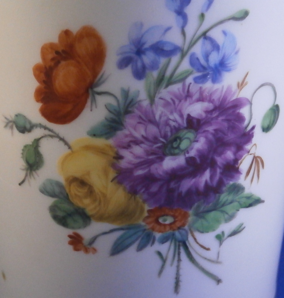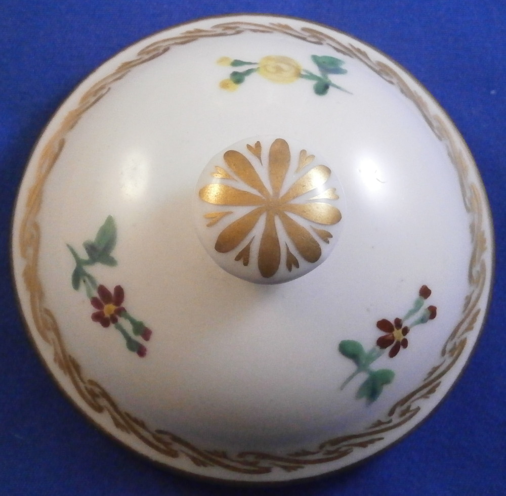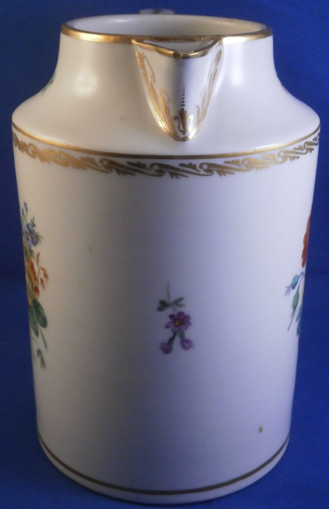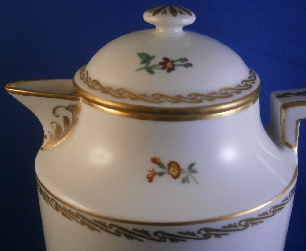 This is a great coffee pot made by Royal Vienna in the 18th century before they used their date code system - so before 1783. The pot is hand painted with a nice floral arrangement to each side as well as a single small flower near the handle and spout. The rim of the main body also has a single flower to either side and the lid has three. A nice gold trim to the top edge of the main body, lid edge as well as the spout and handle plus a nice design to the finial of the lid. The pot is in great condition with just some minor chipping to the spout tip as shown gilded over to hide them better. Two black firing spots on the white ground. The gilding is in superb condition! The pot is 7.125 inches tall including the lid, 5.75 inches from handle to spout end and about 4 inches in diameter. The bottom is marked with the under glaze beehive / shield mark as well as an incised number 2 and a painter's number 36 which is for Michael Schulz I believe. Please email me for more information or photos.