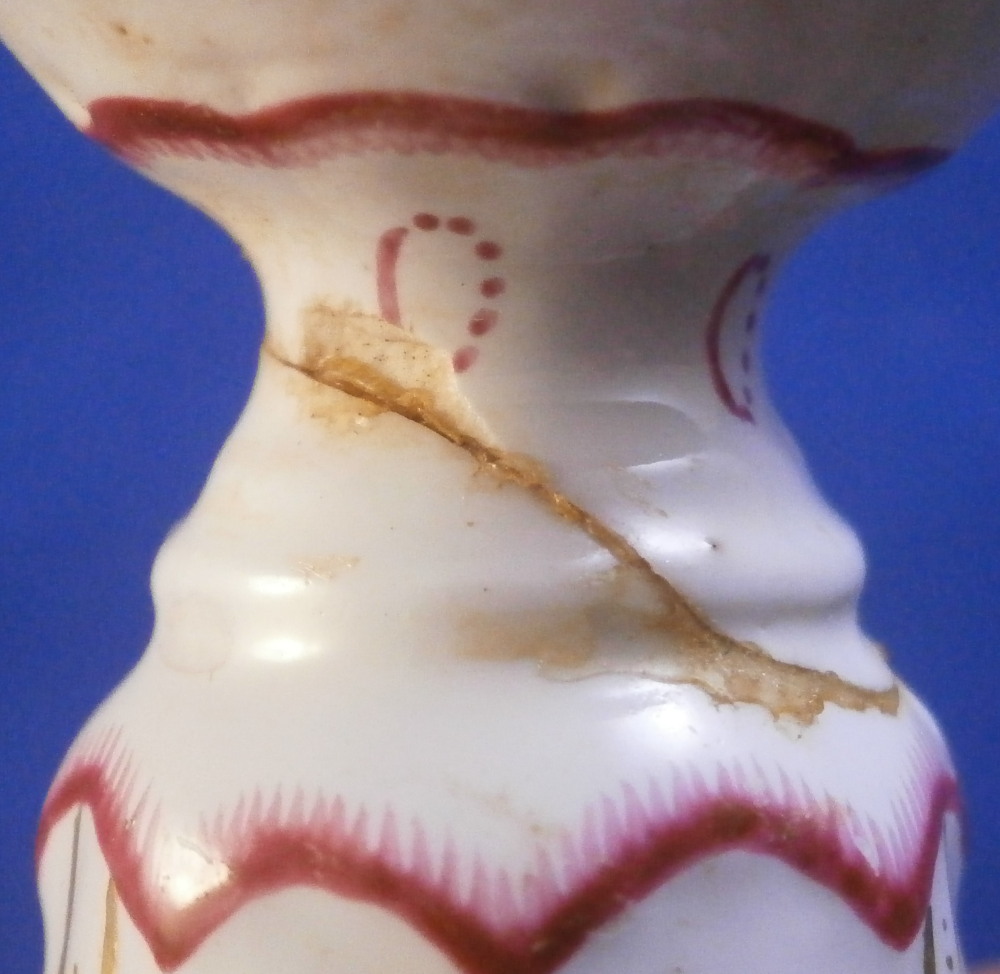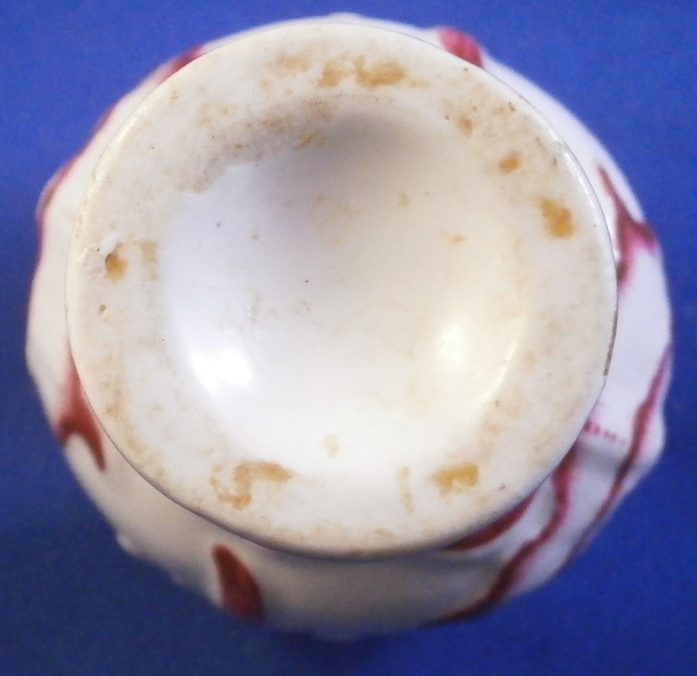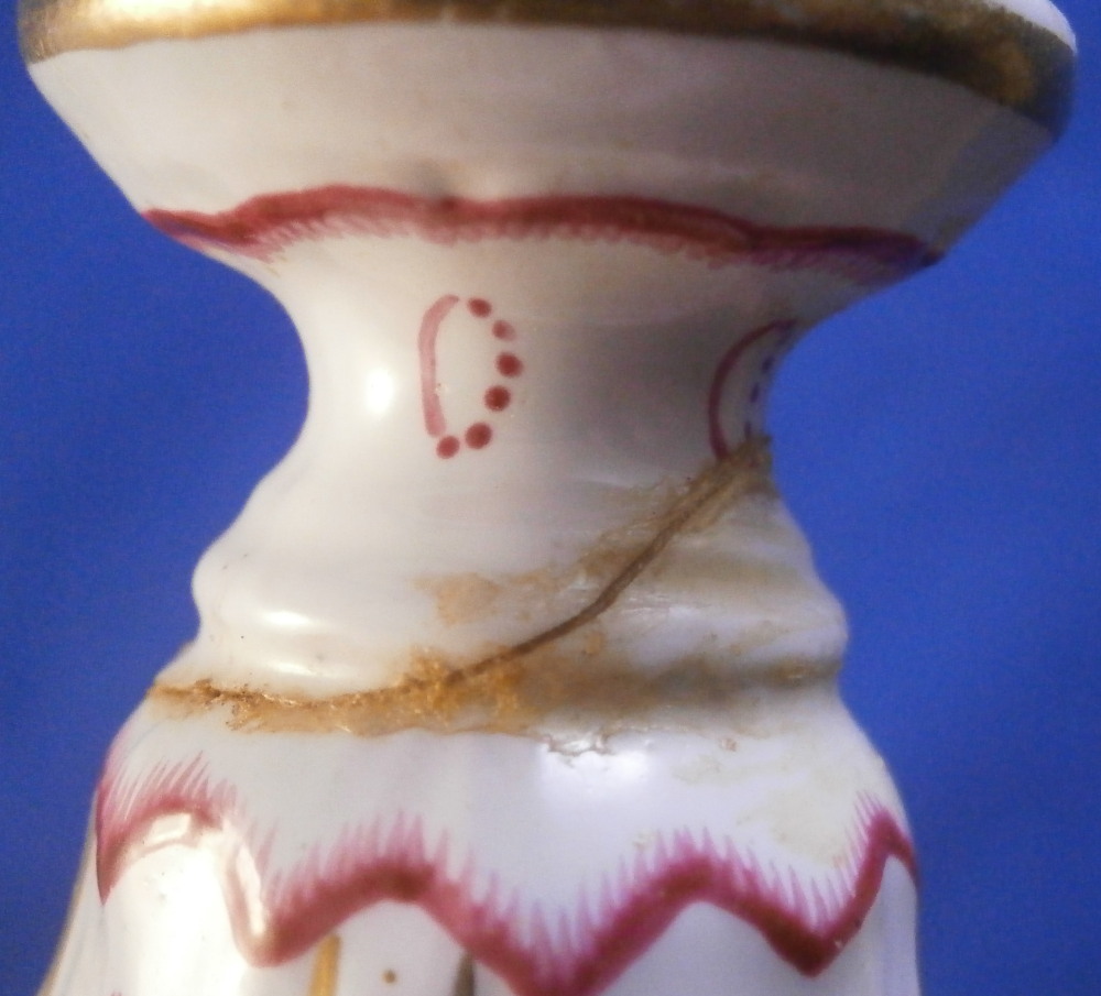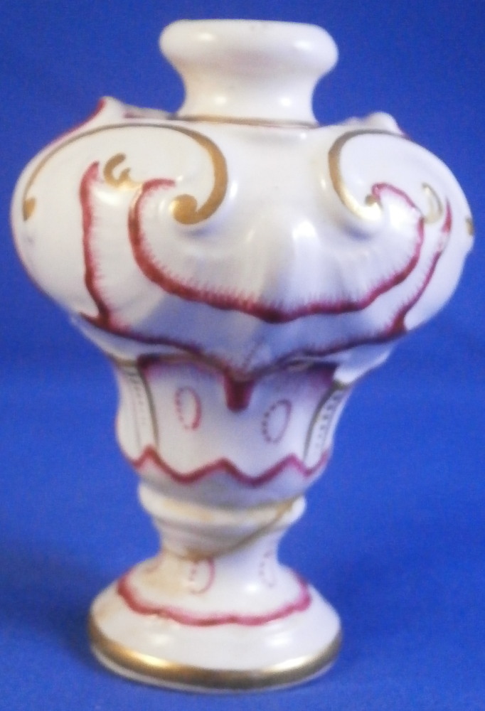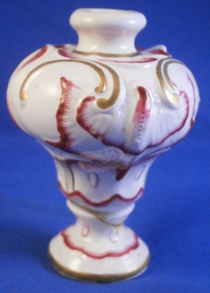 This is a small vase or maybe a scent bottle made by Royal Vienna in about 1770. The Vienna examples I found has a square base attached to the bottom which this one here does not. Does not mean much but it could also be by another maker during this period. It has a nice shape to it with lots of relief details highlighted with gilding and puce trim. The piece is in OK condition but was broken through the thin part of the bottom and reglued with some nasty old glue. Could easily be imrpoved or made to look perfect again by a decent restorer! The vase is 2.75 inches tall and 1.875 inches in diameter. It is not marked underneath. It could also be Italian possibly Cozzi by the look of the paste and colors. Please email me for more information or photos.