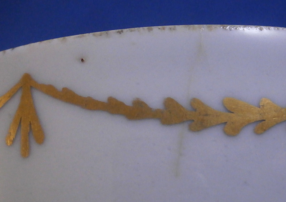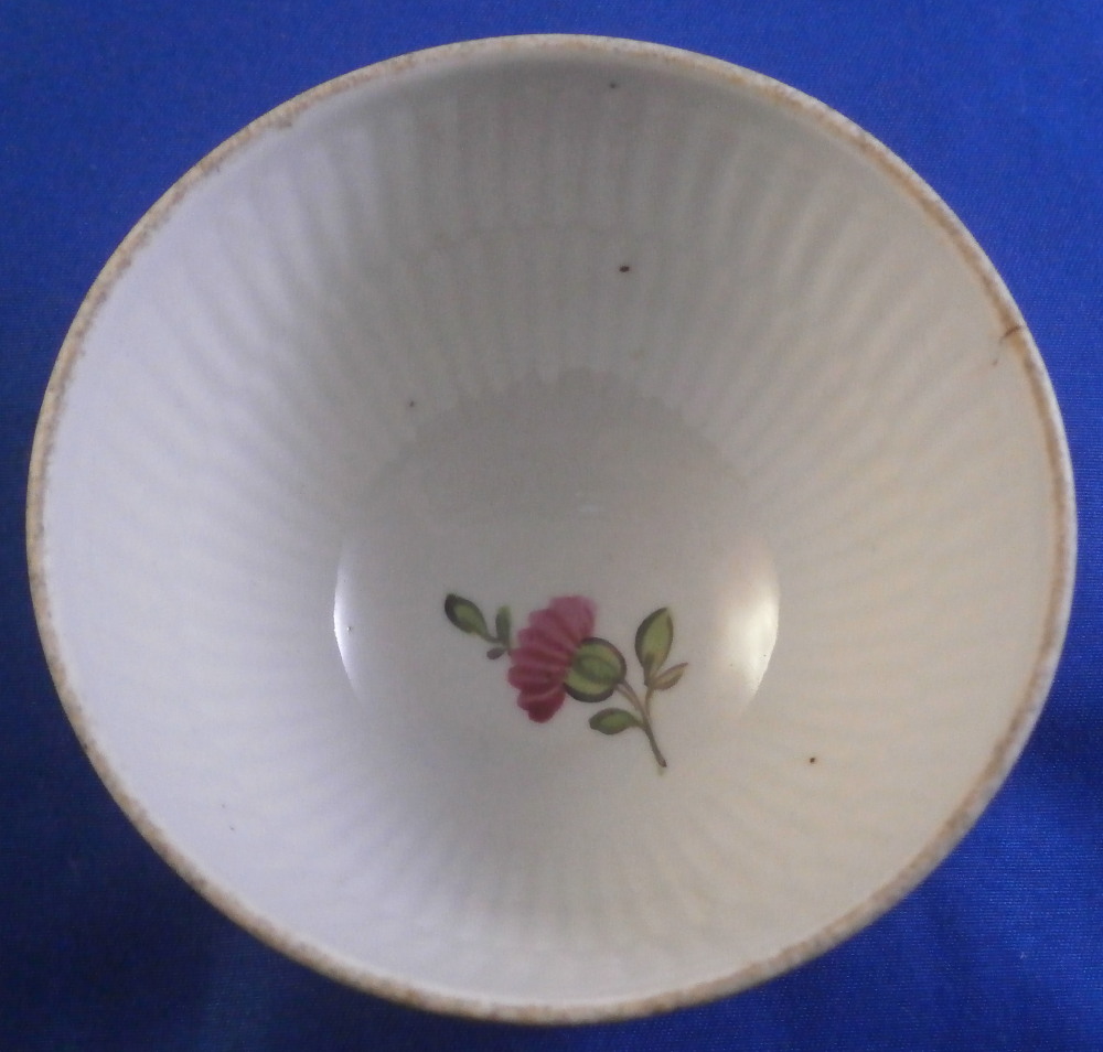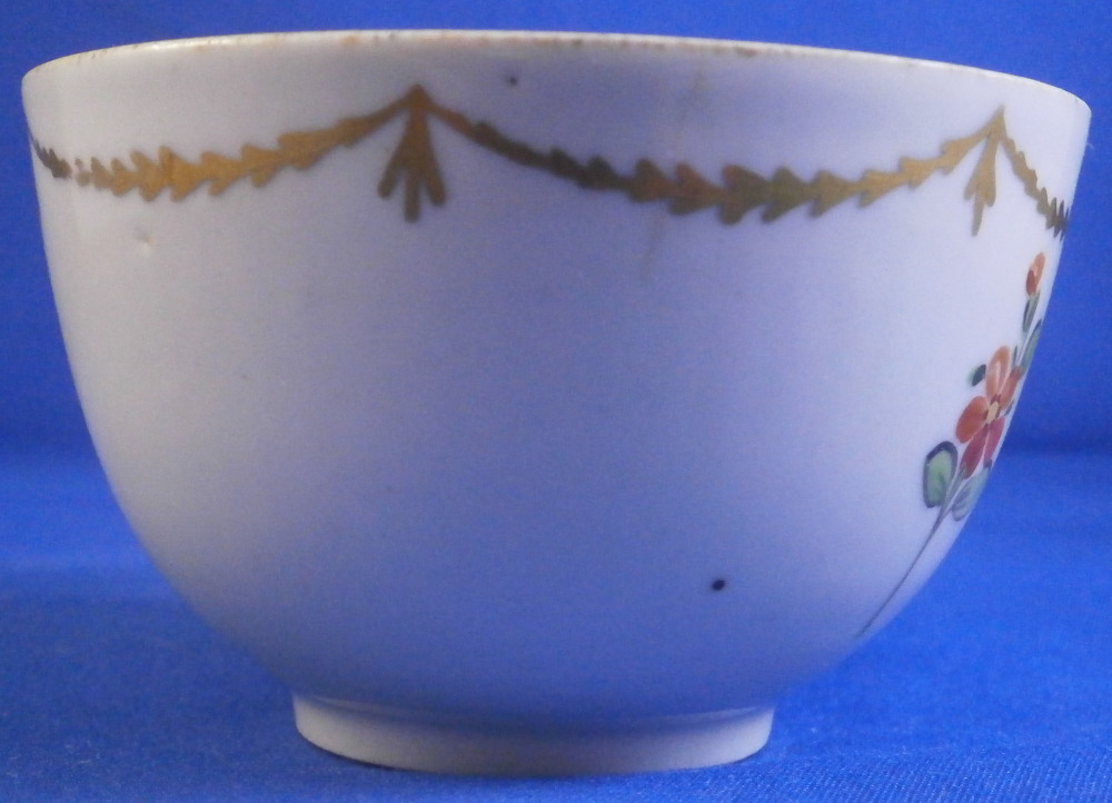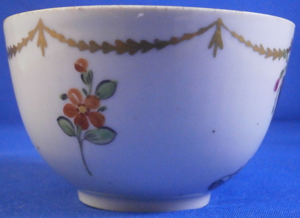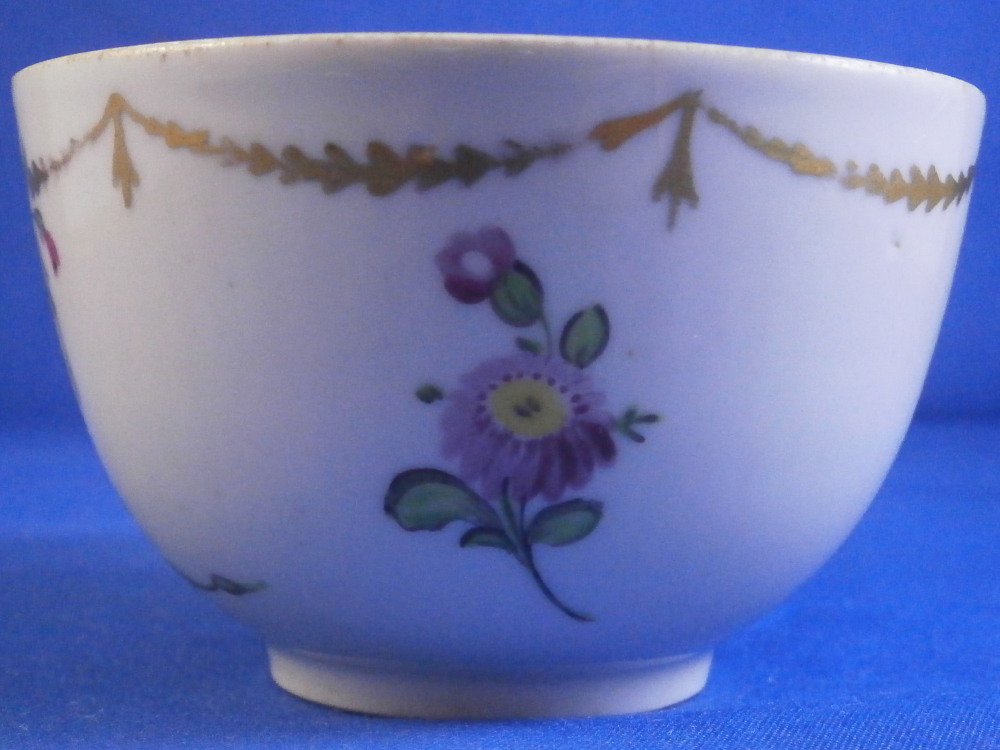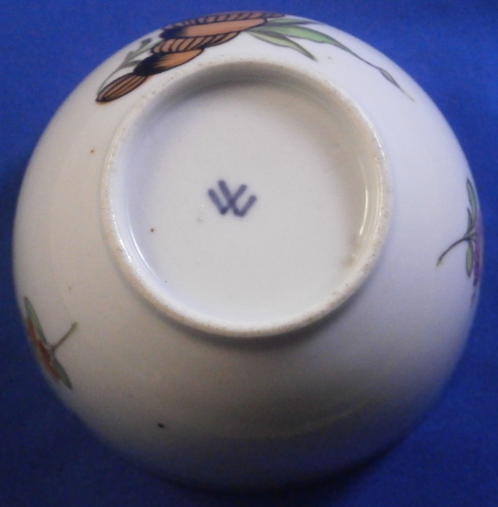 This is a nice single cup made by Wallendorf in the 18th century. It is hand painted with a nice design of a cornucopia filled with flowers, a golden garland around the top edge all around as well as two single flowers filling in ther est of the space. Another single flower to the bottom inside. Nice ribbed design to the paste itself on inside which is quite typical of this maker! No handle so this is a Koeppchen style cup. The piece is in great condition with a firing line to the inside edge only, a short tight hairline from the top edge and a few minor firings flaws in the form of tiny black spots common to their early wares. A very nice example! The cup is 1.875 inches tall and 3 inches in diameter.Marked underneath with their under glaze blue W mark as shown as well as an impressed letter L. Please email me for more information or photos.
