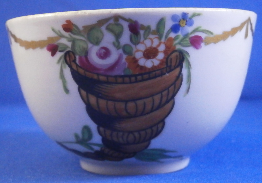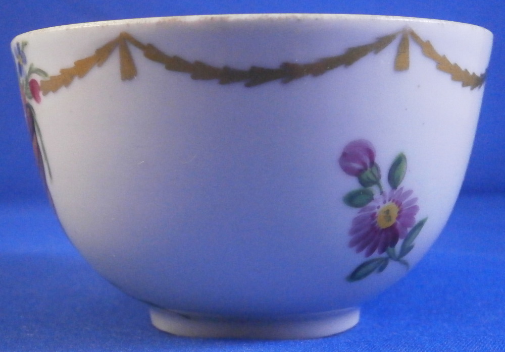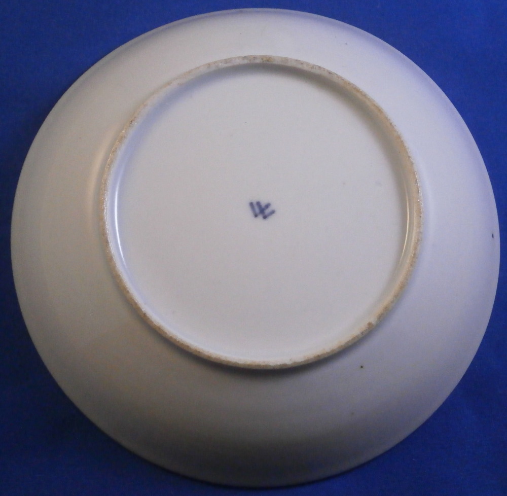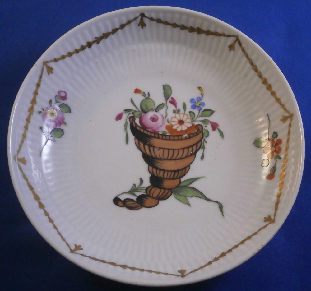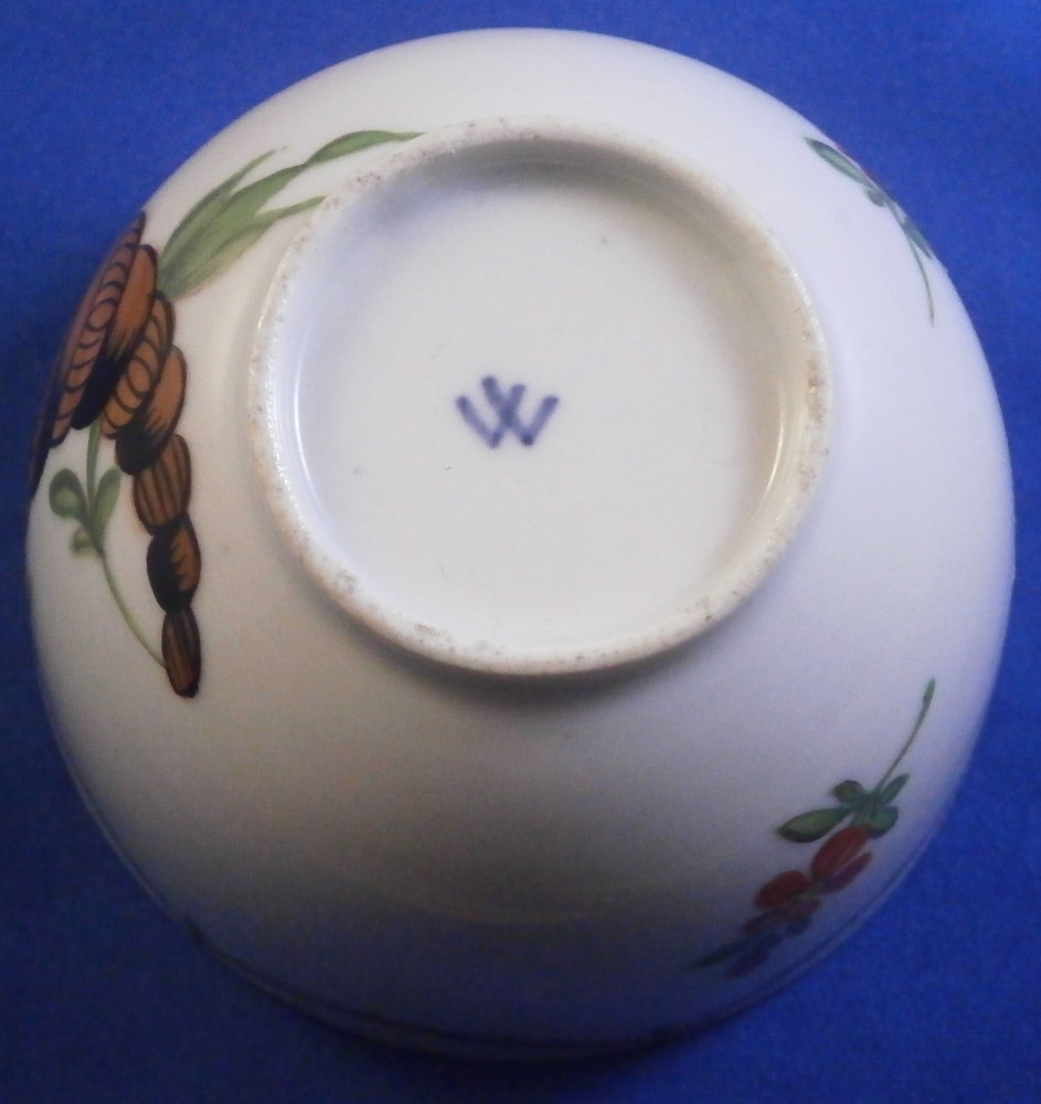 This is a really fun cup and saucer set made by Wallendorf in the 18th century. Both pieces are hand painted with a nice design of a cornucopia filled with flowers, a golden garland around the top edge all around as well as two single flowers filling in the rest of the space. Another single flower to the bottom inside of the cup. Nice ribbed design to the paste itself on inside of both pieces which is quite typical of this maker! No handle so this is a Koeppchen style cup. The set is in superb condition with jsut one small spot of wear to the top edge of the cornucopia of the saucer. A few minor firings flaws in the form of tiny black spots common to their early wares. A very nice example! The cup is 1.875 inches tall and 3 inches in diameter. The saucer is 1.125 inches tall with a diameter of 5.125 inches. Both are marked underneath with their under glaze blue W mark as shown as well as an impressed letter L under the cup. Please email me for more information or photos.