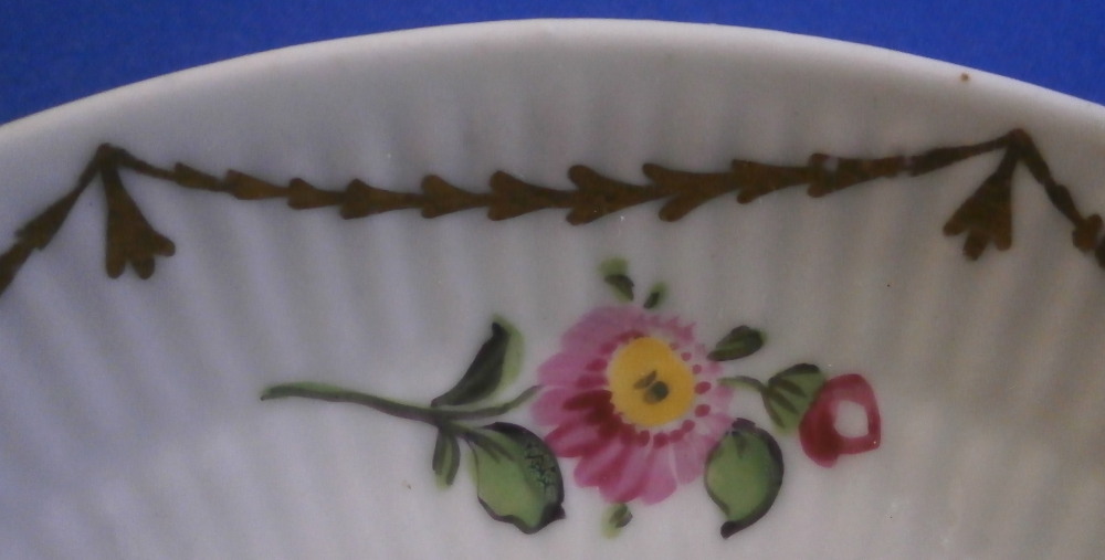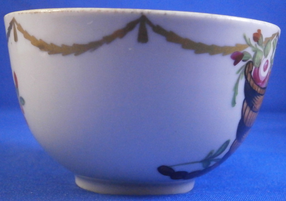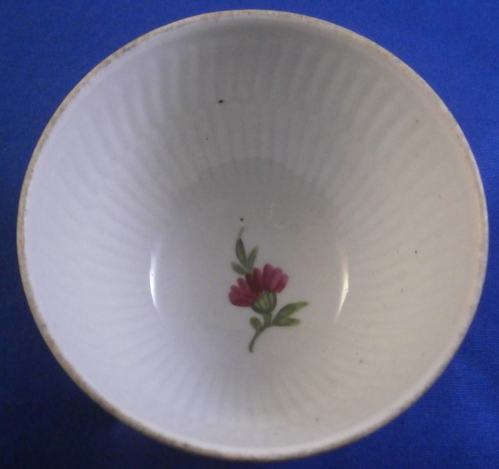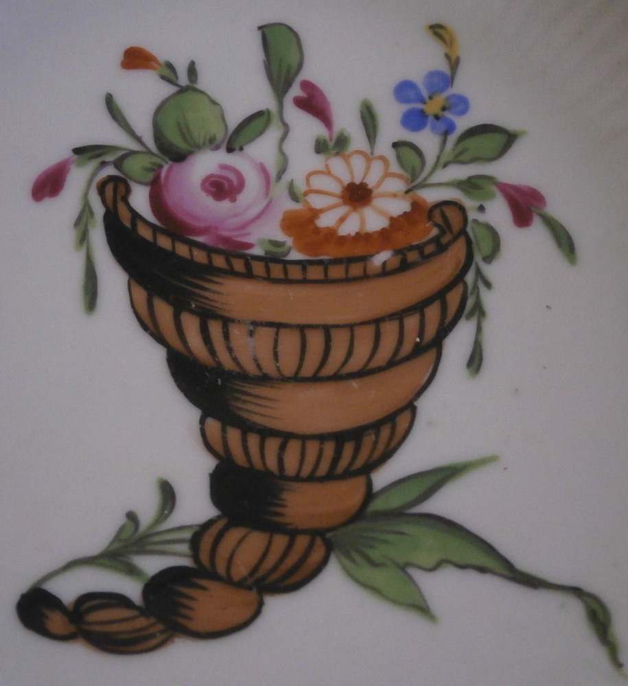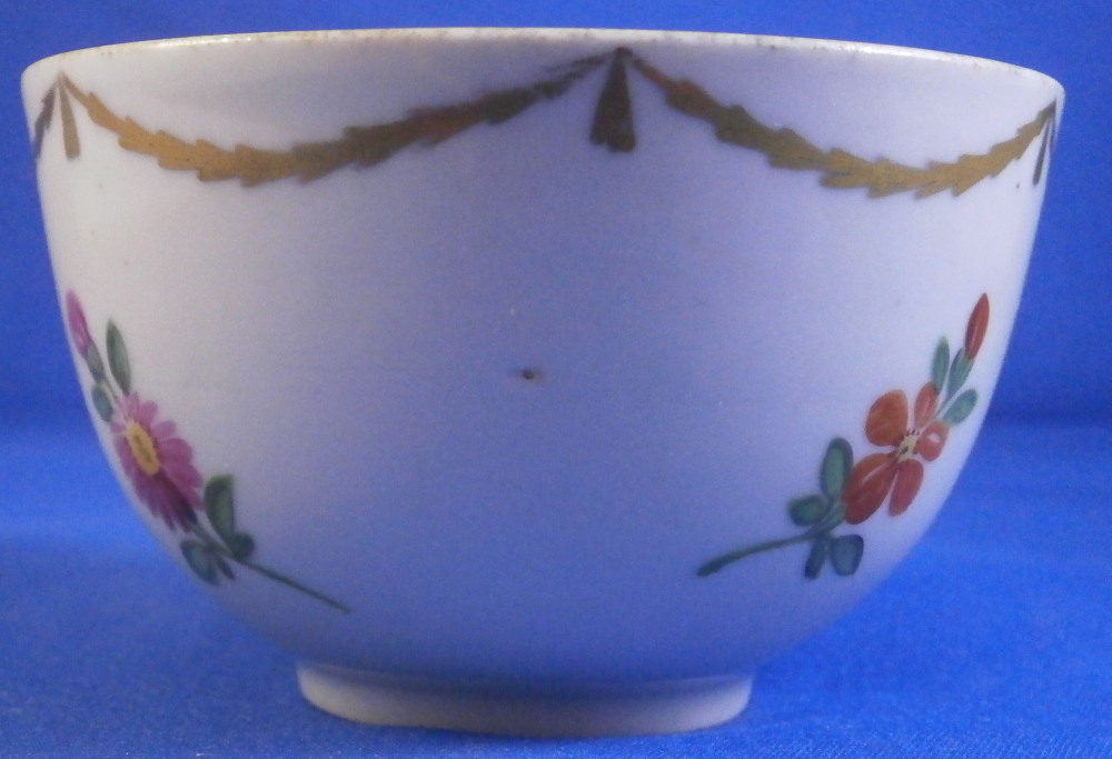 This is a really fun cup and saucer set made by Wallendorf in the 18th century. Both pieces are hand painted with a nice design of a cornucopia filled with flowers, a golden garland around the top edge all around as well as two single flowers filling in the rest of the space. Another single flower to the bottom inside of the cup. Nice ribbed design to the paste itself on inside of both pieces which is quite typical of this maker! No handle so this is a Koeppchen style cup. The set is in superb condition with jsut one small spot of wear to the top edge of the cornucopia of the saucer. A few minor firings flaws in the form of tiny black spots common to their early wares. A very nice example! The cup is 1.875 inches tall and 3 inches in diameter. The saucer is 1.125 inches tall with a diameter of 5.125 inches. Both are marked underneath with their under glaze blue W mark as shown as well as an impressed letter L under the cup. Please email me for more information or photos.
