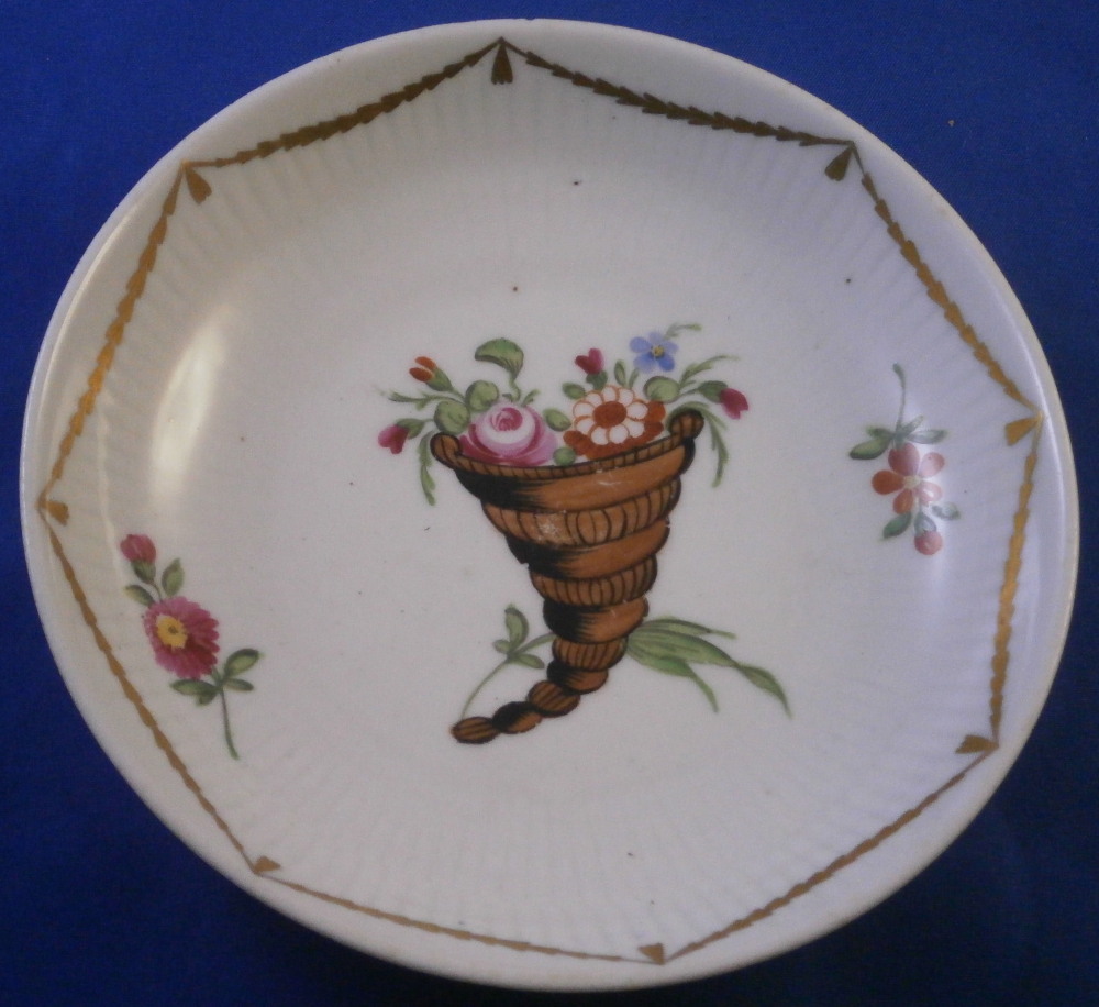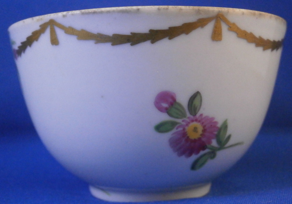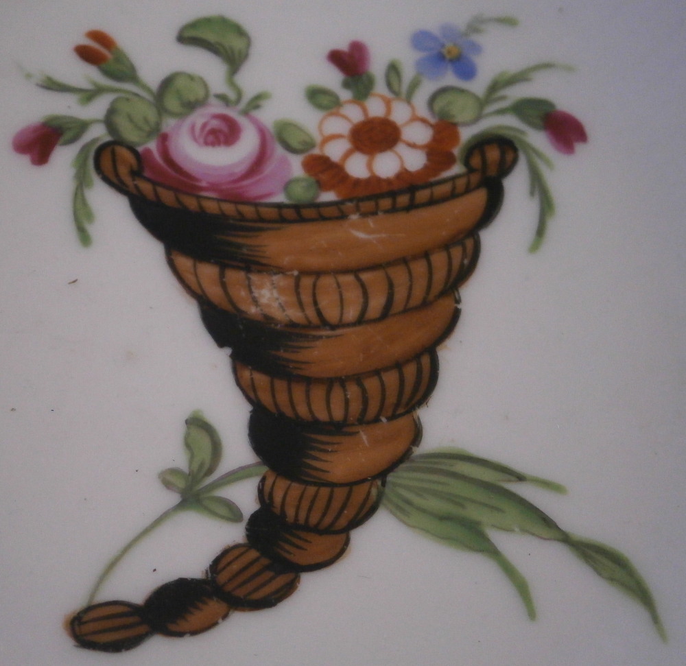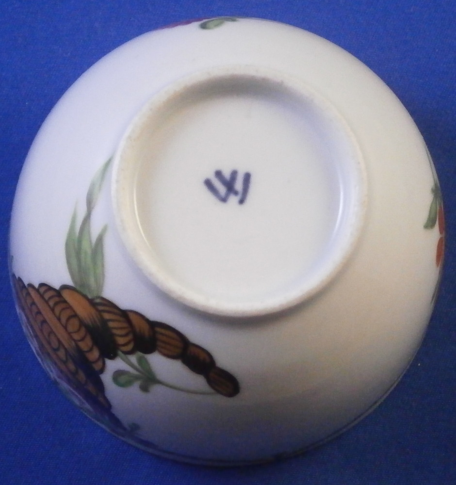 This is a really fun cup and saucer set made by Wallendorf in the 18th century. Both pieces are hand painted with a nice design of a cornucopia / horn of plenty filled with flowers, a golden garland around the top edge all around as well as two single flowers filling in the rest of the space. Another single flower to the bottom inside of the cup. Nice ribbed design to the paste itself on inside of both pieces which is quite typical of this maker! No handle so this is a Koeppchen / teabowl style cup. The set is in superb condition with just a few minor firings flaws in the form of tiny black spots common to their early wares and a few small scratches from use and a really tiny chip (and I mean nibble size) to the saucers very edge but it is still a very nice example! The cup is 1.875 inches tall and 3 inches in diameter. The saucer is 1.125 inches tall with a diameter of 5.25 inches. Both are marked underneath with their under glaze blue W mark as shown as well as an impressed letter L. Please email me for more information or photos.