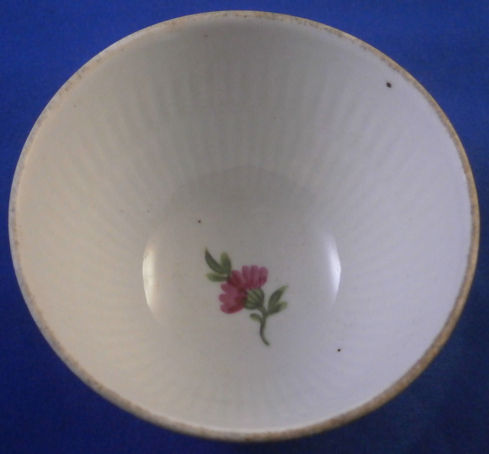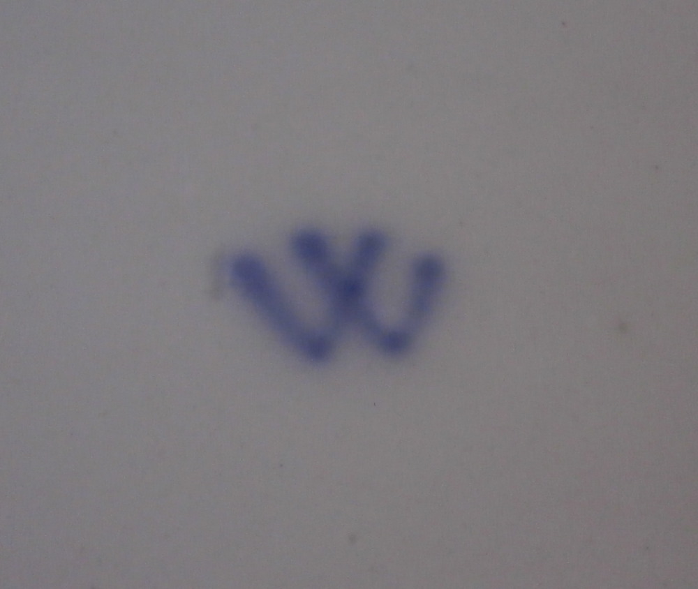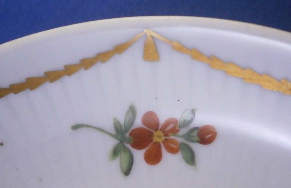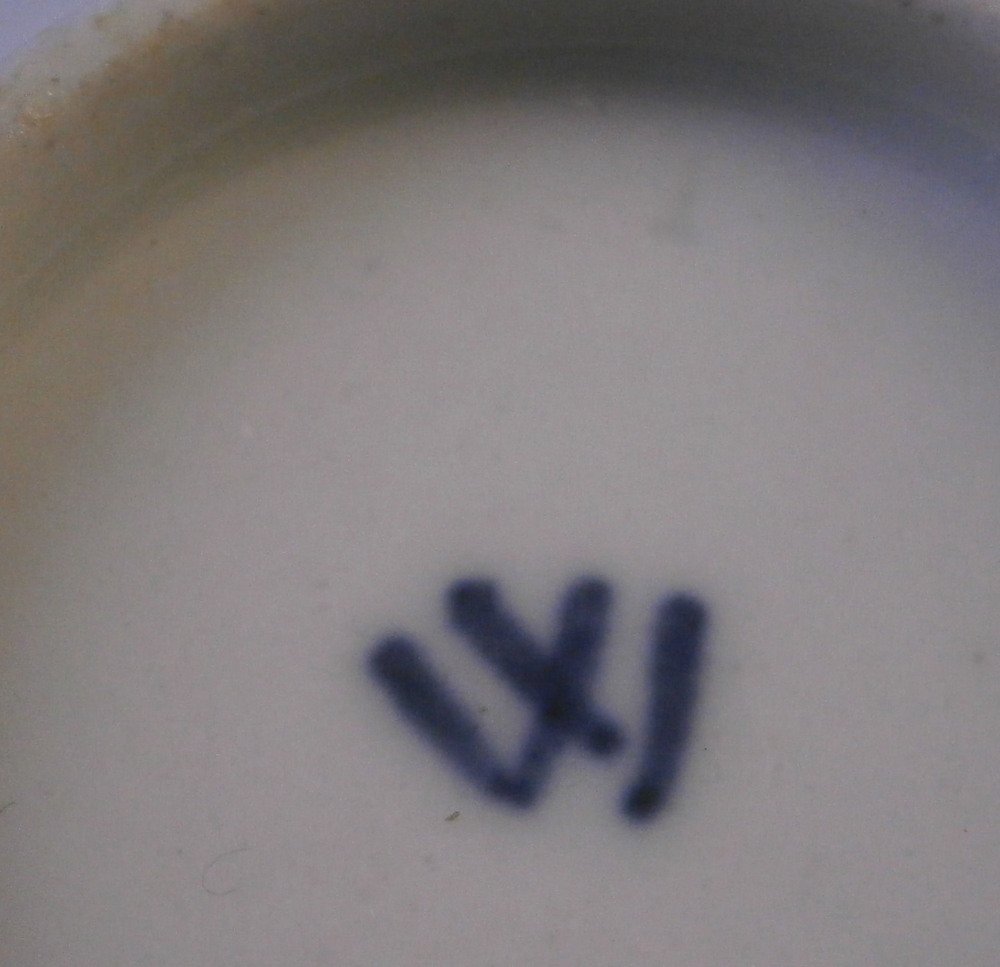 This is a really fun cup and saucer set made by Wallendorf in the 18th century. Both pieces are hand painted with a nice design of a cornucopia / horn of plenty filled with flowers, a golden garland around the top edge all around as well as two single flowers filling in the rest of the space. Another single flower to the bottom inside of the cup. Nice ribbed design to the paste itself on inside of both pieces which is quite typical of this maker! No handle so this is a Koeppchen / teabowl style cup. The set is in superb condition with just a few minor firings flaws in the form of tiny black spots common to their early wares and a few small scratches from use and a really tiny chip (and I mean nibble size) to the saucers very edge but it is still a very nice example! The cup is 1.875 inches tall and 3 inches in diameter. The saucer is 1.125 inches tall with a diameter of 5.25 inches. Both are marked underneath with their under glaze blue W mark as shown as well as an impressed letter L. Please email me for more information or photos.