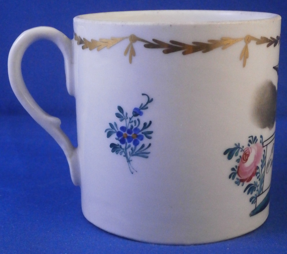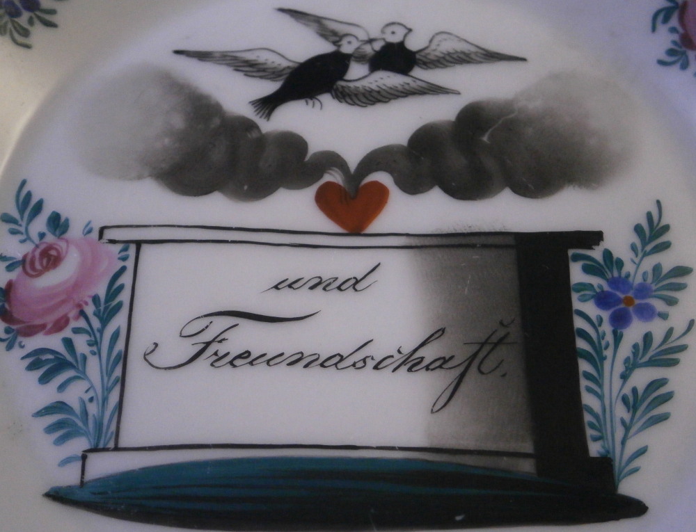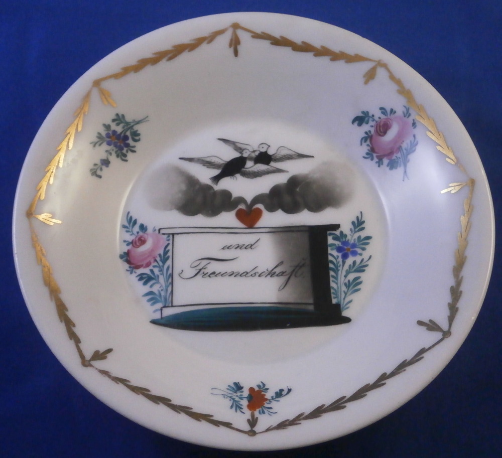 This is a nice cup and saucer made by Wallendorf in the earlier 19th century probably around 1820. Not quite as nice as the original 18th century design but still very nice and with a nice message. The set is hand painted with a nice design of two doves on top of two smoking hearts on a pedestal. The cup has "Eternal love (Ewige Liebe) " written on in and the saucer "and friendship (und Freundschaft)". Nice gold trim as well. Flowers to both sides of the altar as well as scattered around the rest of the white area to fill in the areas nicely. Gold trim to the handle. The set is in nice condition with an underside rim chip to the saucer that is just barely visible from the top. The saucer is just over 1 inch tall and 5.25 inches in diameter. The cup is just under 2.5 inches tall and 2.375 inches in diameter. Both pieces are unmarked but definitely from this maker and period. Please email me for more information or photos.