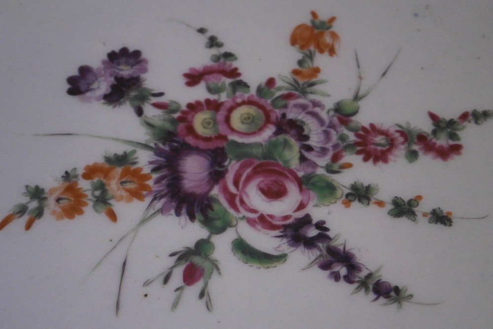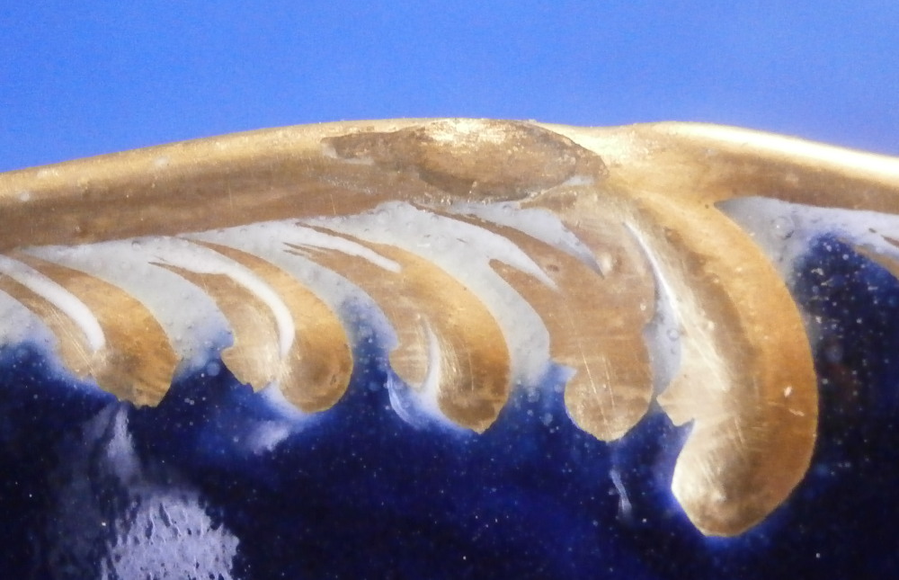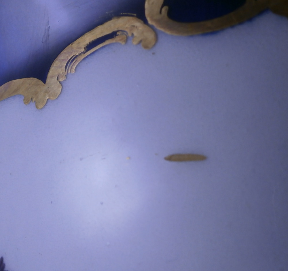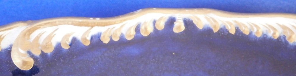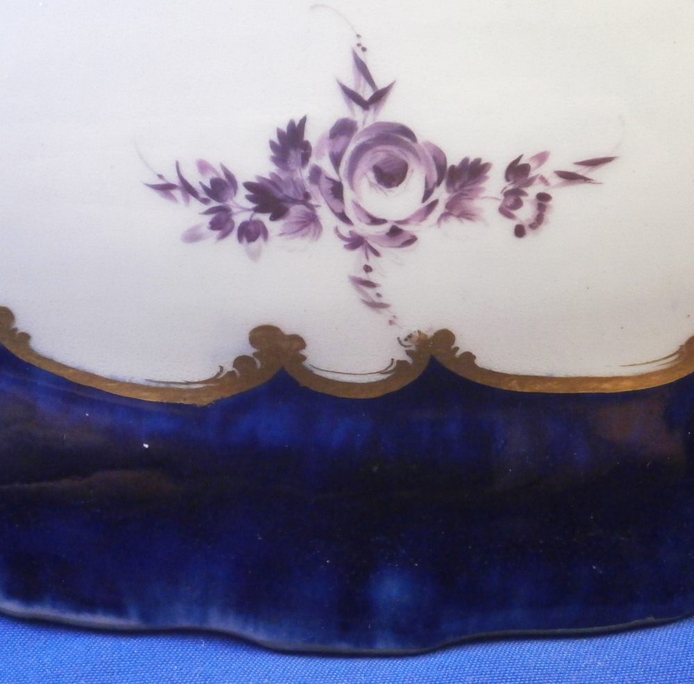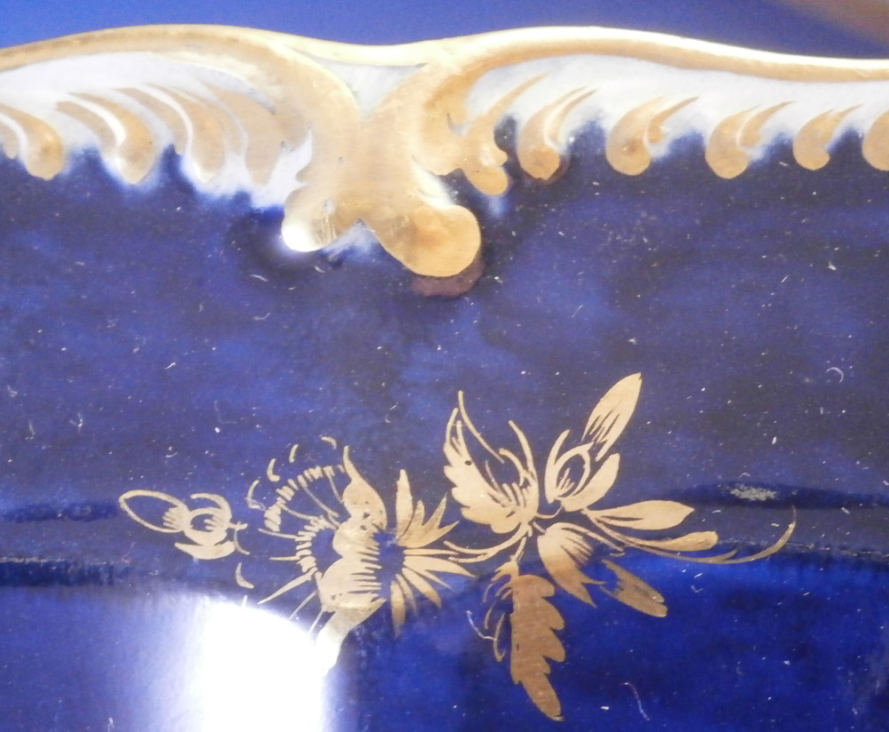 This is a very rare serving dish / compote made by Worcester in the 18th century around 1770. I have never come across a large piece like this in this sort of design. A rare survivor for sure! It is handpainted on the top inside with a nice polychrome floral arrangement in the center, a cobalt blue ground colored rim with and amazing gold trim around the center well plus four gold flowers. The top edge has a relief design to it highlighted with gilding. The outside rim has the same blue ground color to it with a simplet gold trim to the bottom edge of the blue colored area. Four purple flower designs and a relief design to the bottom edge of the foot plus gold trim around the bottom edge. A really nice looking piece and a superb example of Worcester porcelain of the 18th century. Amazingly the piece is in superb condition with one small chip to the top inside edge colored in with gold to hide it perfectly plus what looks like a popped glaze bubble to the clear glaze of the underside near where the foot starts as shown. A stray gold line and some of the usual flaws of a piece this old but virtually no wear to the gilding or any other obvious flaw so it looks amazing and displays perfectly! The dish is marked with the under glaze blue crescent mark underneath as shown. The piece is 3.75 inches tall, 11.875 inches wide and 9.75 inches deep. Please email me for more information or other pictures.