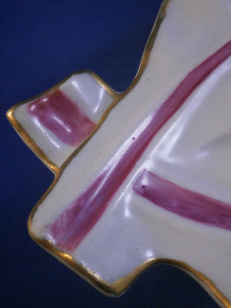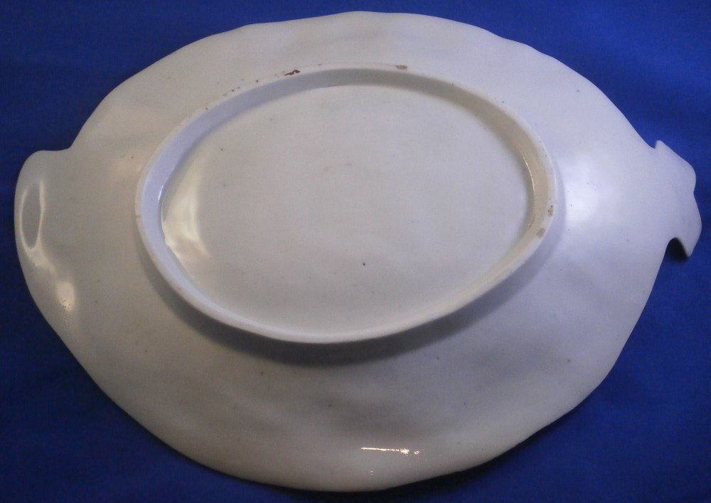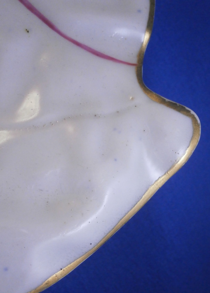 This is a rare leaf dish in the form of two overlapping cabbage leaves made by Worcester in around 1765. It has a really nicel shape to it with the veins of the cabbage leaves showing in releif and the main center stem having been painted in pink. Gold trim to the edge. The center has a superb bird scene to it including three birds of paradise in a nice surrounding of plants and rocks. The rest of the dish has six butterfly / moths / bugs scattered all around. A truly superb piece! The plate is in superb condition with some minor wear to one spot of gilding and the largest bird in the scene with some scratches to the medium one though that all this is hard to spot when on display. Visible in the pictures since they are rather magnified. Some minor firing imperfections in the form of tiny black spots, etc. normal to these early wares. This example is unmarked which is not unusual for these early pieces but definitely made by them during this period! The piece is 2 inches tall at the handle/ stems with the dish being about 1.25 inches tall, 7.5 inches wide and 10.125 inches long. Please email me for more information or other pictures.