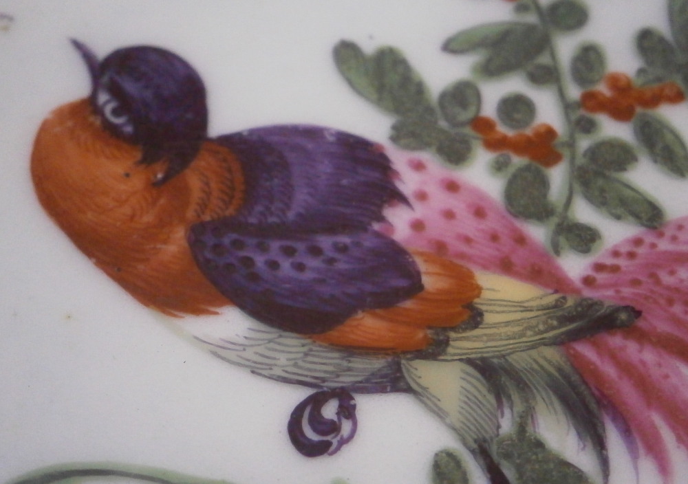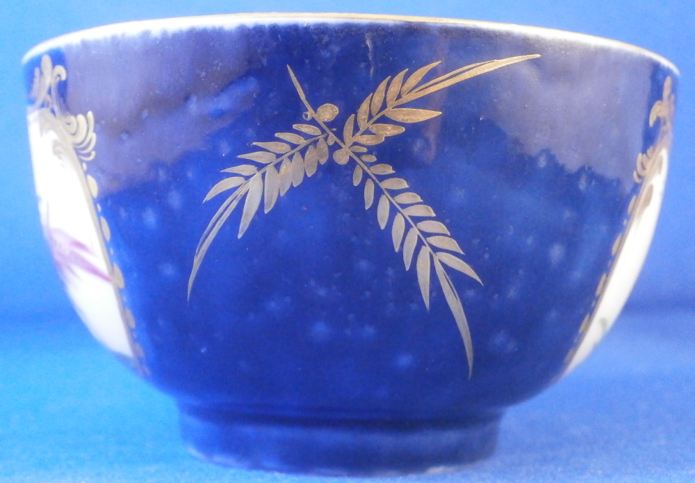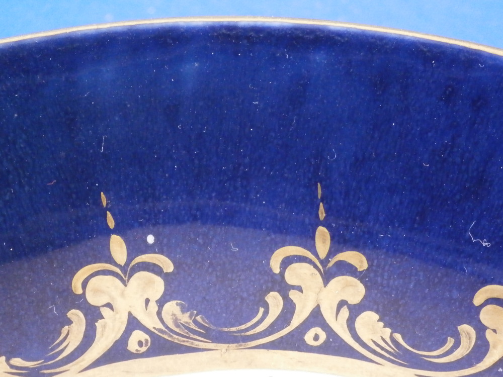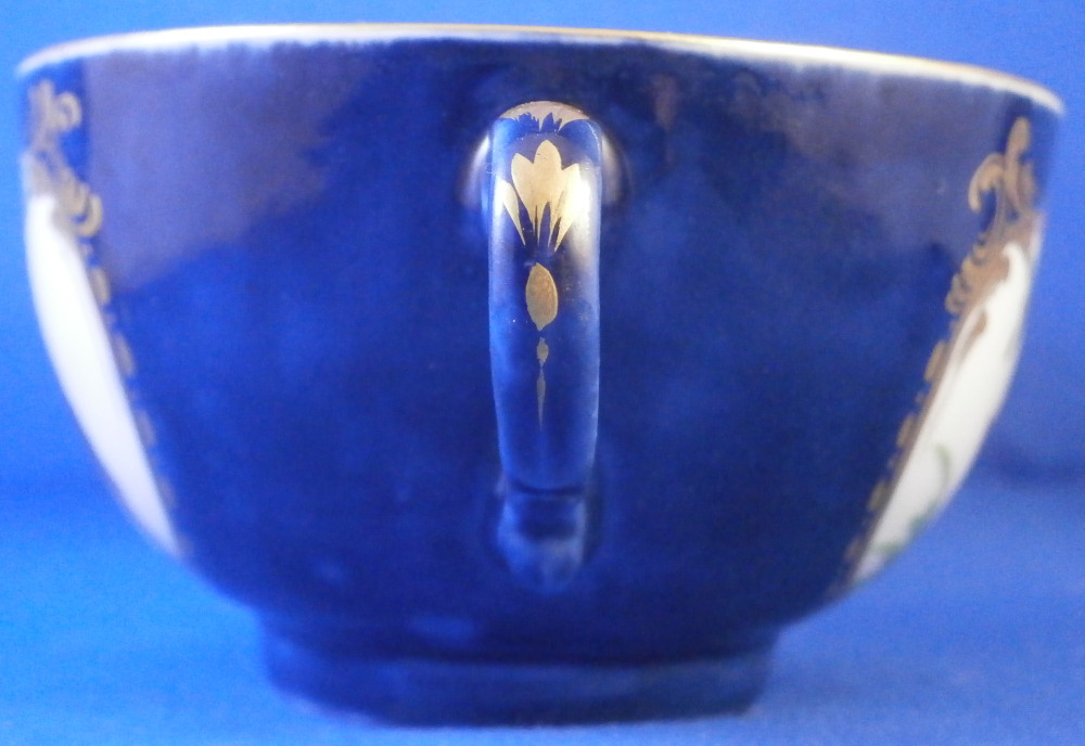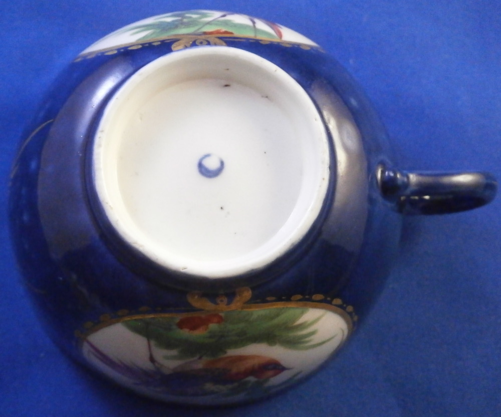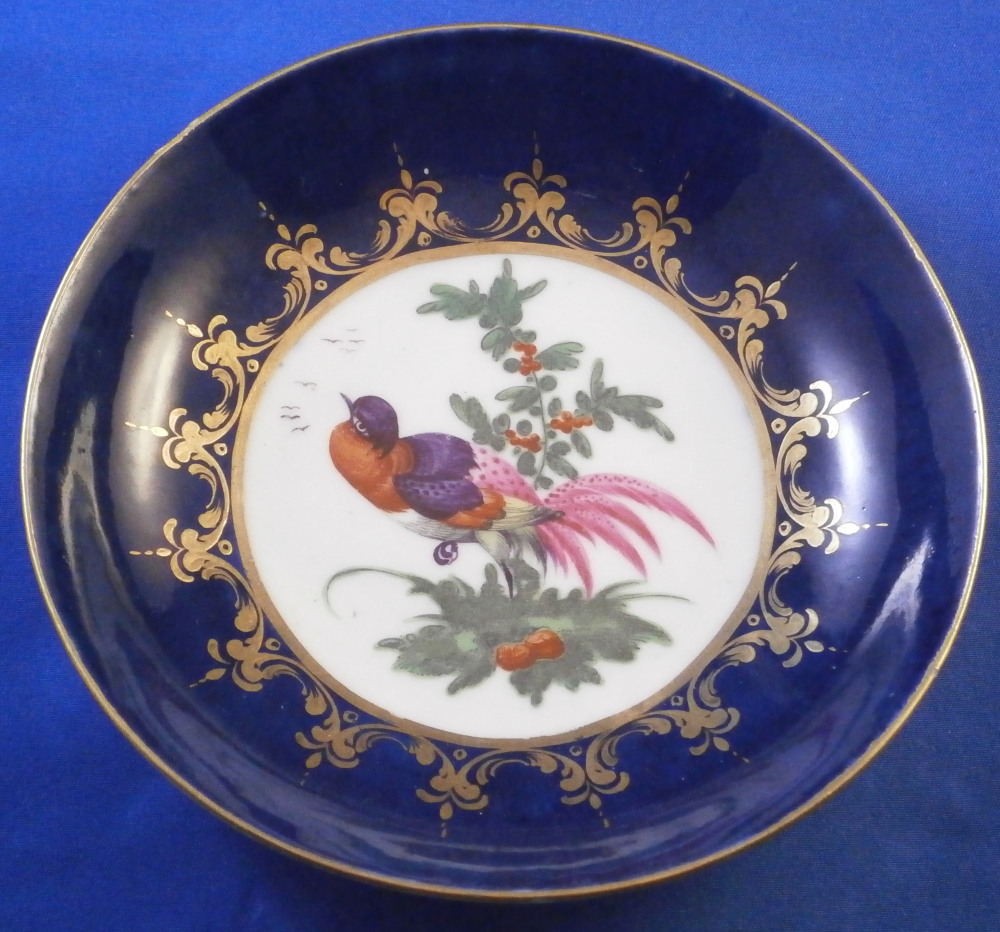 This is a superb early cup and saucer made by Worcester in the 18th century. A truly great looking combination of the blue ground color, some nice gilding as well as a hand painted scene of an exotic bird sitting on a branch in the center of the saucer and a same style scene on each side of the cup. Each scene is surrounded by a nice gold trim with gilding along the edges of the set and some gold highlights to the handle of the cup. The cup and saucer are both in superb condition with the saucer having a small rough area to the very edge. it is gilded over and probably from when it was made. Invisible when on display or even from closeup but I am showing it in the pictures. The blue ground is a bit uneven in circular spots mainly on the opposite side of the handle on the cup as shown. It was made this way. All very minor and it displays superbly. The cup is 1.875 inches tall and has a diameter of 3.25 inches. The saucer is about 1.125 inches tall and has a diameter of 5.125 inches. Both are marked with the under glaze blue crescent mark as shown. Please email me for more information or other pictures.