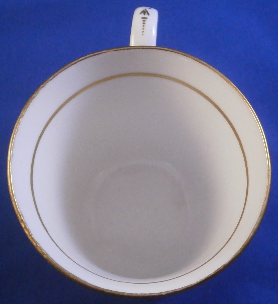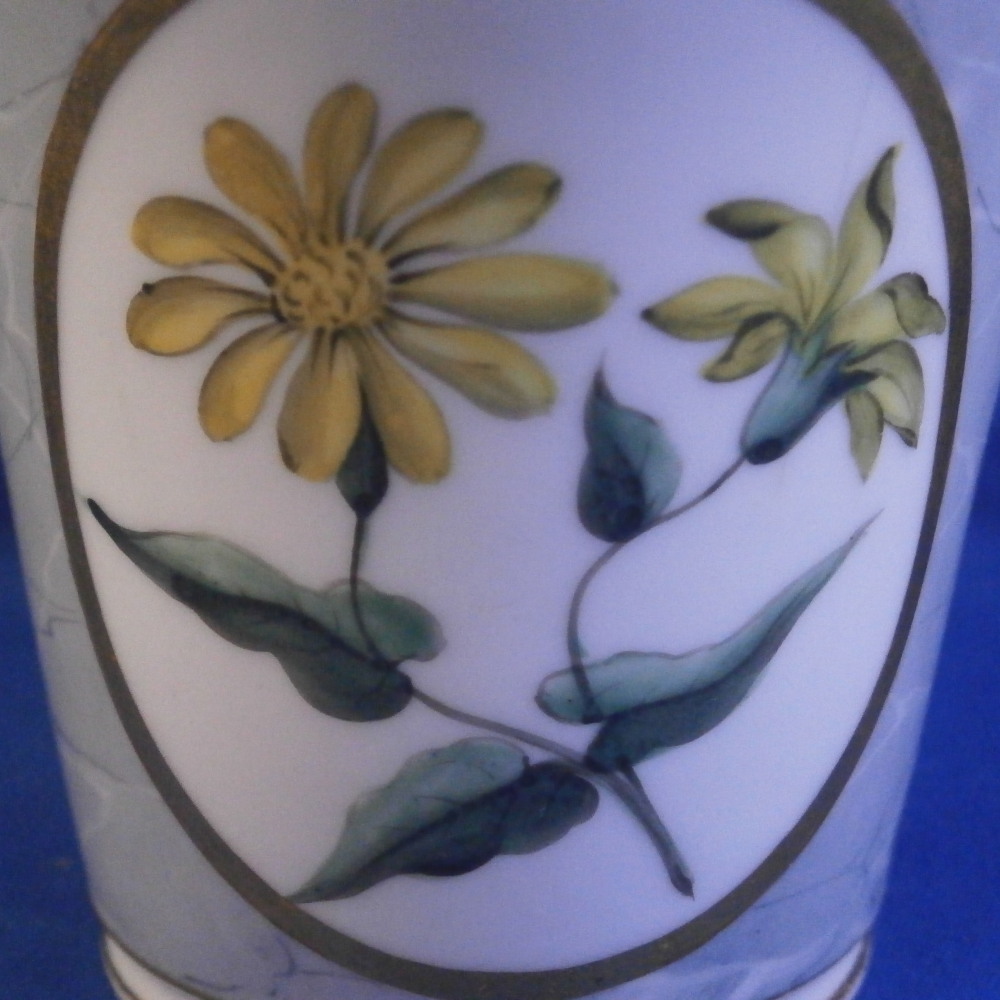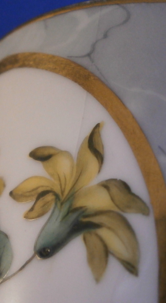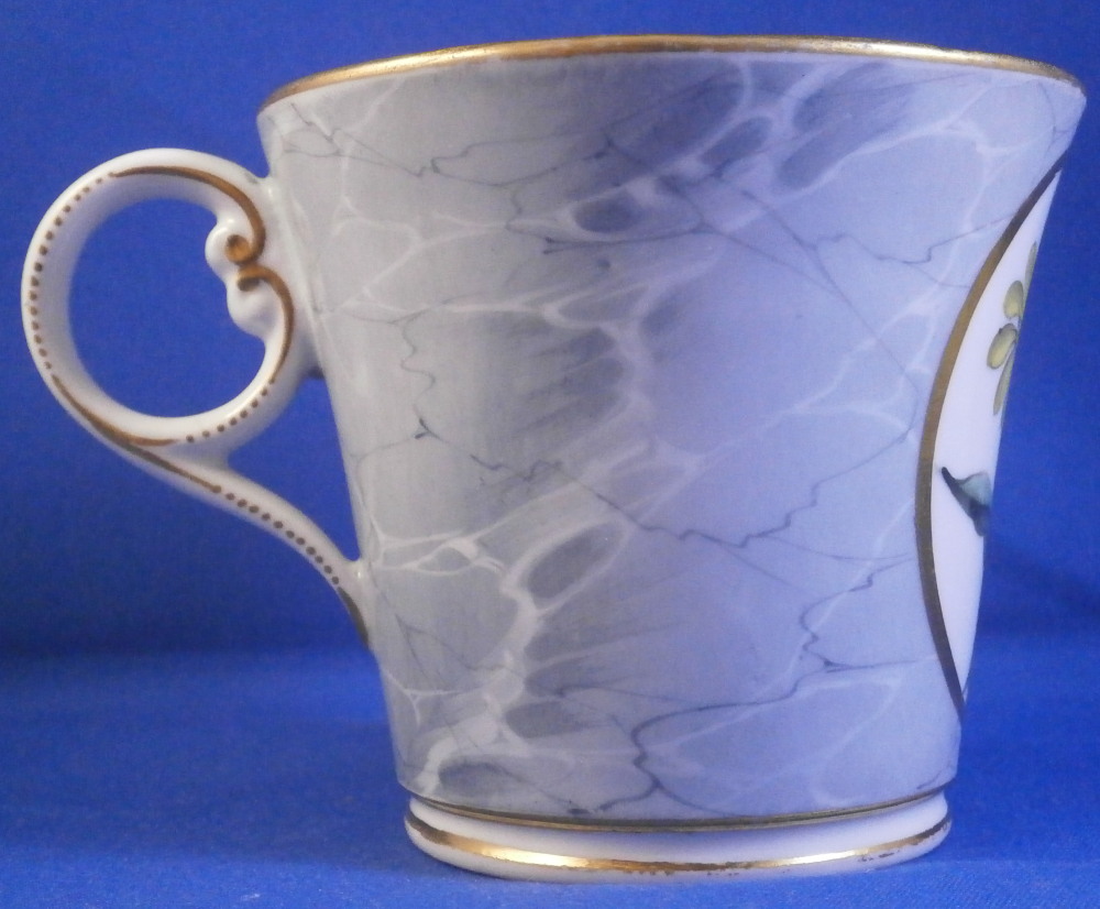 This is a superb cup and saucer made by Chamberlains Worcester in the early 19th century, around 1820. The set is decorated with a truly great looking combination. Each piece has a hand painted botanical specimen of a flower - one yellow and one blue. These cartouches are surrounded by a gold frame with the rest of the set having a superb marble type ground to them. Gold ring to the inside of the cup and a simple gold trim to the edges. Kidney shaped ring handle to the cup with some gilt highlights to it. The saucer is in great condition with the most minor wear to the gold trim on the edge and a black firing spot to the outside edge. The cup displays perfectly but has a tight hairline to the front as shown. The marbled ground easily makes up for this flaw as the set looks amazing! The cup is 2.625 inches tall and has a diameter of 3 inches. The saucer is 1.25 inches tall and has a diameter of 5.5 inches. Neither piece is marked which is not unusual at all. Please email me for more information or other pictures.