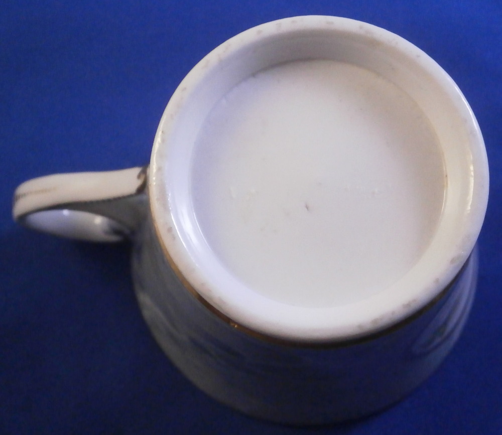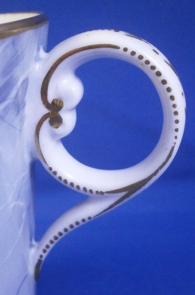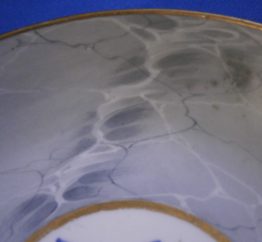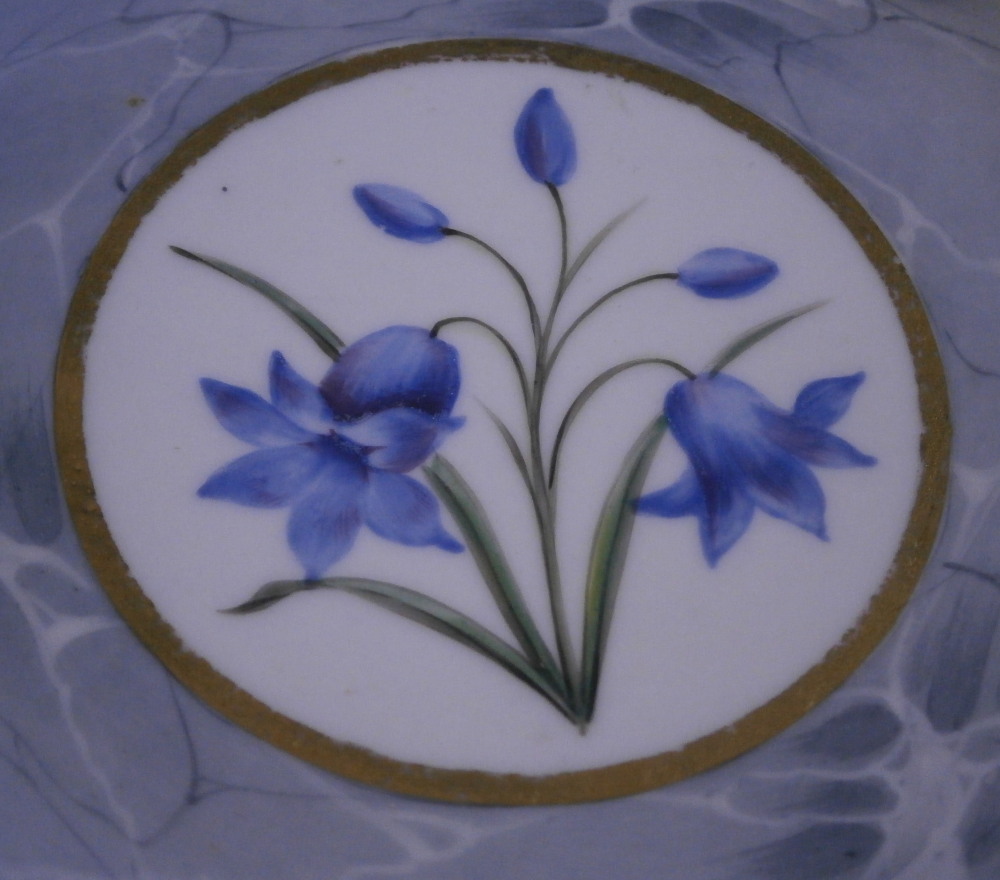This is a superb cup and saucer made by Chamberlains Worcester in the early 19th century, around 1820. The set is decorated with a truly great looking combination. Each piece has a hand painted botanical specimen of a flower - one yellow and one blue. These cartouches are surrounded by a gold frame with the rest of the set having a superb marble type ground to them. Gold ring to the inside of the cup and a simple gold trim to the edges. Kidney shaped ring handle to the cup with some gilt highlights to it. The saucer is in great condition with the most minor wear to the gold trim on the edge and a black firing spot to the outside edge. The cup displays perfectly but has a tight hairline to the front as shown. The marbled ground easily makes up for this flaw as the set looks amazing! The cup is 2.625 inches tall and has a diameter of 3 inches. The saucer is 1.25 inches tall and has a diameter of 5.5 inches. Neither piece is marked which is not unusual at all. Please email me for more information or other pictures.