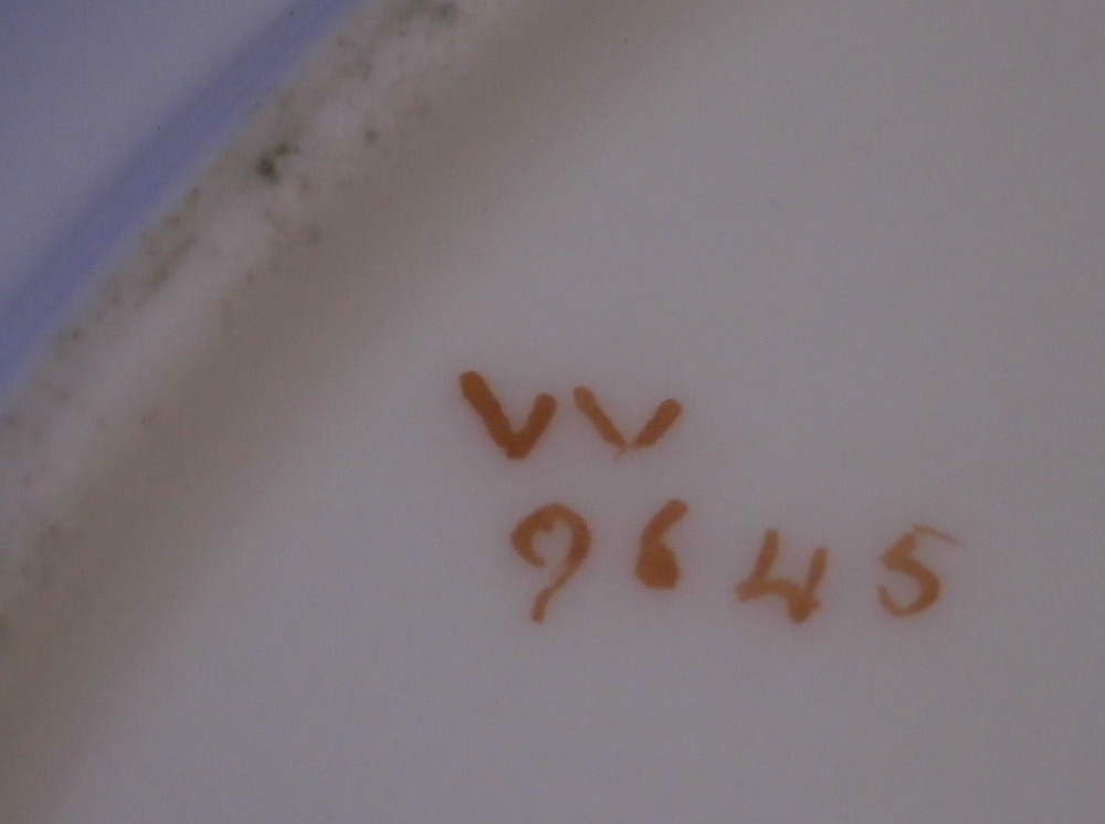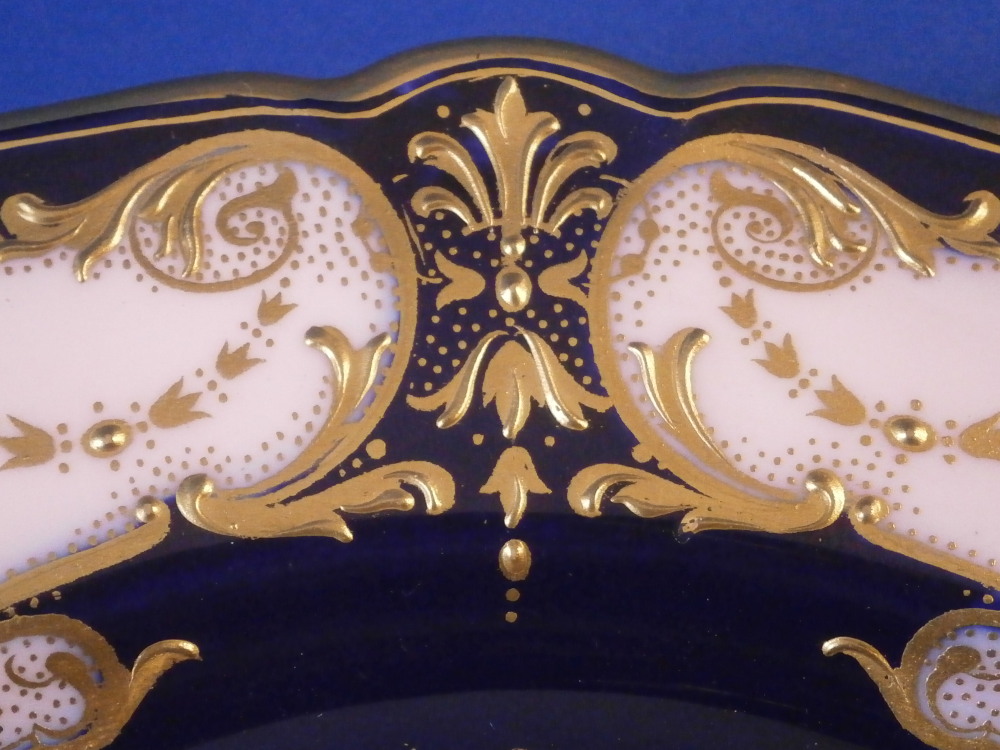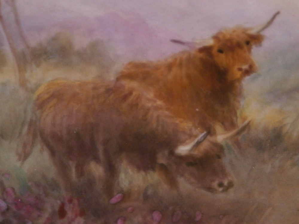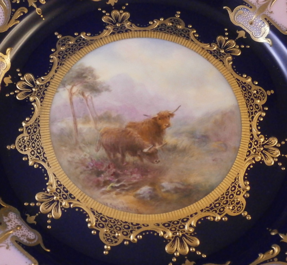 This is an amazing plate made by Worcester around 1931 I believe if I read the date code correctly. The plate is superbly hand painted with a Highland cattle scene in the center including two bulls/cows in a superb landscape surrounding. The scene is signed H. Stinton for Harry Stinton who worked at Worcester from 1896 until 1963. He is probably the most famous of the Stinton family and his Highland cattle scenes are highly sought after even today. The scene is surrounded by a very fancy gold trim on cobalt blue ground. Some nice raised details to the gilding. The rim has cartouches of pink ground with gold designs that are separated by the blue ground with more gilding. Gold trim to the nicely shaped edge. All in all a really fancy and superb plate with an amazing scene! The plate is in perfect condition which is always a nice bonus! It is marked with the puce circular Worcester mark with the two interlocking rings over the made in England standing for 1931. There are some other markings to the back as well all shown in the pictures. It is 1 inch tall and 8.875 inches in diameter. Please email me for more information or other pictures.