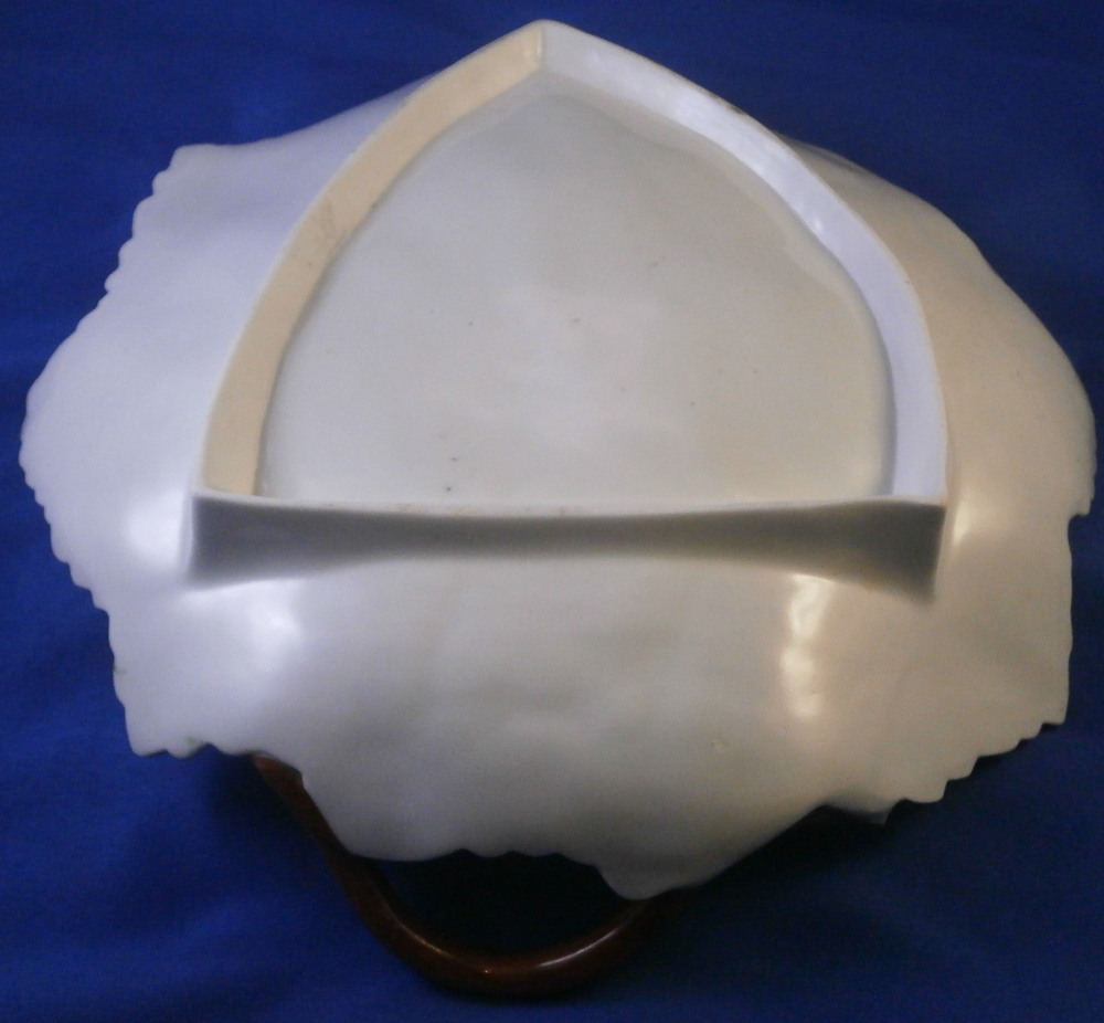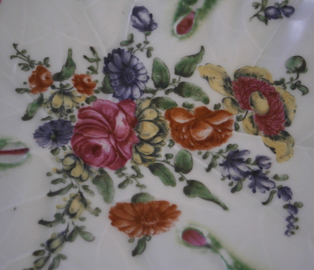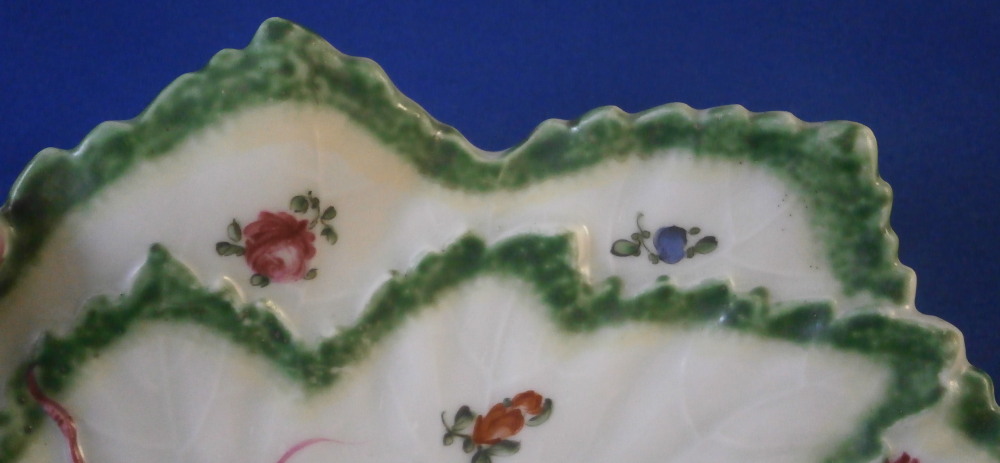 This is a really nice leaf dish in the form of two overlapping vine leaves made by Worcester in around 1765. It is hand painted superbly like a true leaf with the veins in relief and the edges are colored in green and a light yellow color. Nice branch handle. The center has a large hand painted floral arrangement as well as some single flowers all around. The dish is in superb condition with just some wear to the branch handle which is to be expected after 250 years. The flowers in the center have no stacking wear or use marks which is incredible. No chips or repairs either just a weird glaze flaw to the udnerside as shown. Not sure what that is from but it is invisible when on display. Just a really superb example! The dish is unmarked which is not unusual for these early pieces but definitely made by them during this period! It is 2.5 inches tall at the handle with the dish being about 1.875 inches tall, 8 inches wide and 9.625 inches long. A nice sized example! Please email me for more information or other pictures.