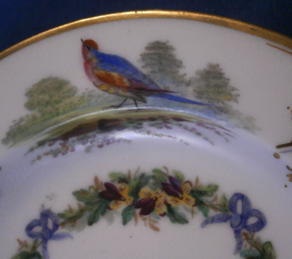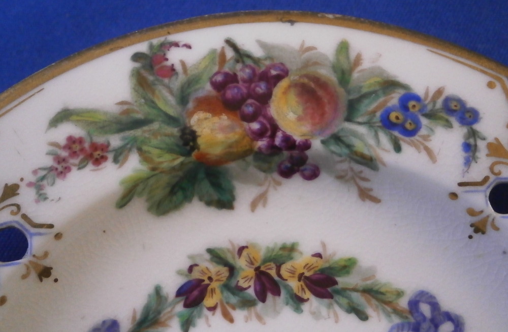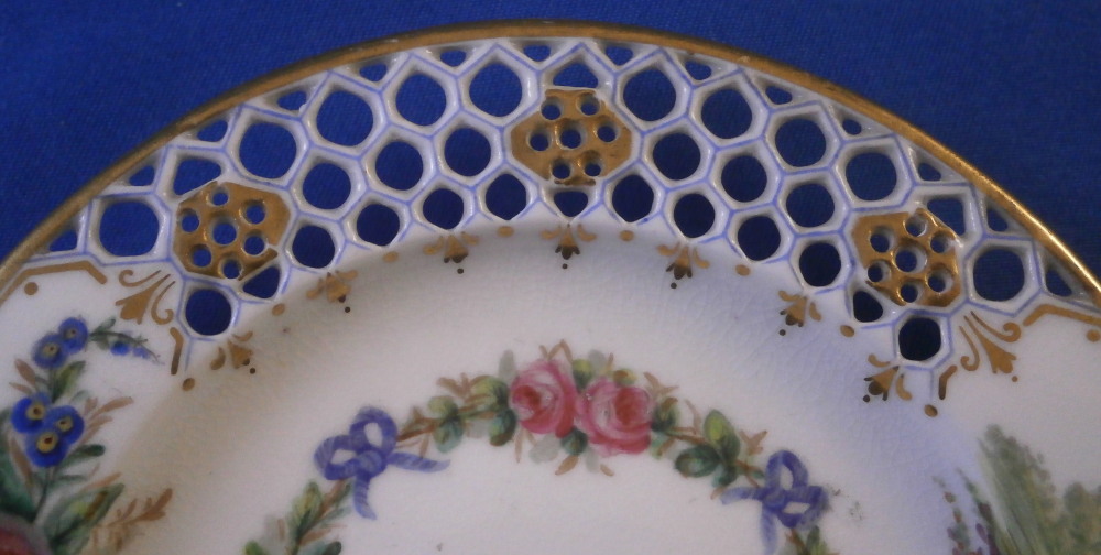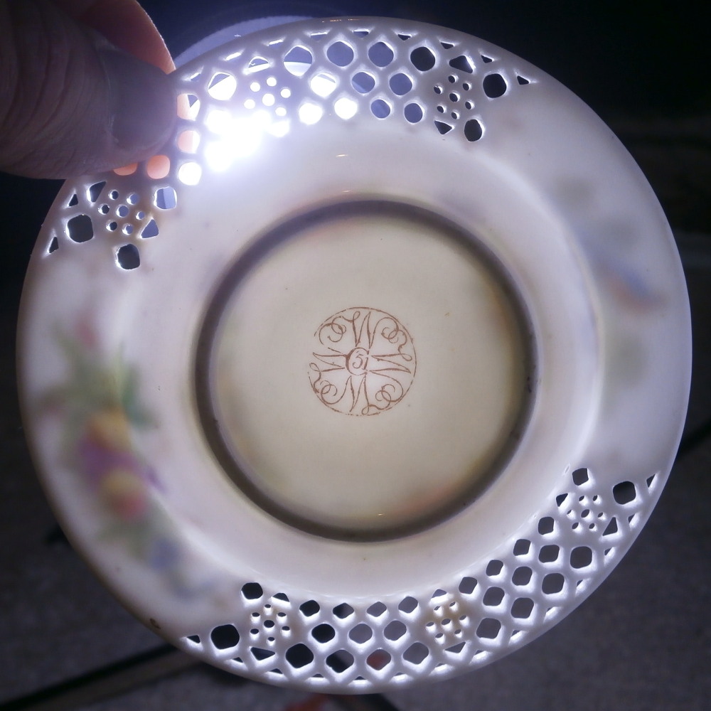 This is a superb reticulated saucer made by Worcester in the mid 19th century. I am unsure as to the exact date as it neither has a crown above it nor any date code or impressed marks. So if anyone out there has a clue as to why a quick note would be appreciated. It might be a very early George Owen piece who off course is quite famous for these types of reticulated / pierced pieces. The saucer has two reticulated sections along the rim with a superb bird scene and a superb fruit scene in between these sections. The center has a floral wreath with bows to it and there is some gold trim along the rim and going into the well of the dish. This blue lines along the reticulated sections. A very delicate design and the hand painting is top notch! I have never come across this nice a design on one of these saucers! The saucer is in great condition with a minor touch of wear to the gilding along the edge and some fine crazing in areas of the white parts. It displays perfectly - jsut looking for its cup now :) The saucer is just over 0.5 inches tall and has a diameter of 4.125 inches in diameter. Quite tiny and delicate! The saucer is marked with the circular Worcester mark with the number 51 inside but no crown or date code at all. Please email me for more information or other pictures.