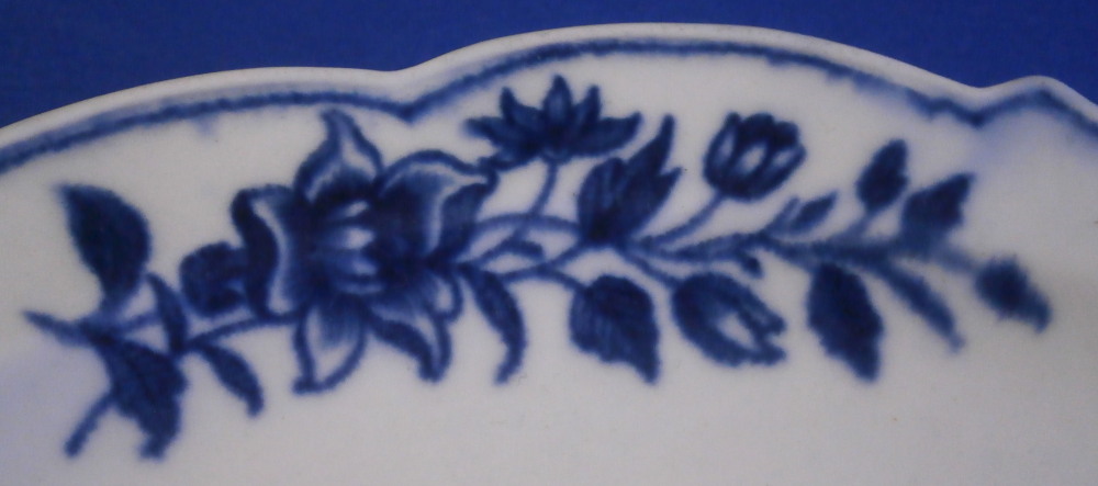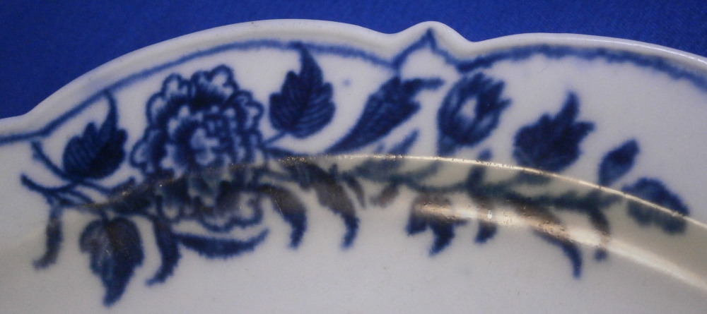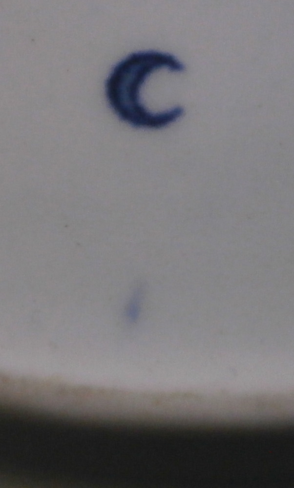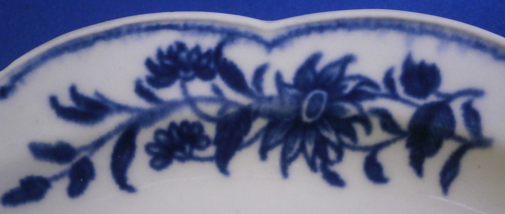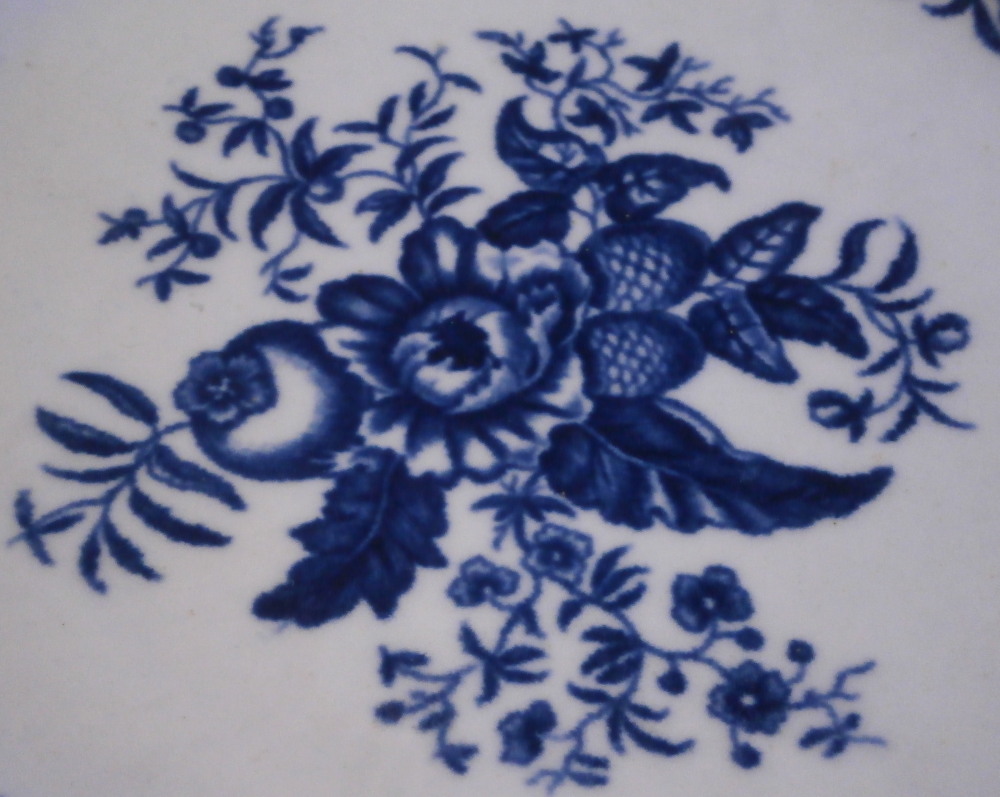 This is a dish that would have been an under plate for the strawberry / cress strainer dish I also have on the site. It was made by Worcester around 1770. The plate is decorated with a blue and white pattern called the pine cone pattern with a nice rim shape that has a blue line going along it plus five floral arrangements along the rim. The center has a large design including what looks to be pine cones and some flowers and leaves. The piece is in great condition with just some use marks to the clear glaze from where the straier would sit sort of like stacking wear. Only shows when held at the right angle to a light source. It is marked underneath with the under glaze blue crescent mark as shown. The piece is 0.875 inches tall and 8.25 inches in diameter. Please email me for more information or other pictures.