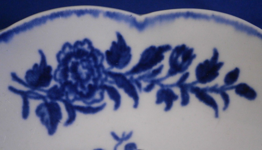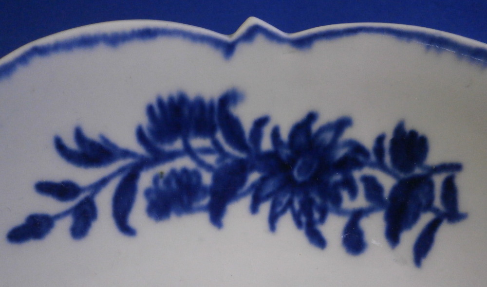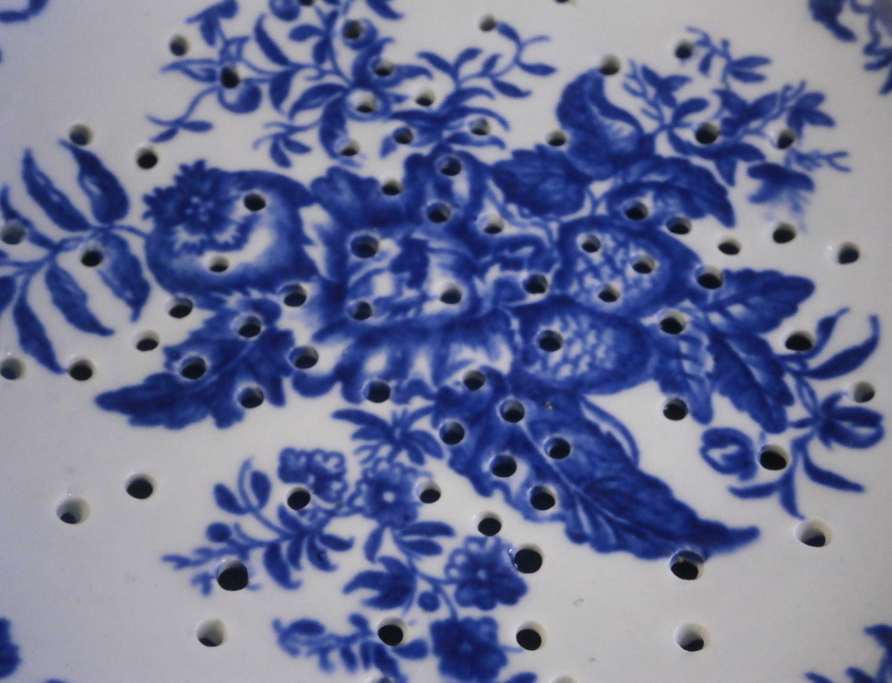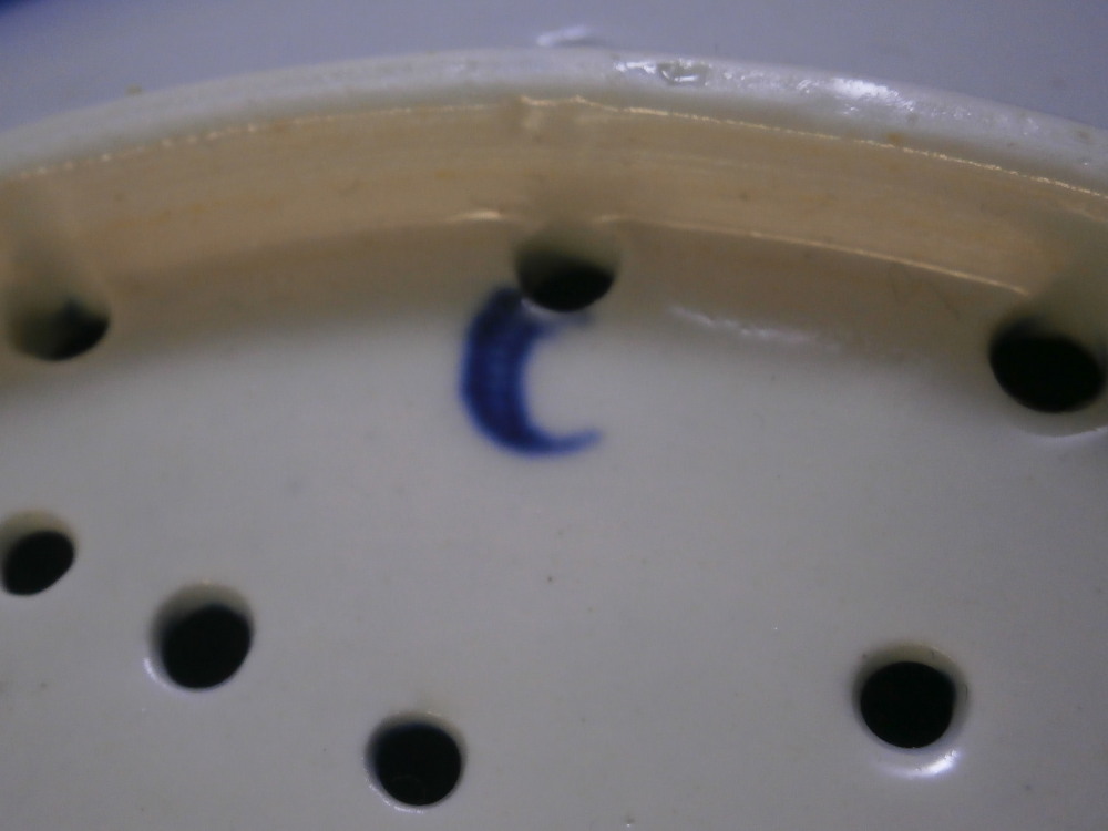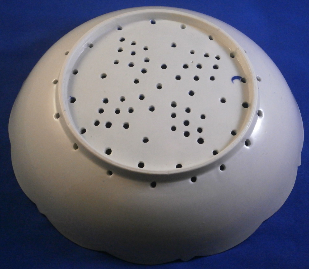 This is a strainer dish / bowl that would have been used for strawberry / cress made by Worcester around 1770. I also ahve the under plate for this dish up on the site. The strainer is decorated with a blue and white pattern called the pine cone pattern with a nice rim shape that has a blue line going along it plus five floral arrangements along the rim. The center has a large design including what looks to be pine cones and some flowers and leaves. The piece is in great condition with a manufacturing flaw / paste impurity that burned away fduring the firing process as shown. The piece is marked underneath with the under glaze blue crescent mark as shown. It is 1.875 inches tall and 7.75 inches in diameter. Please email me for more information or other pictures.