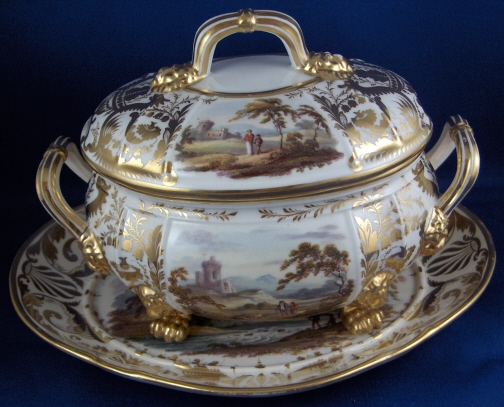 Derby Porcelain Derby porcelain was started by William Duesbury around 1756. He did very well and had enough capital to buy the Chelsea works around 1770. Moving right along, he bought the Bow factory in 1776. Even though he was the private owner of Derby, he was allowed to use the crown over his name by King George the third around 1775. The factory was taken over by his son and after his death, by Michael Kean. He in turn sold it to Robert Bloor who continued production until about 1847 after which the company was taken over by some of the workers and eventually merged with the Royal Crown Derby Company in 1935 and is still in existence today under the name of Royal Crown Derby China Company. English Porcelain porcelain of Derby porcelain made by Derby Porzellan aus Derby Porzellan England Englisches porcelaine de Derby porcelana de Derby porcellane di Derby porcelana en Derby porcelaine par Derby |