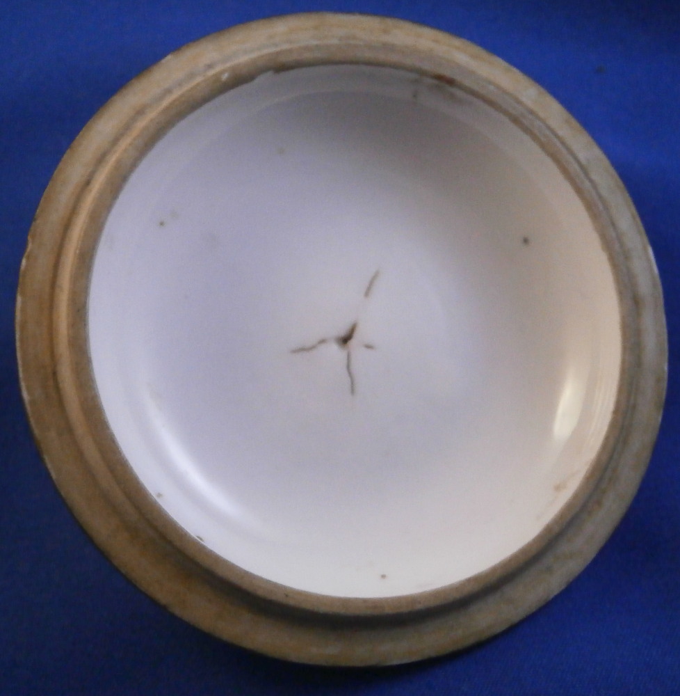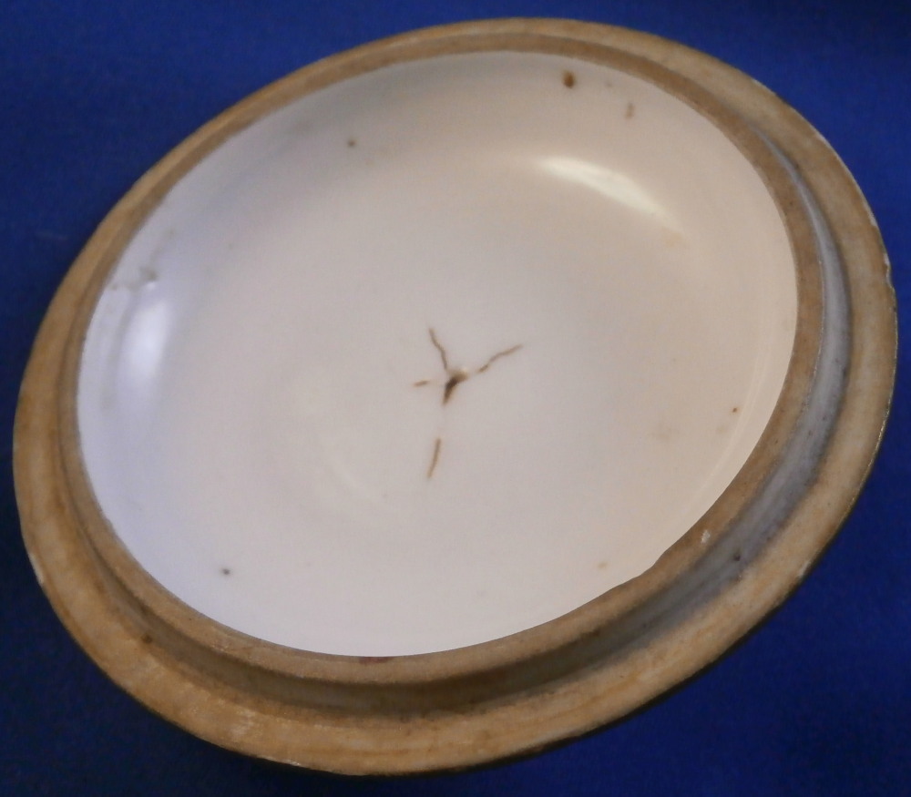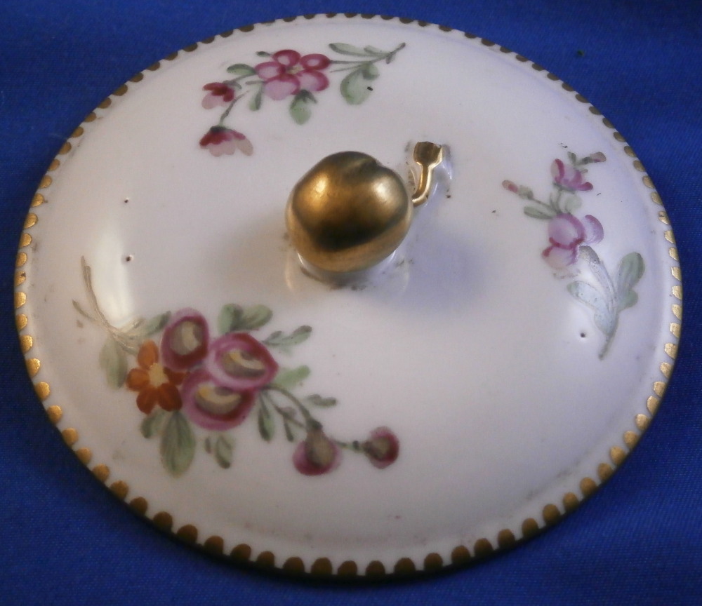 This is a lonely lid probably for a sugar pot or a large ointment pot or such item and was made in France in the 18th century. The design suggests a maker like Locre but not being marked it is hard to be sure. The piece is hand painted with a floral arrangement to one side and two alrger single flowers filling in the rest of the piece. Nice gold trim to the edge and a fruit finial that is gilded. It's a ncie early peice and if you have one missing this would be a rare occasion to make your piece complete again. The lid is in superb condition with the most minor of wear and a few small firing flaws plus a larger firing crack on the udnersie center only as shown but as nice as they come for it's age and style. Unmarked which is very normal when you just have a lid. The piece is 0.75 inches tall (from gold edge to top of finial with an outer diameter of 3.125 inches. the ring on the underside that sits inside the main body is about 0.125 inches tall and the outer diameter of the underside ring which fits inside the main body is 2.75 inches so the inside diameter ofw whatever item you want to use it for needs to be at least that size or a touch bigger! Please email me for more information or other pictures.