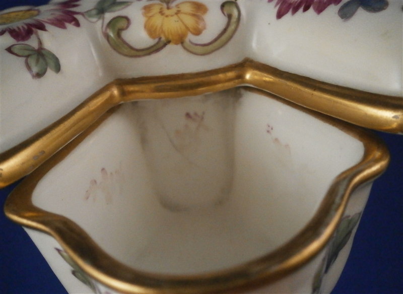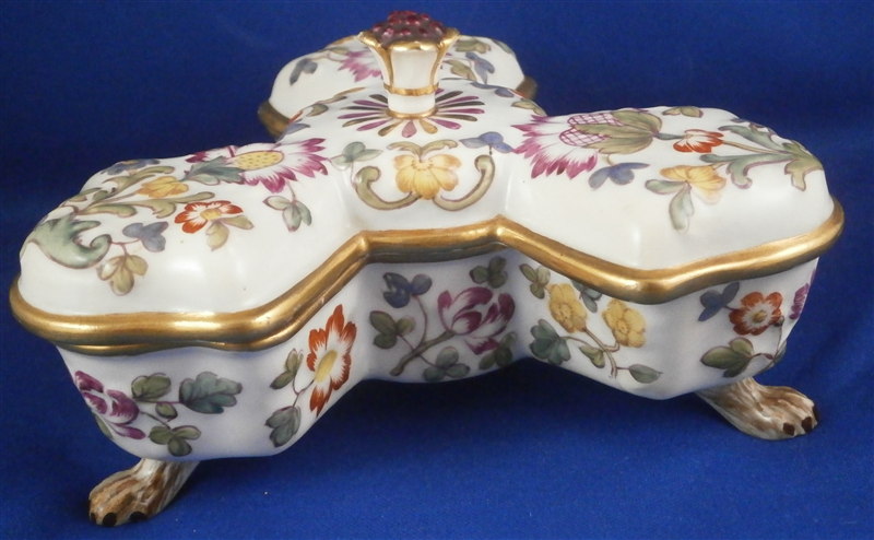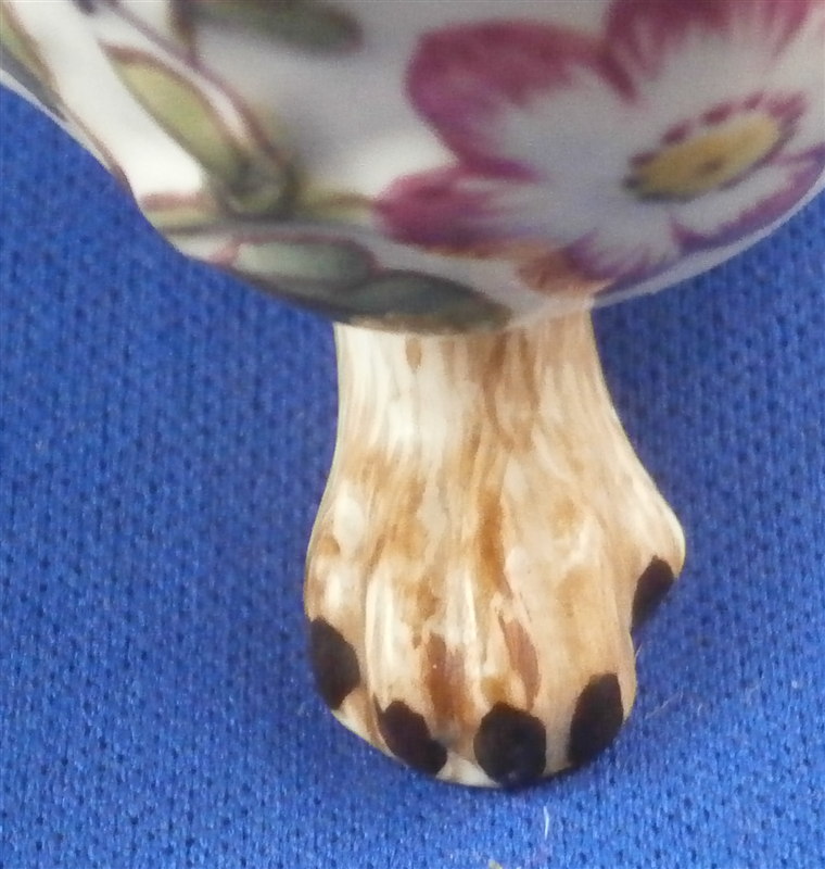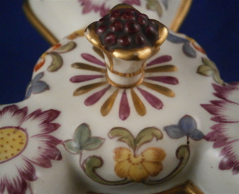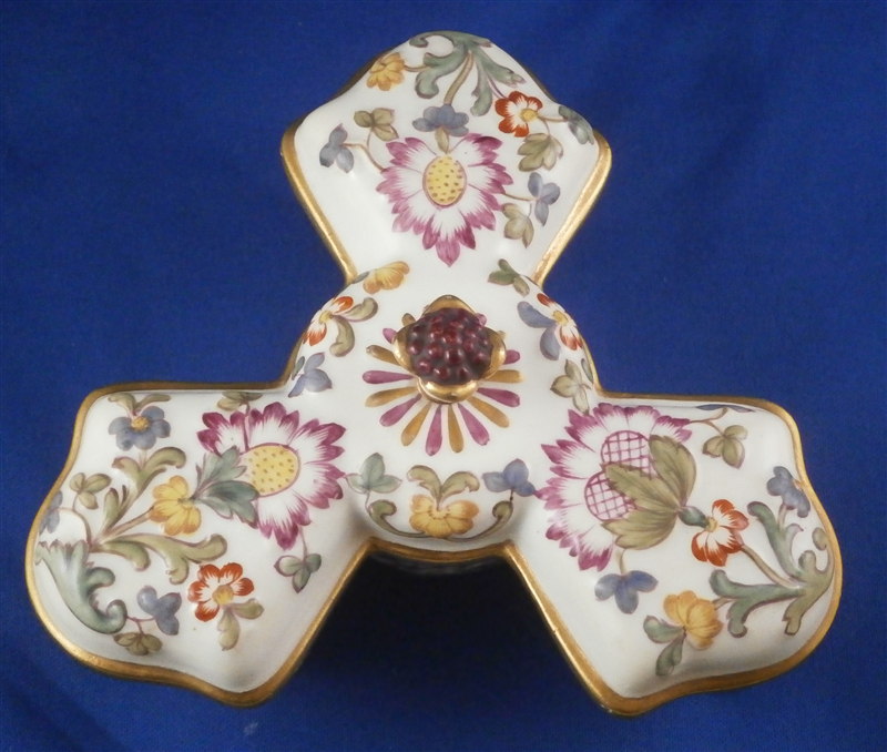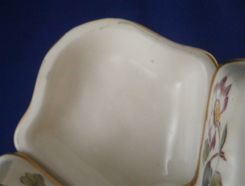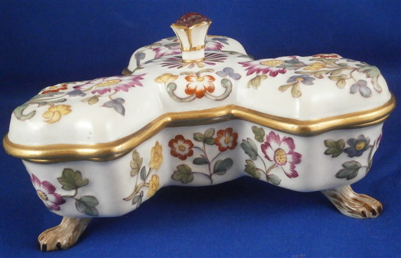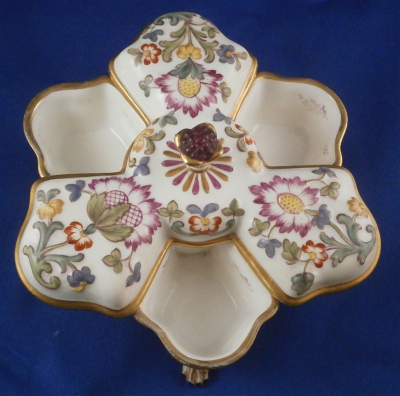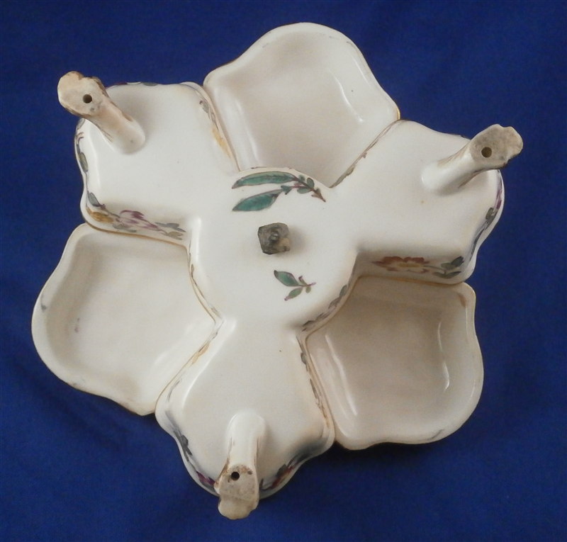 This is a fantastic amazing little triple spice box dish with its cover most likely made made by Doccia / Ginori and definitely in the 18th century. The piece is made of soft paste porcelain in two parts - the bottom is made up of three compartments sitting on three claw feet with a central cylinder into which a smaller cylinder of the upper part fits. The upper part also consists of three parts that fit perfectly over the bottom compartments to cover them but can be rotated by means of a metal pin to open up. The box is decorated with a relief design of flowers highlighted in bright colors. The main flower in puce (possibly a thistle which was popular back then) with smaller red, blue and yellow flowers and green foliage. The central knob on the lid might be a cauliflower or something along those lines. The colors just pop much more so than the pictures show and it scream Italian to me because they loved these colors and no other maker really ever came close. I first thought maybe early Bow but that doesn't fit. The box is in superb condition with two glaze crack to the udnerside of one lid compartment and a meaningly hairline on the cylinder part of one compartment on the bottom as shown. There used to be tiny puce flowers all along the sides of the bottom compartments but they are mostly worn away from years of use. The metal pin is oxidized but that is to be expected. Two of the claw feet have had work done to them but it was done perfectly and a firing imperfection was painted over with a green leaf on the underside base as shown. The base is completely glazed. It displays perfectly and works perfectly as well which is amazing. The translucency is very nice as shown and the glaze has some very very fine crazing or bubbling to it mostly on the udnerside or where the glaze has pooled a bit. This is a very rare form which was made by the early French makers like St. Cloud and Rouen - a faience maker but I also found one made by Meissen and a Chinese Export piece but it is a very rare shape to find and only very few have survived. I cannot find another one like it. The piece is not marked which is fairly normal for early porcelain by many makers. It is 2.875 inches tall (including the knobin the center) and 5.375 inches wide. One of the most fun pieces I ahve ever come across or owned! Please email me for more information or other pictures.