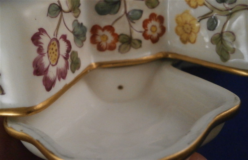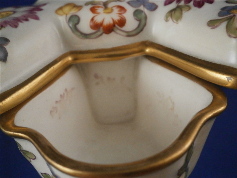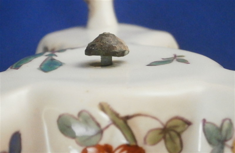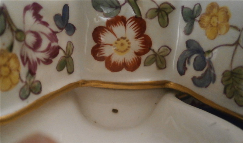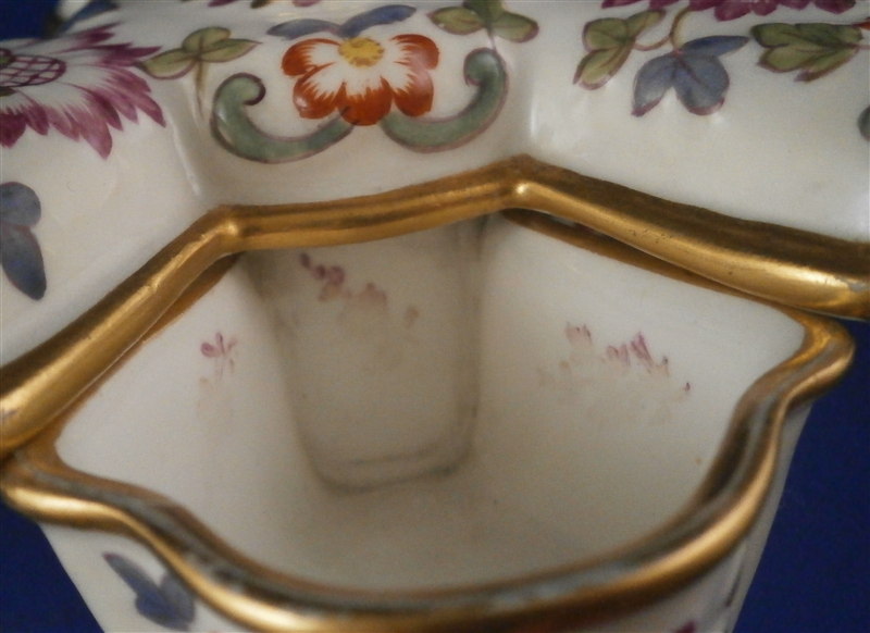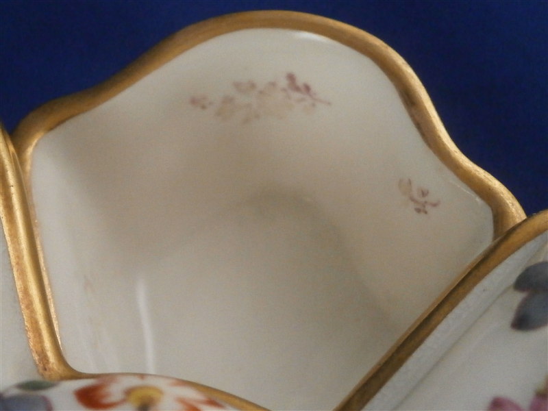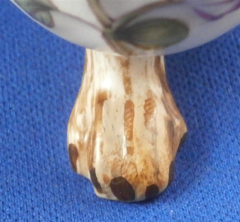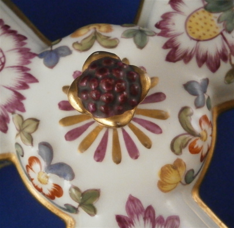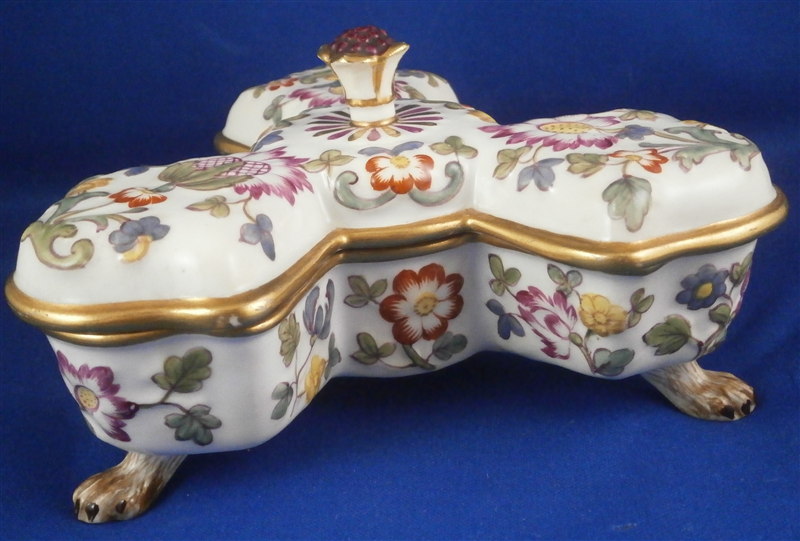This is a fantastic amazing little triple spice box dish with its cover most likely made made by Doccia / Ginori and definitely in the 18th century. The piece is made of soft paste porcelain in two parts - the bottom is made up of three compartments sitting on three claw feet with a central cylinder into which a smaller cylinder of the upper part fits. The upper part also consists of three parts that fit perfectly over the bottom compartments to cover them but can be rotated by means of a metal pin to open up. The box is decorated with a relief design of flowers highlighted in bright colors. The main flower in puce (possibly a thistle which was popular back then) with smaller red, blue and yellow flowers and green foliage. The central knob on the lid might be a cauliflower or something along those lines. The colors just pop much more so than the pictures show and it scream Italian to me because they loved these colors and no other maker really ever came close. I first thought maybe early Bow but that doesn't fit. The box is in superb condition with two glaze crack to the udnerside of one lid compartment and a meaningly hairline on the cylinder part of one compartment on the bottom as shown. There used to be tiny puce flowers all along the sides of the bottom compartments but they are mostly worn away from years of use. The metal pin is oxidized but that is to be expected. Two of the claw feet have had work done to them but it was done perfectly and a firing imperfection was painted over with a green leaf on the underside base as shown. The base is completely glazed. It displays perfectly and works perfectly as well which is amazing. The translucency is very nice as shown and the glaze has some very very fine crazing or bubbling to it mostly on the udnerside or where the glaze has pooled a bit. This is a very rare form which was made by the early French makers like St. Cloud and Rouen - a faience maker but I also found one made by Meissen and a Chinese Export piece but it is a very rare shape to find and only very few have survived. I cannot find another one like it. The piece is not marked which is fairly normal for early porcelain by many makers. It is 2.875 inches tall (including the knobin the center) and 5.375 inches wide. One of the most fun pieces I ahve ever come across or owned! Please email me for more information or other pictures.
