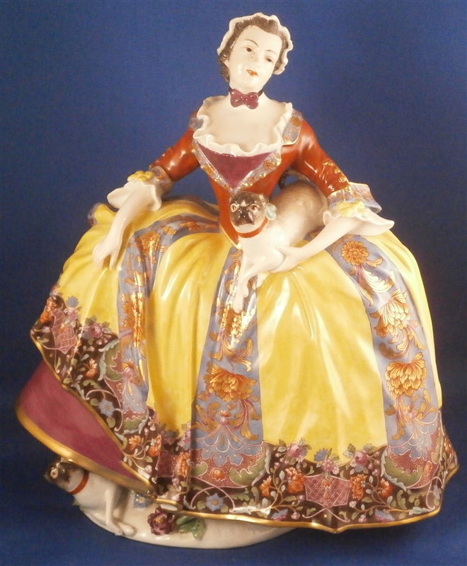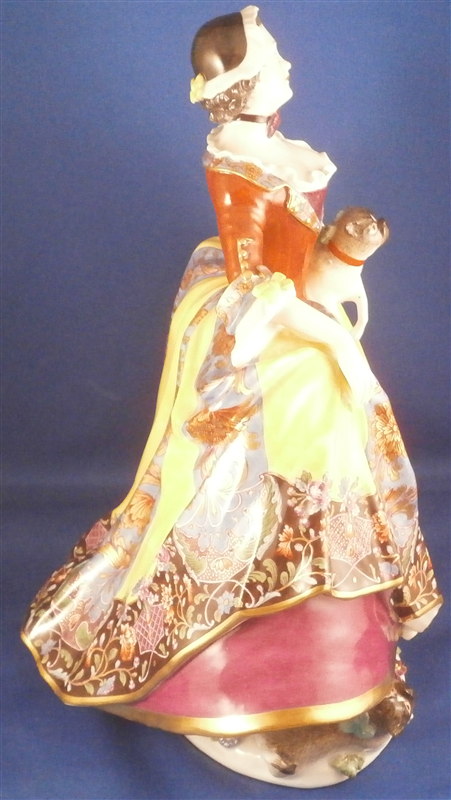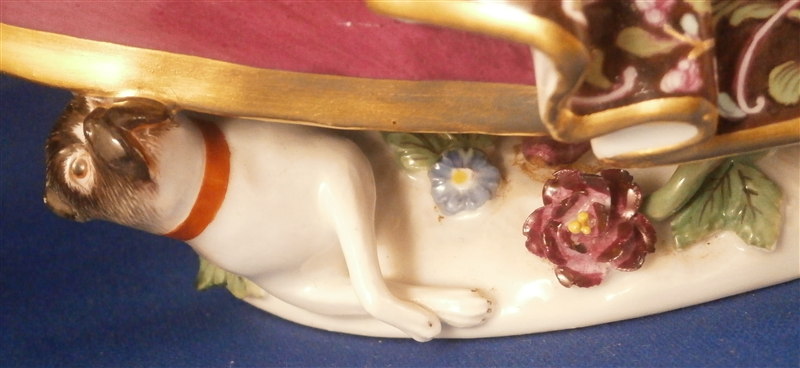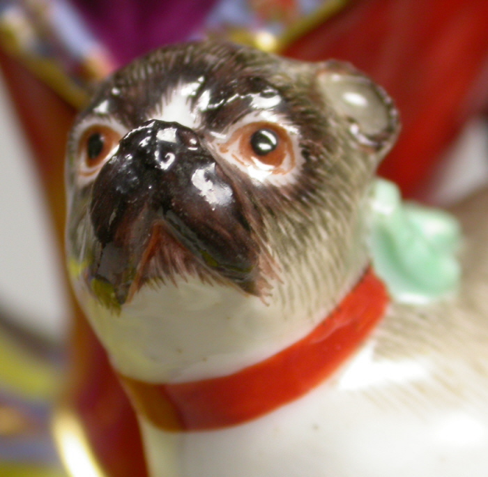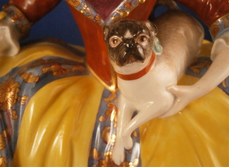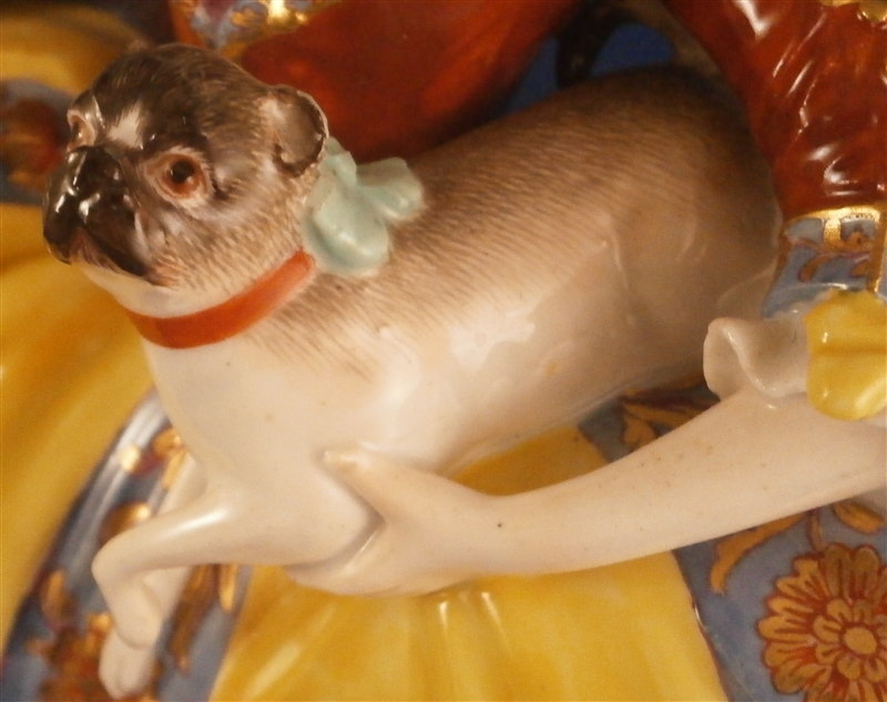 This is an amazing and rare figurine made by Meissen most likely in the mid 1740's. One of my favorite pieces ever! She is handpainted with the nicest decoration I have ever seen and this style of decoration is extremely rare and stunning! The figure is of a lady of the Order of the Pug ( Mopsorden ) modeled by Kaendler. She is wearing a large skirt typical of the fashion of the times, a bonnet on her head and she is holding a pug under her left arm while another pug is looking up at her from lying on the base under her skirt. This piece is so stunning one needs nothing else in the cabinet with a piece like this in it. Really an amazing figurine and in great condition with supposedly one minor restoration though I cannot find it. Some very minor chips to the bottom edge of the skirt though most are glazed over so from the making and some firing/hairlines on the underside that are minor and of no importance since they never make it to the edge. A few black firing spots underneath also common to early Meissen. The bottom base is unglazed which is common on early Meissen and any mark is long gone because of it - also pretty common! There is one mark on the edge of her skirt some people think is a bossierer's mark though it is not very clear to me. Might have even been ground flat after the firing. The figure is quite heavy and 9.375 inches tall, 8.25 inches wide and 5.25 inches deep. Please email me for more information or other pictures.