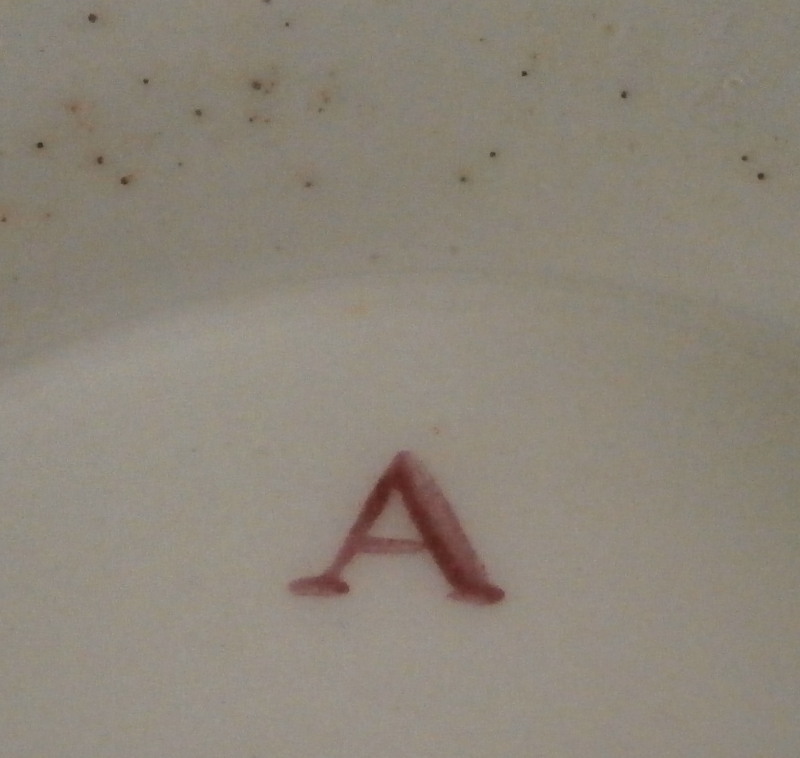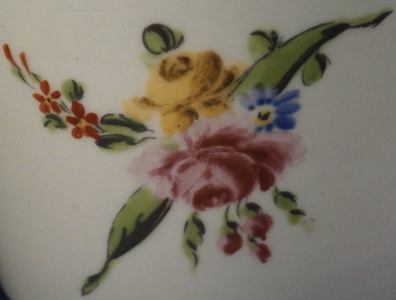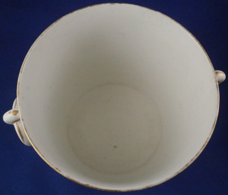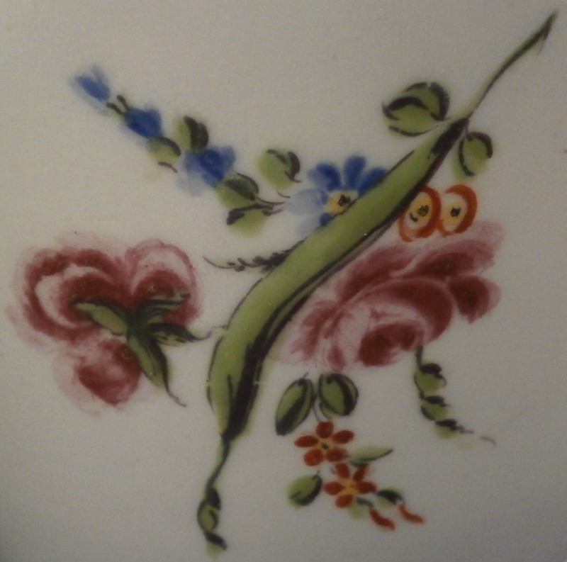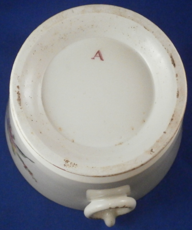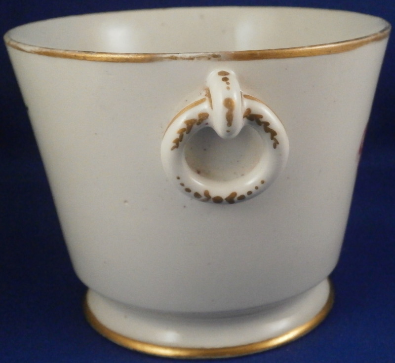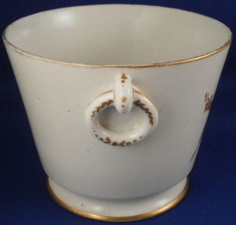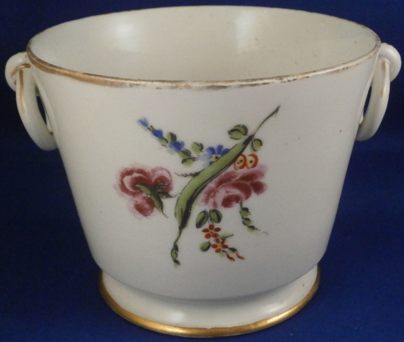 This is a rare little cache pot made by Alcora of Spain in the late 18th century. The full name of the maker is Real Fábrica del Conde de Aranda ( l'Alcora ) and it is really ahrd to find a piece by this maker - it is the first I have owned. Plates and cups are the usual ones you come across in museums and often damaged but I could only find one other of these little flower pots in a museum in Spain. The pot has a nice shape to it with a ring handle to either sie and a floral arrangement to the front and back with some gold trim to the edges and handles. This piece would ahve belonged to the German flower series of dishes inspired by the engravings of Weidemann. The design was introduced by Vincente Alvaro after a stay in Paris which explains why it looks so French in style. The porcelain is actually soft paste in nature which was introduced by Pierre Cloosermens in 1787. So this piece dates after 1787. The quality of the porcelain is very nice and the hand painted decoration is quite nice as well. The pot is marked with their typical A mark in puce with one side of the A thicker than the other. The piece is in superb condition with some wear to the gilding. The pot is 3.5 inches tall and 4.375 inches in diameter. Please email me for more information or other pictures.